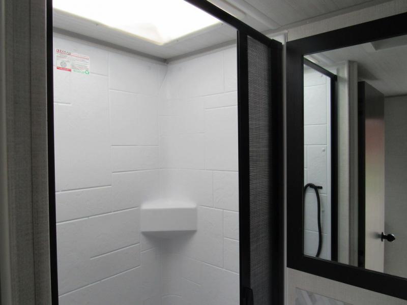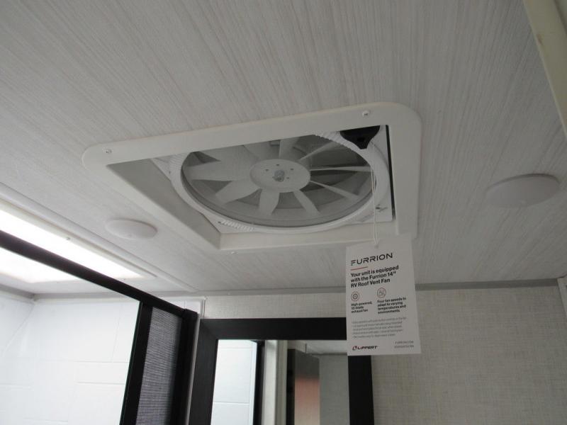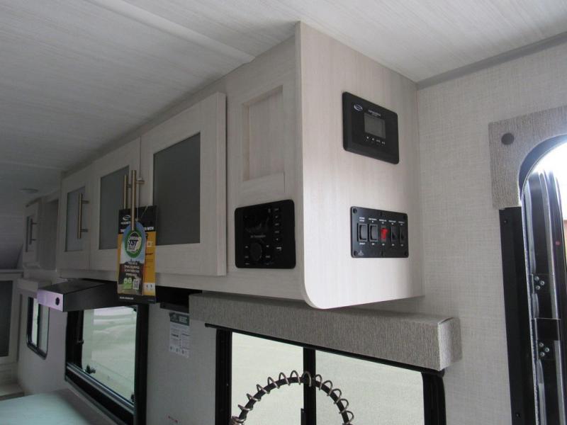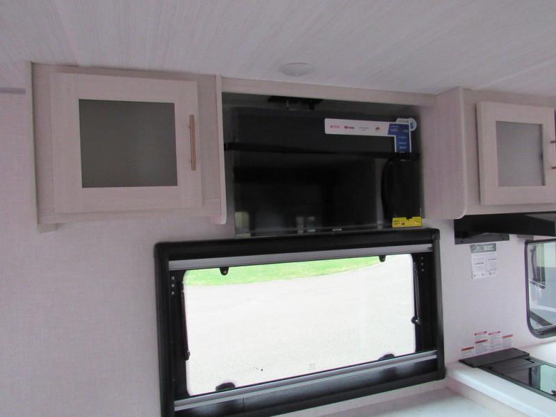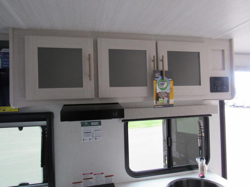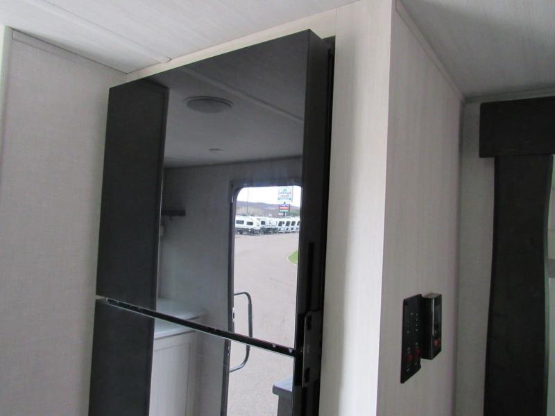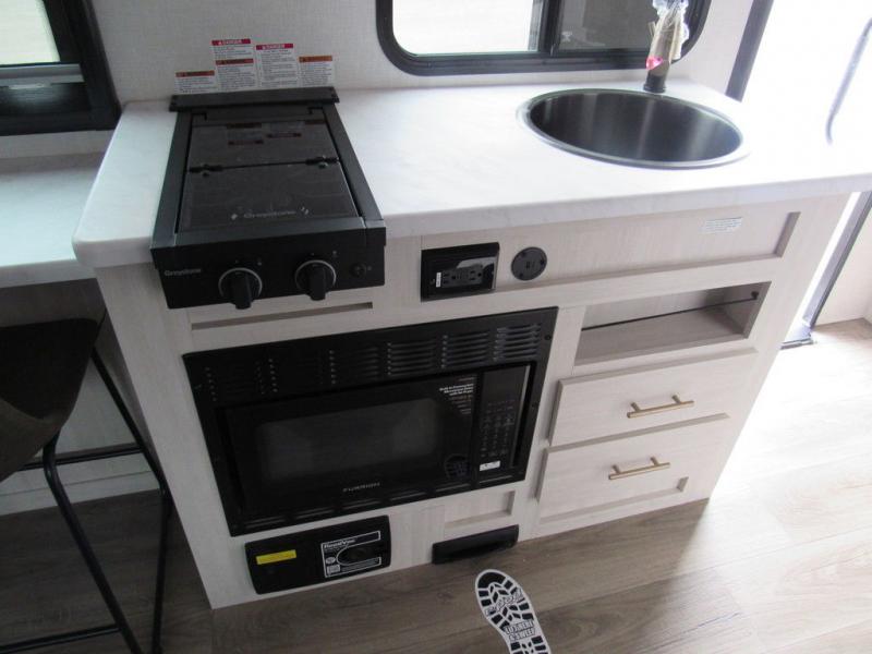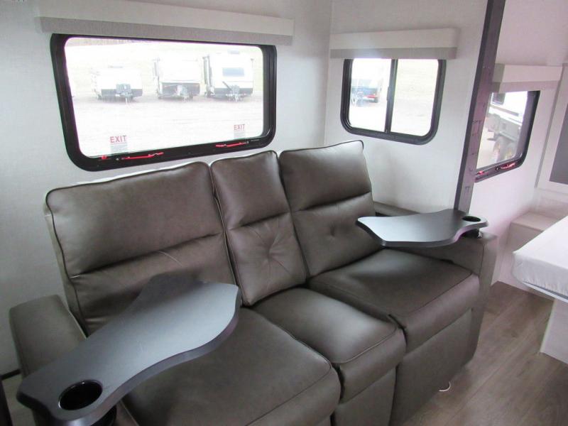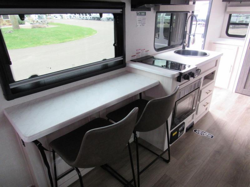 A front bedroom with a walk-around queen bed, a full bath, and a theater seat slide out are a few of the features that you are sure to want in your next RV! You can rest comfortably each night, plus all your clothing can be stored in the dual wardrobes to keep everything tidy. If you're needing more sleeping space, just choose the optional tri-fold sofa or optional booth dinette in place of the theater seat! The chef of your group can make meals on the two burner cooktop or in the convection microwave, and there is a 12V black glass refrigerator for perishables. And the bar top with two seats and the flip-up window provide a great view outdoors as you dine together.