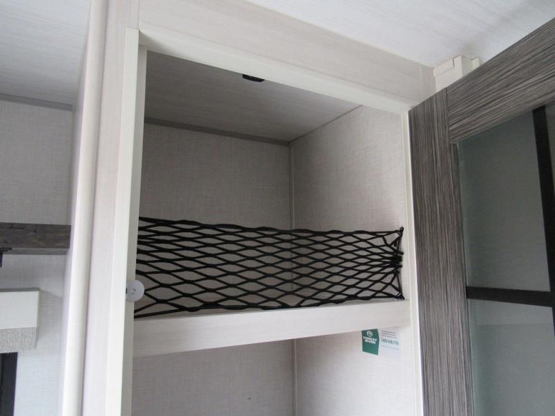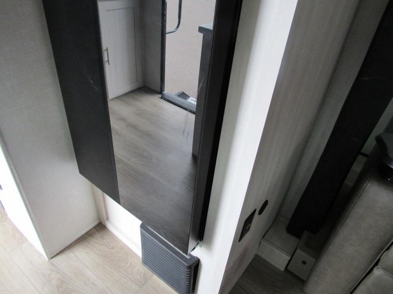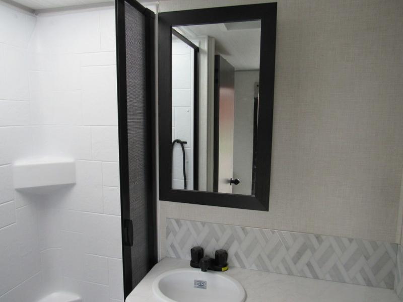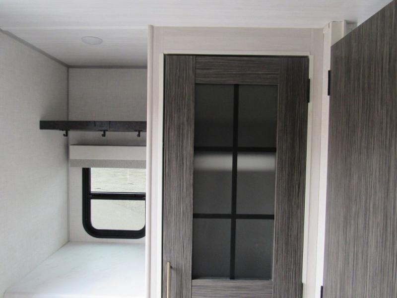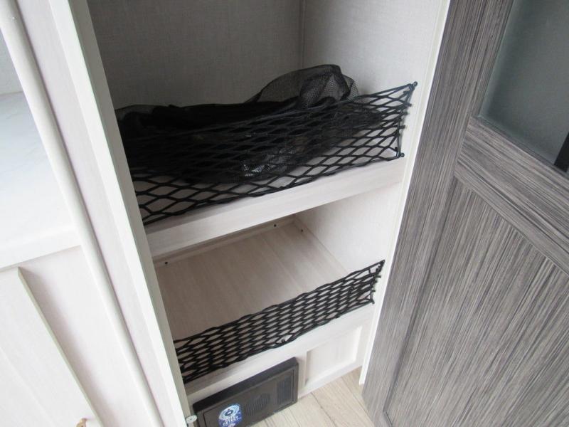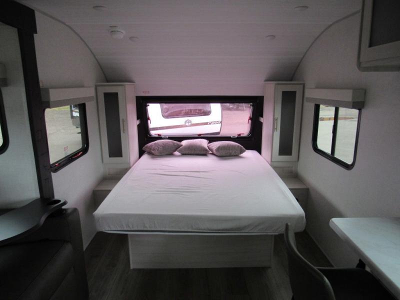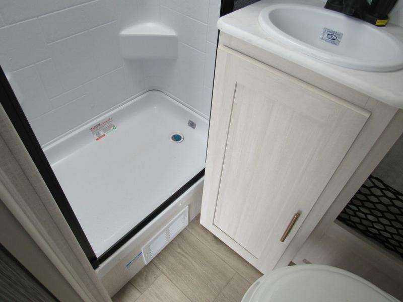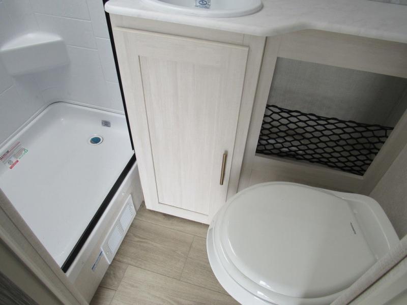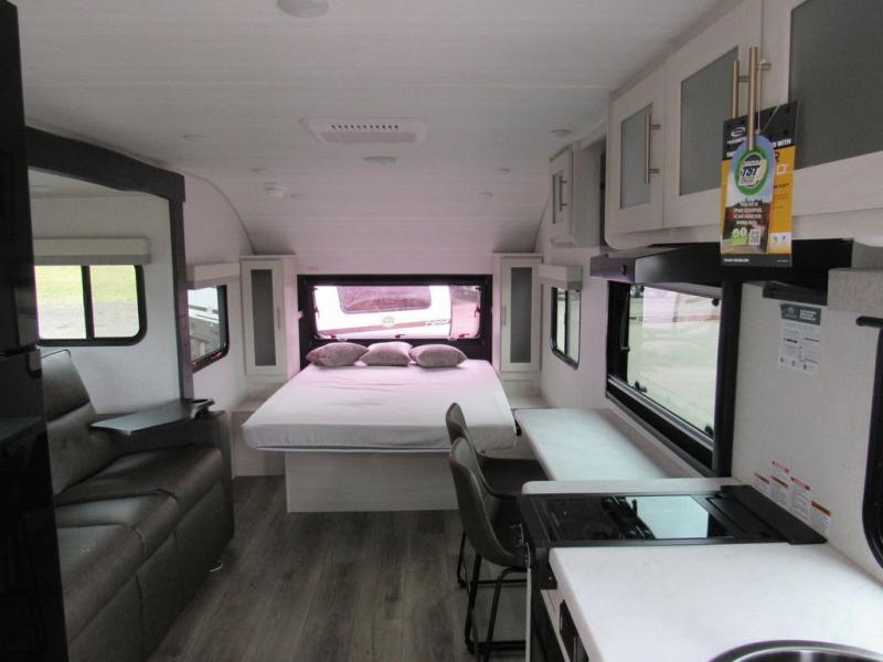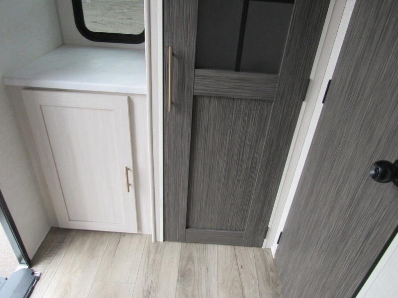A front bedroom with a walk-around queen bed, a full bath, and a theater seat slide out are a few of the features that you are sure to want in your next RV! You can rest comfortably each night, plus all your clothing can be stored in the dual wardrobes to keep everything tidy. If you're needing more sleeping space, just choose the optional tri-fold sofa or optional booth dinette in place of the theater seat! The chef of your group can make meals on the two burner cooktop or in the convection microwave, and there is a 12V black glass refrigerator for perishables. And the bar top with two seats and the flip-up window provide a great view outdoors as you dine together.