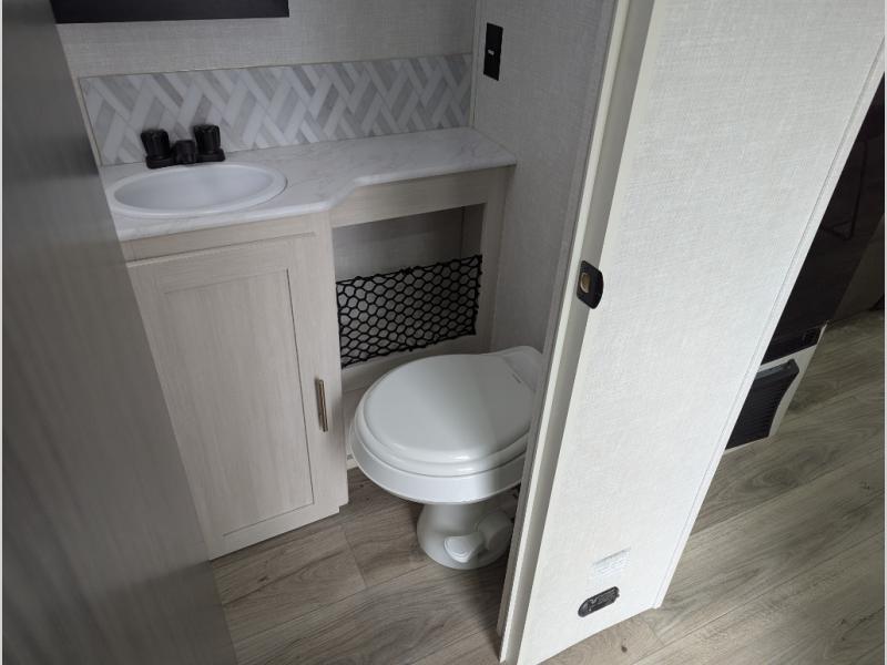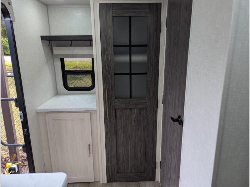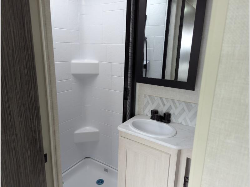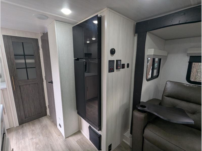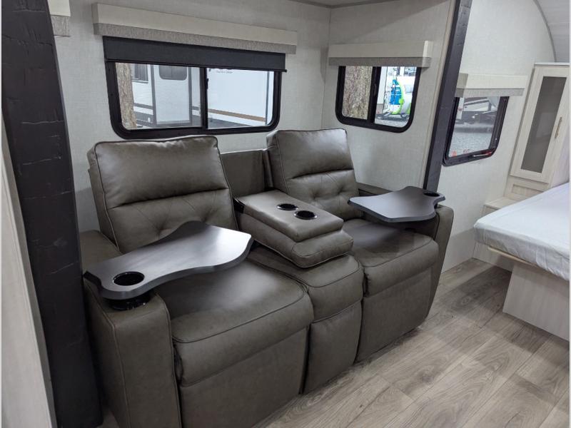 A front bedroom with a walk-around queen bed, a full bath, and a theater seat slide out are a few of the features that you are sure to want in your next RV! You can rest comfortably each night, plus all your clothing can be stored in the dual wardrobes to keep everything tidy. If you're needing more sleeping space, just choose the optional tri-fold sofa or optional booth dinette in place of the theater seat! The chef of your group can make meals on the two burner cooktop or in the convection microwave, and there is a 12V black glass refrigerator for perishables. And the bar top with two seats and the flip-up window provide a great view outdoors as you dine together.