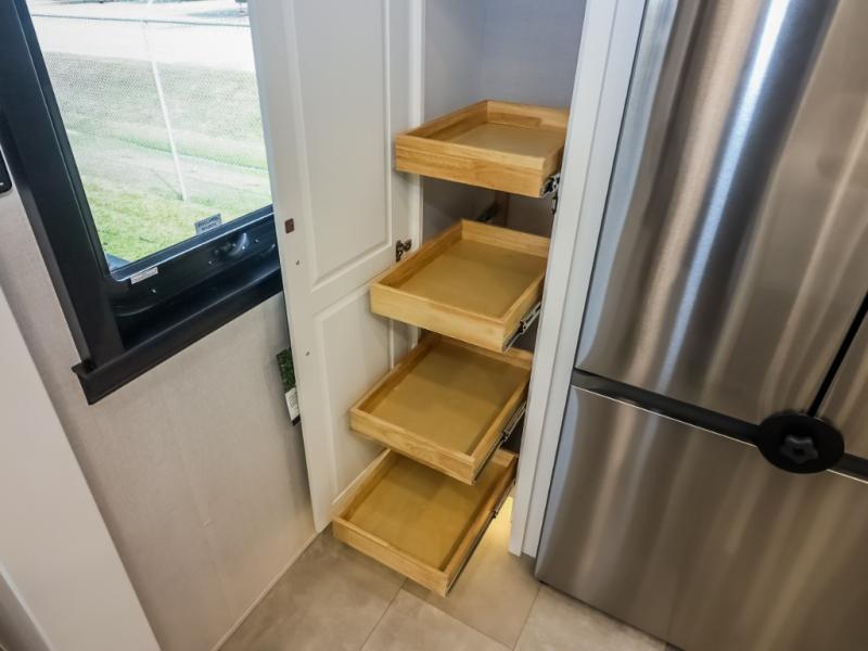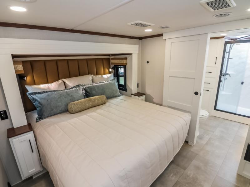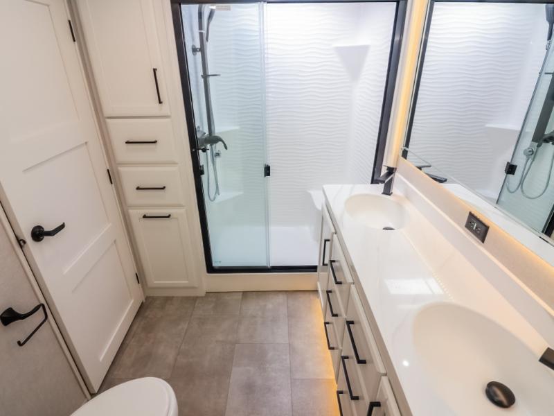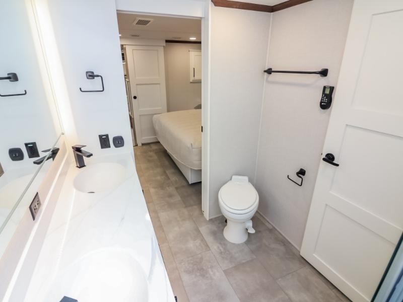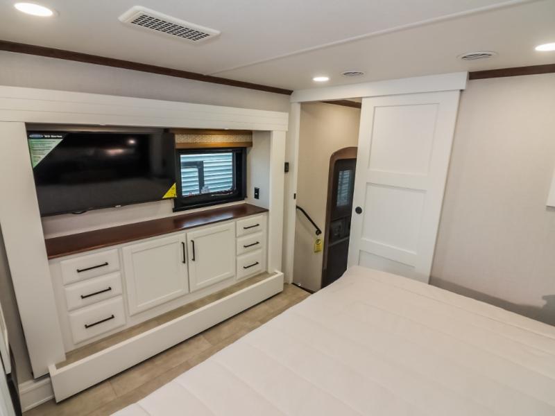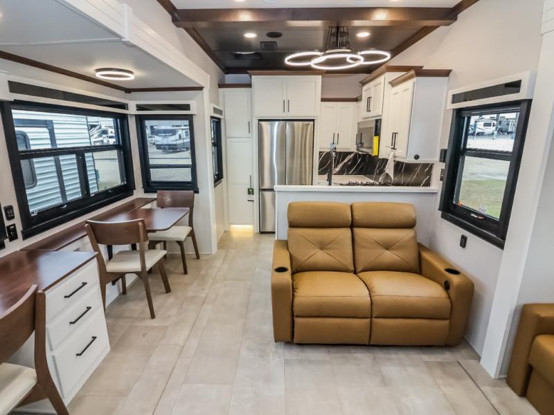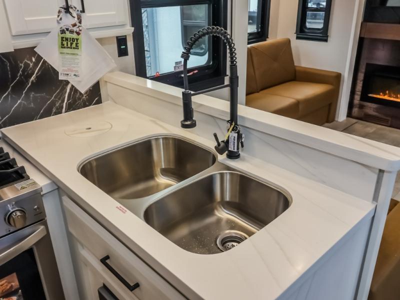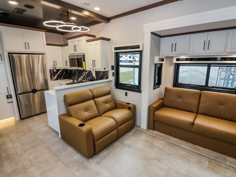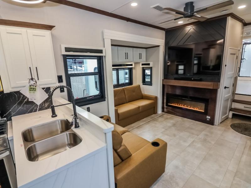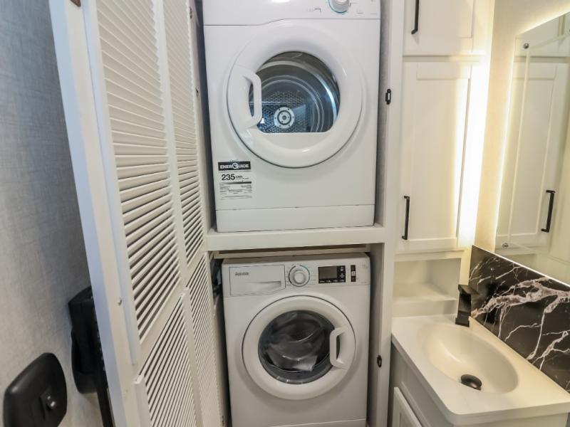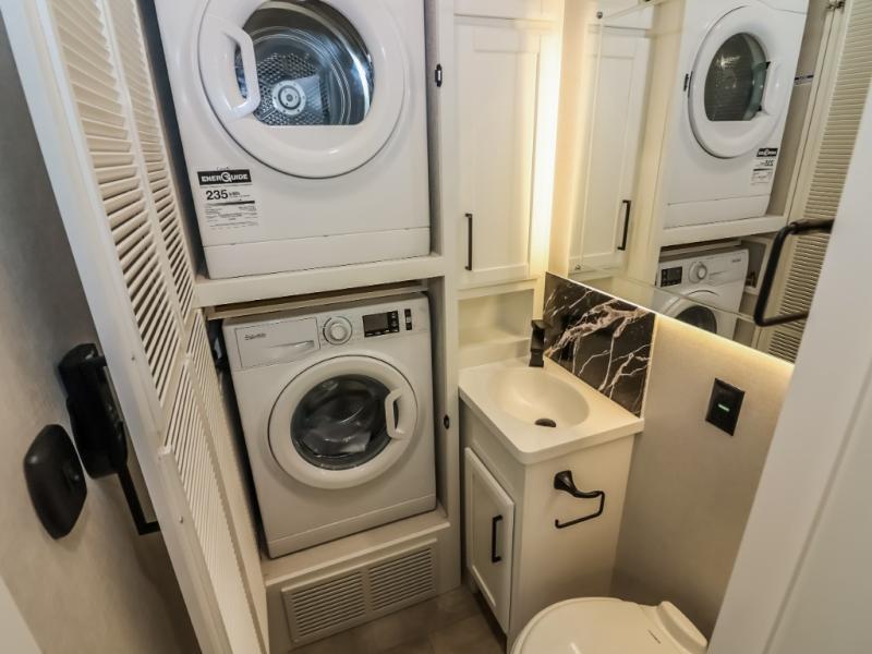 The Forest River RiverStone fifth wheels and toy haulers are luxurious units that have it all! You'll find an automatic six-point hydraulic level-up system to keep your unit in place, and there is preparation for a four-camera observation system. The King Wi-Fi Max router and omni-directional Wi-Fi antenna/extender will help you stay connected to the outside world, and you'll never have to overpack again since the Splendid “Astral” stackable washer and dryer will let you clean the small amount of clothes you've brought with you. Another high luxury is the Fischer Paykal dishwasher which will allow you to spend more time enjoying your camp life and less time cleaning up. Each unit is built with a Trail-Aire Road Armour suspension system, dual-pane frameless windows, a full docking station, a 190W solar panel, and a Firefly integrated touch control system.