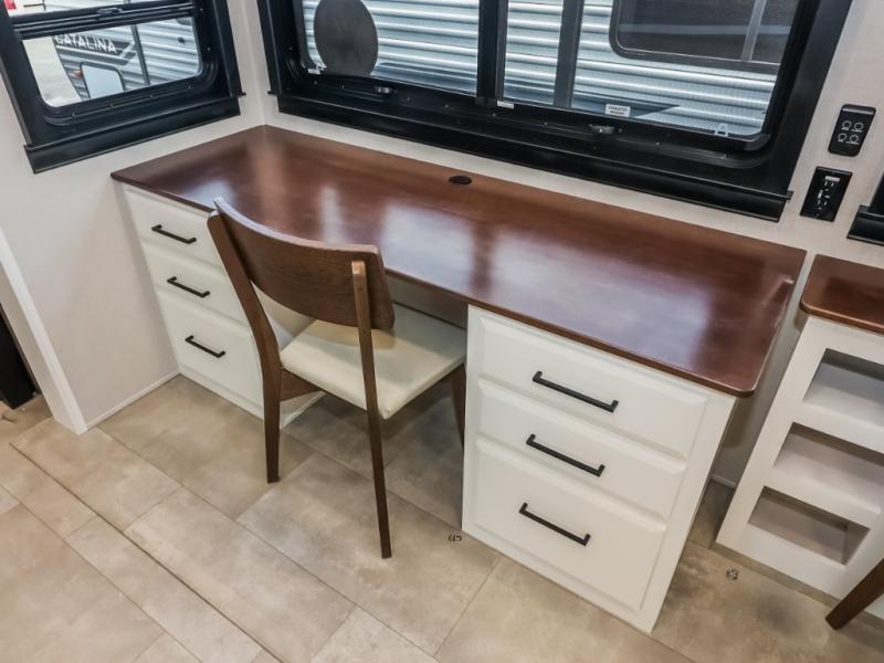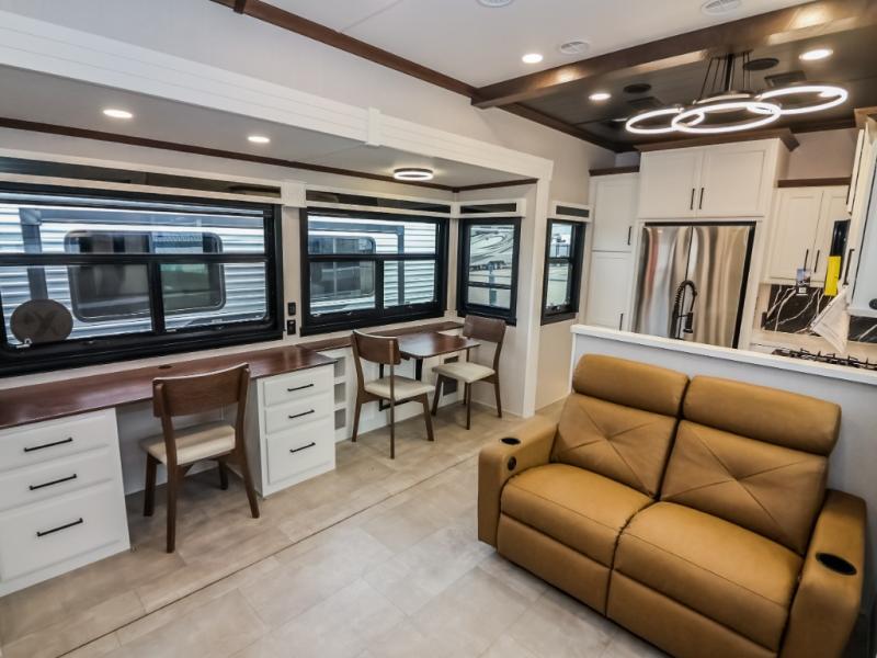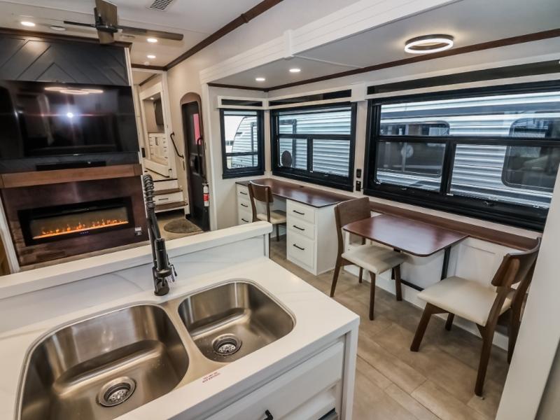Show your family a good time with this RiverStone fifth wheel! You will get to stay in a super comfortable master suite at the front of this unit which has a dual-sink vanity in the full bathroom. The bedroom offers you a king-size bed that you can rest on while you watch the 40" LED TV across from you, and there is a half bathroom just outside the bedroom for your friends or family to use. If you've decided to bring work with you on the road, you'll be grateful to find a desk in the living area, and the pull-out dinette is a great place to sit down for meals. Work your magic in the kitchen and prepare something delicious on the four-burner range for everyone to eat.