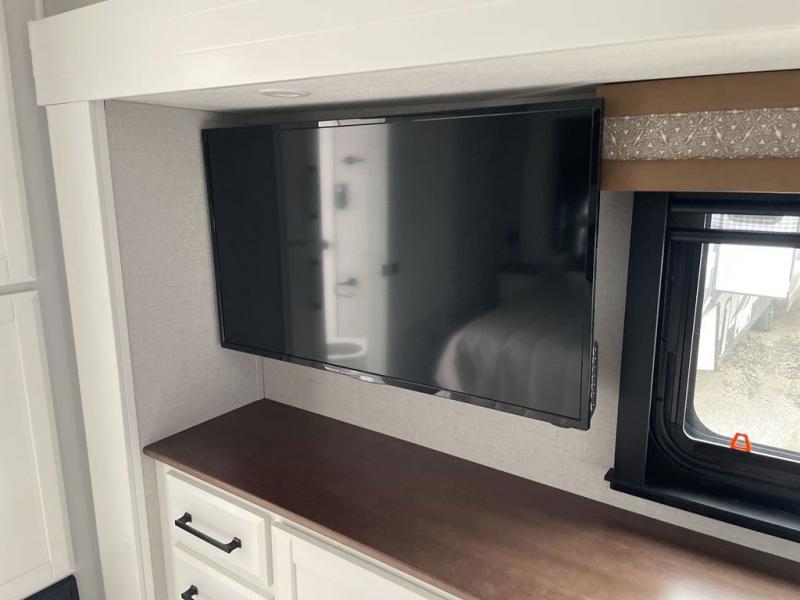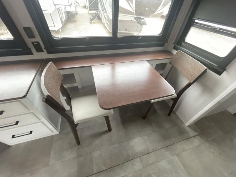 Show your family a good time with this RiverStone fifth wheel! You will get to stay in a super comfortable master suite at the front of this unit which has a dual-sink vanity in the full bathroom. The bedroom offers you a king-size bed that you can rest on while you watch the 40" LED TV across from you, and there is a half bathroom just outside the bedroom for your friends or family to use. If you've decided to bring work with you on the road, you'll be grateful to find a desk in the living area, and the pull-out dinette is a great place to sit down for meals. Work your magic in the kitchen and prepare something delicious on the four-burner range for everyone to eat.