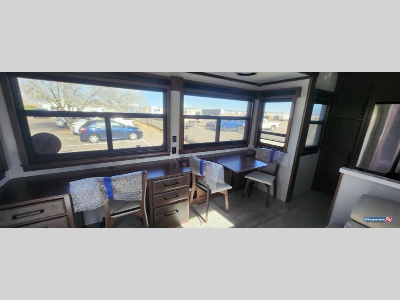Show your family a good time with this RiverStone fifth wheel! You will get to stay in a super comfortable master suite at the front of this unit which has a dual-sink vanity in the full bathroom. The bedroom offers you a king-size bed that you can rest on while you watch the 40" LED TV across from you, and there is a half bathroom just outside the bedroom for your friends or family to use. If you've decided to bring work with you on the road, you'll be grateful to find a desk in the living area, and the pull-out dinette is a great place to sit down for meals. Work your magic in the kitchen and prepare something delicious on the four-burner range for everyone to eat.