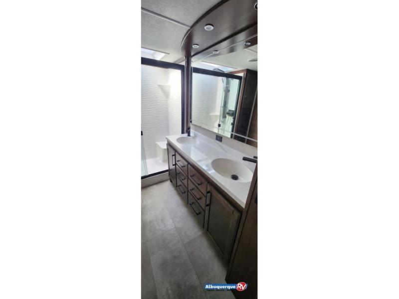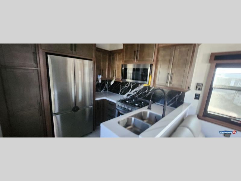 The Forest River RiverStone fifth wheels and toy haulers are luxurious units that have it all! You'll find an automatic six-point hydraulic level-up system to keep your unit in place, and there is preparation for a four-camera observation system. The TravlFi Journey XTR 4G/LTE router and WiFi extender will help you stay connected to the outside world, and you'll never have to overpack again since the Splendid “Astral” stackable washer and dryer will let you clean the small amount of clothes you've brought with you. Another high luxury is the Fischer Paykal dishwasher which will allow you to spend more time enjoying your camp life and less time cleaning up. Each unit is built with an LCI Road Armour suspension system, dual-pane frameless windows, a full docking station, a 200W solar panel, and a BMPro touch control system.