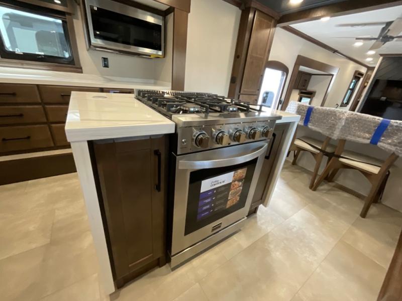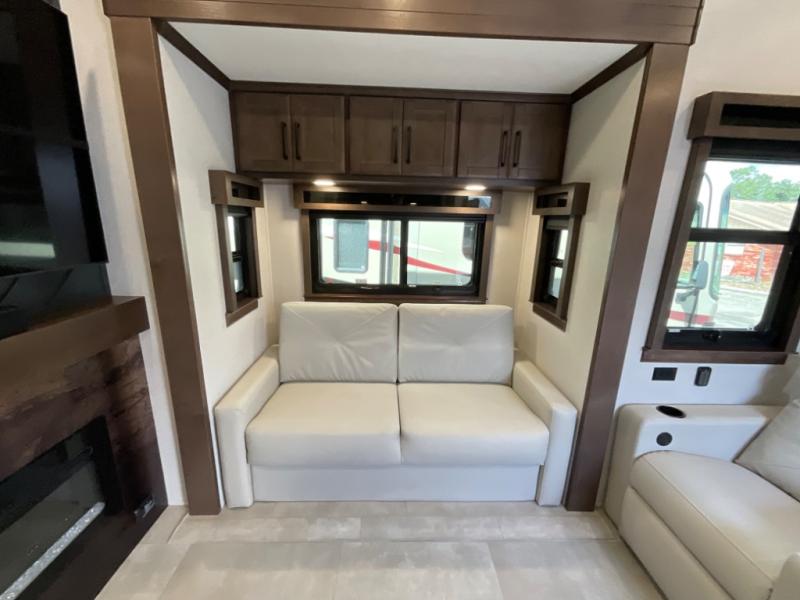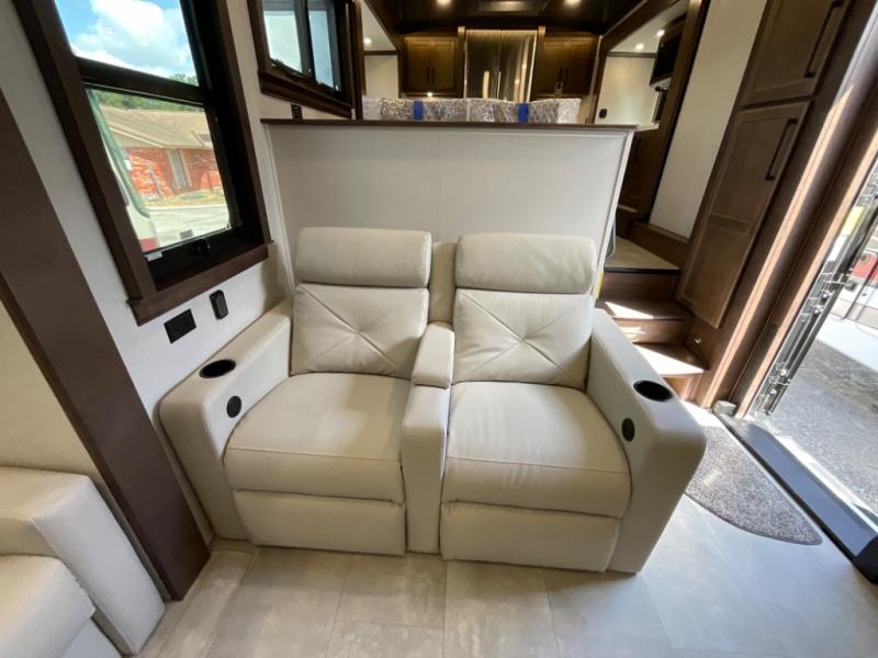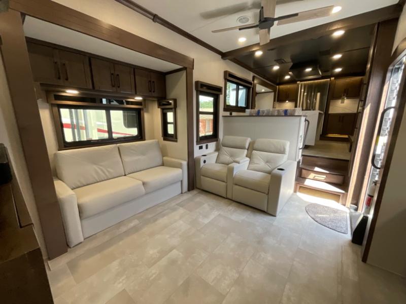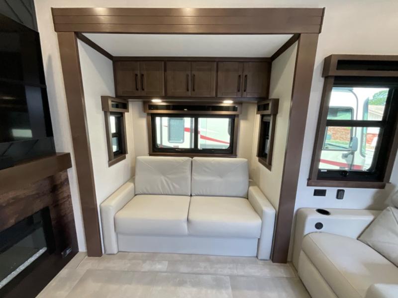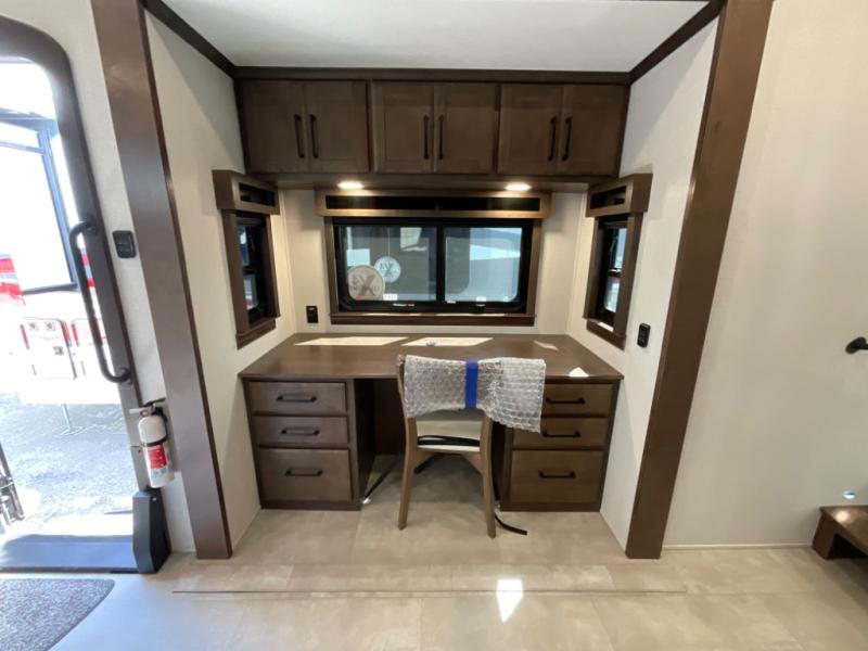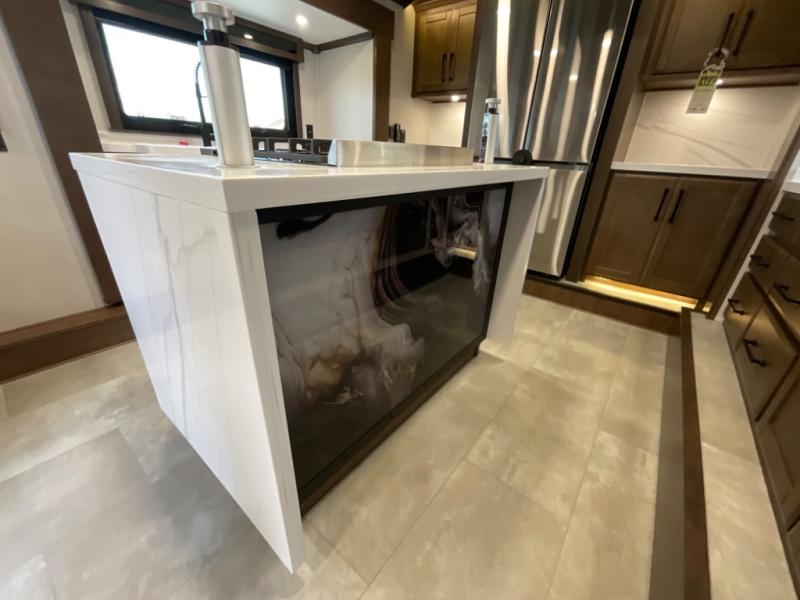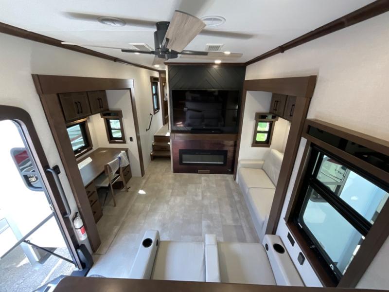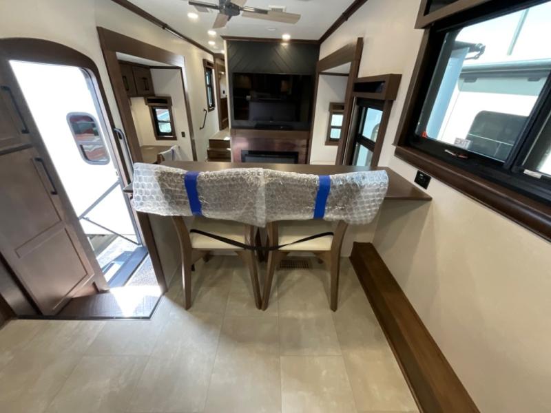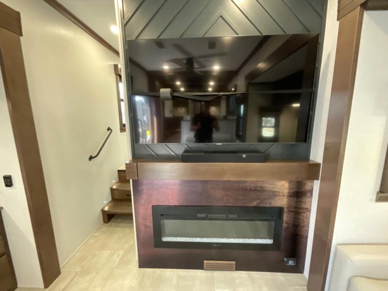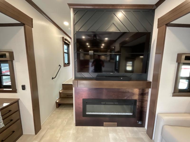 You will feel right at home in this fifth wheel! The rear private bedroom has a 72" x 80" king bed slide for a good night's rest, a rear large wardrobe with the washer and dryer next to it, and even a dresser with a 40" LED TV. And two can get ready at once in the full bathroom with the dual sink vanity. You can then head to either the desk slide to get some work done or whip up some scrambled eggs on the three burner cooktop at the island in the front kitchen. The kitchen even has a dishwasher for easy clean up and two bar stools at the high top dinette that overlooks the middle living area. Relax each night in true comfort on either the E-Z Glide sofa bed slide or the theater seating across from the entertainment center which has a fireplace and 65" Samsung LED Smart TV to watch your favorite movies!