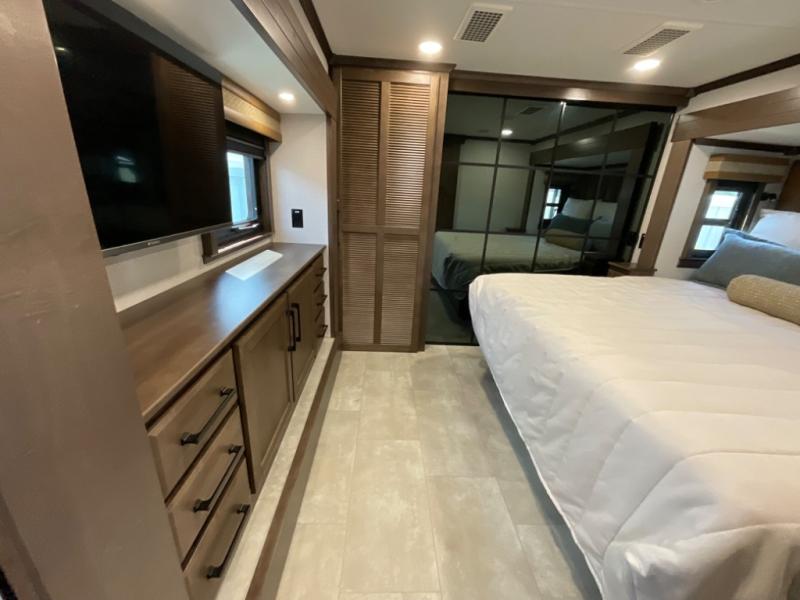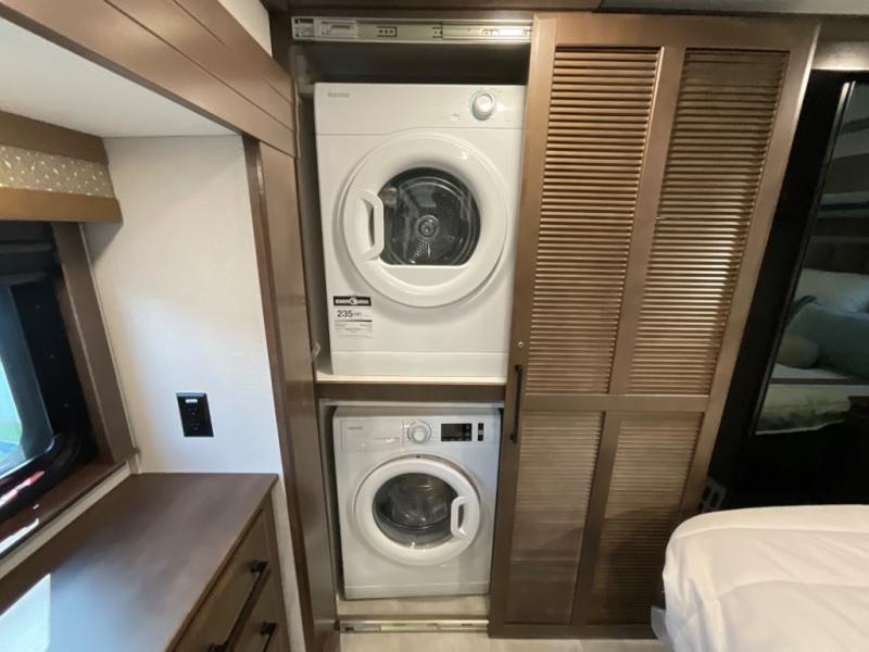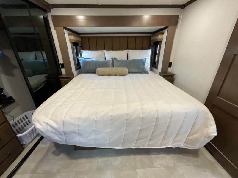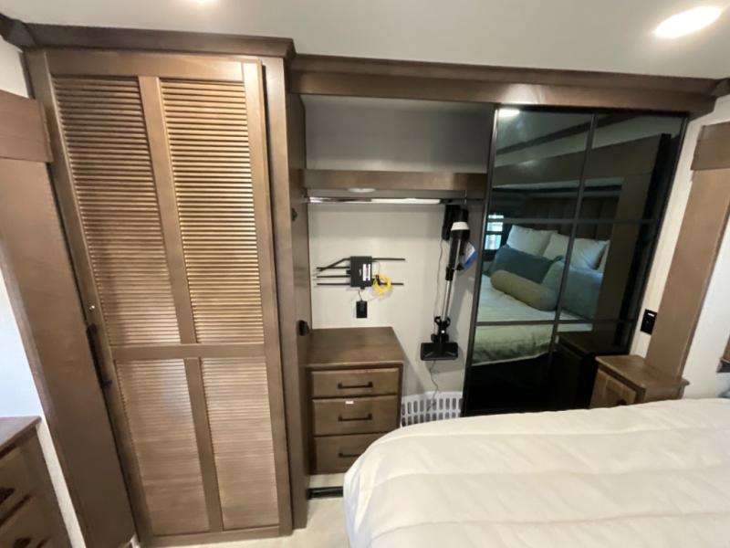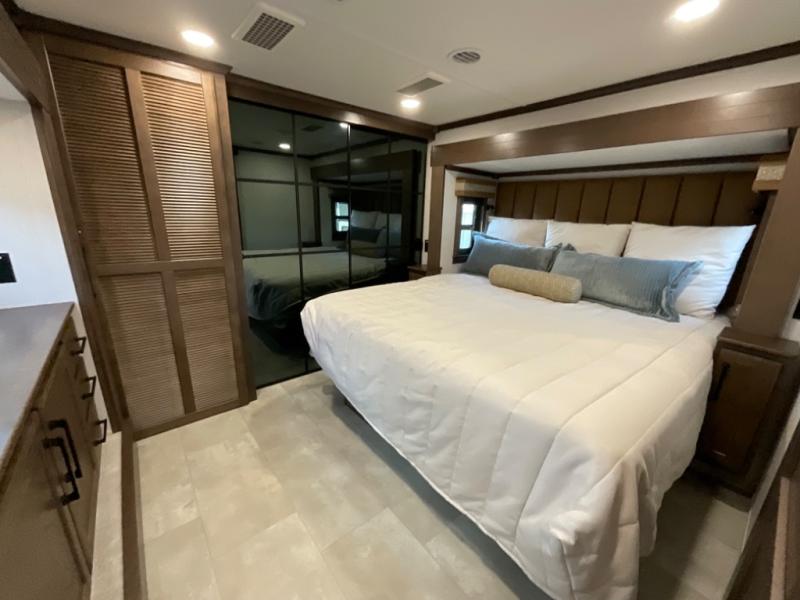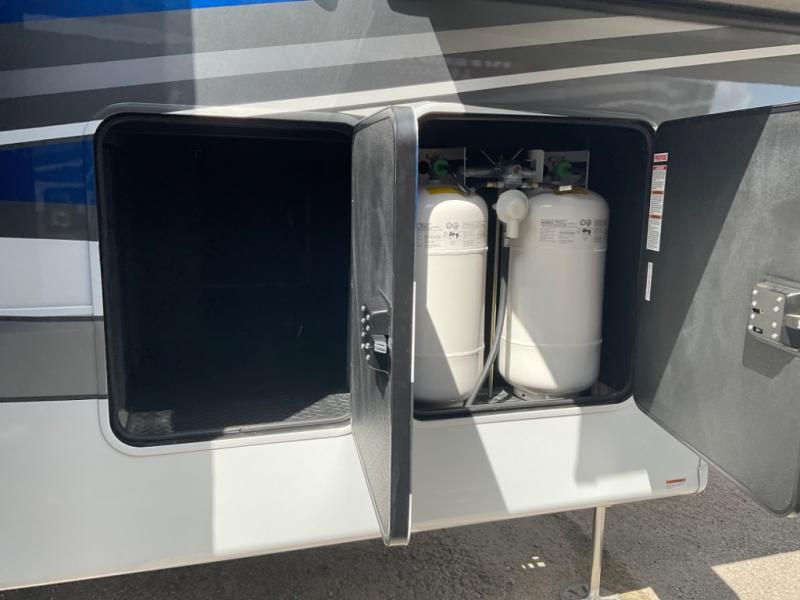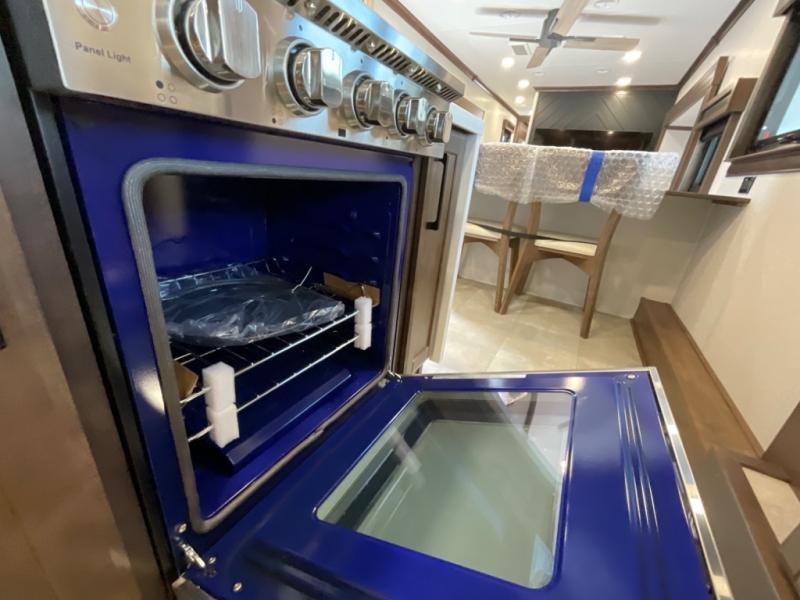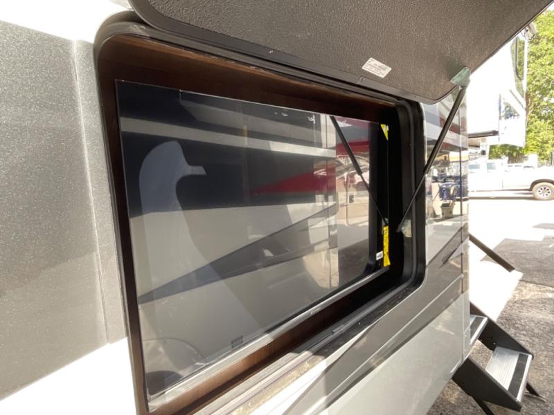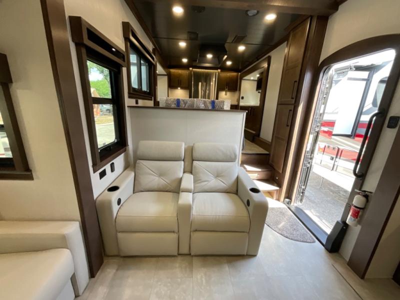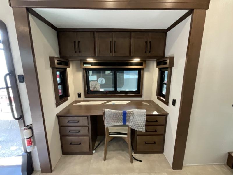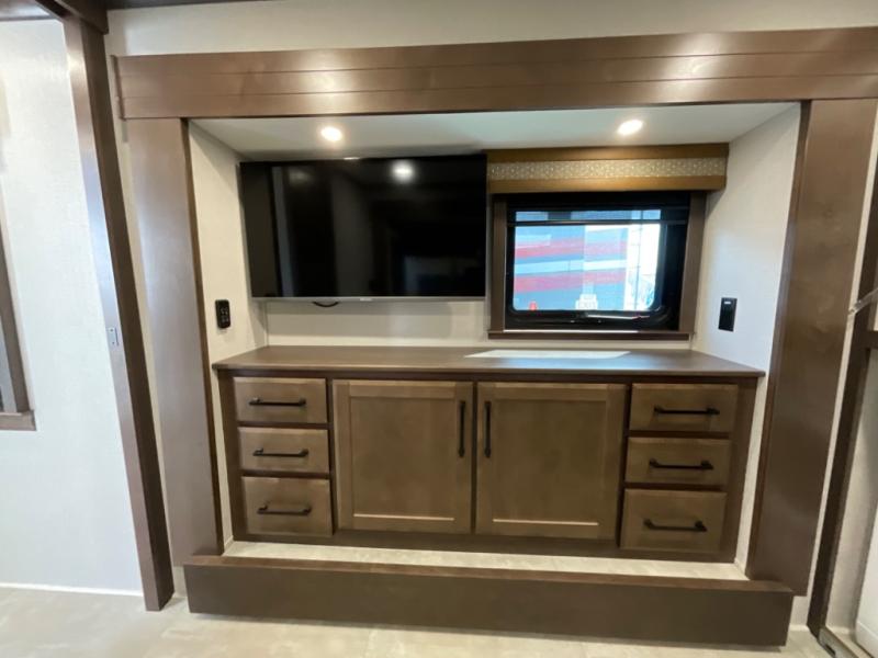 You will feel right at home in this fifth wheel! The rear private bedroom has a 72" x 80" king bed slide for a good night's rest, a rear large wardrobe with the washer and dryer next to it, and even a dresser with a 40" LED TV. And two can get ready at once in the full bathroom with the dual sink vanity. You can then head to either the desk slide to get some work done or whip up some scrambled eggs on the three burner cooktop at the island in the front kitchen. The kitchen even has a dishwasher for easy clean up and two bar stools at the high top dinette that overlooks the middle living area. Relax each night in true comfort on either the E-Z Glide sofa bed slide or the theater seating across from the entertainment center which has a fireplace and 65" Samsung LED Smart TV to watch your favorite movies!