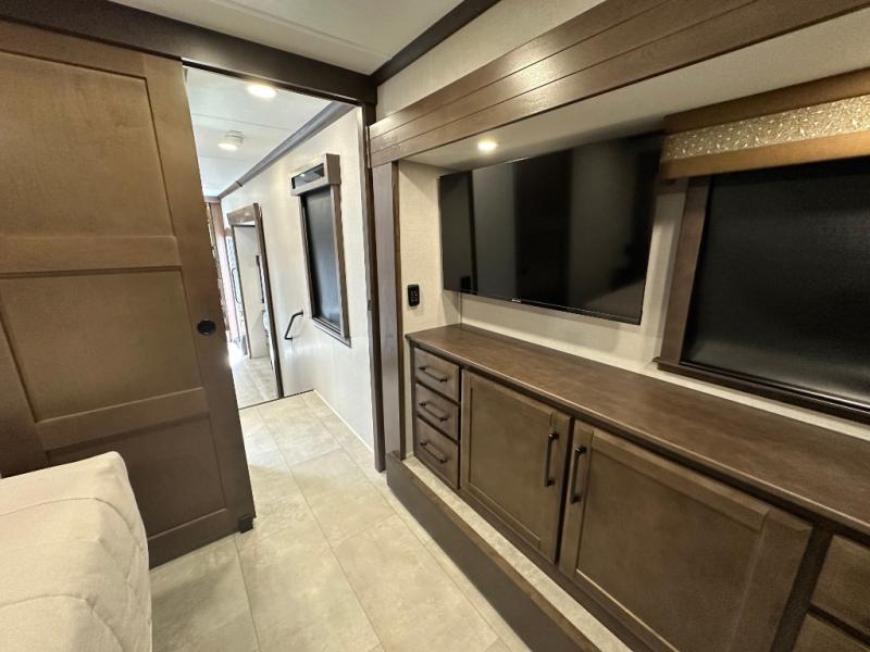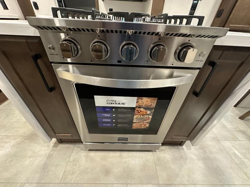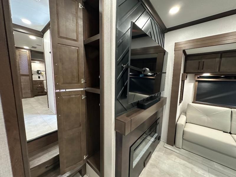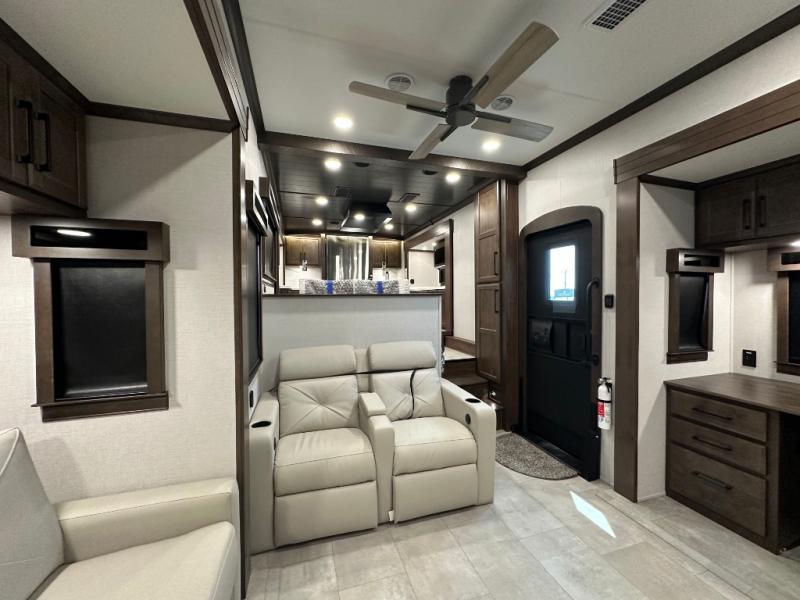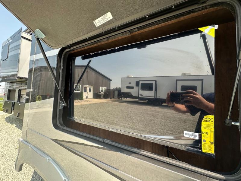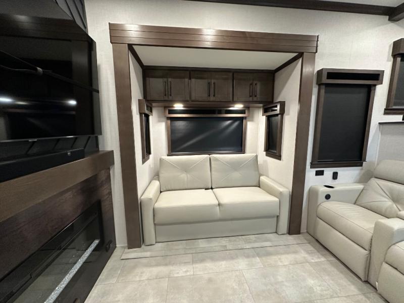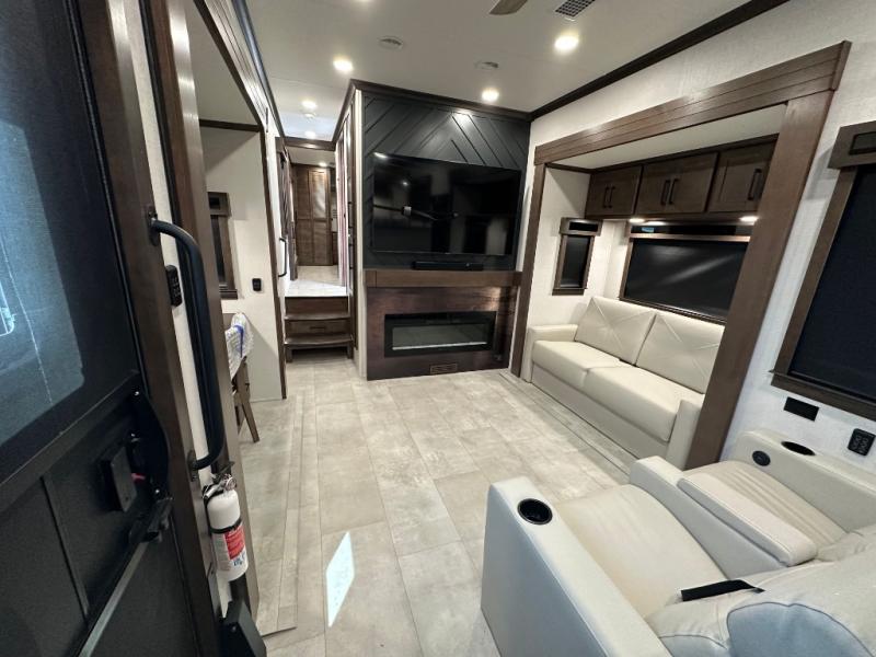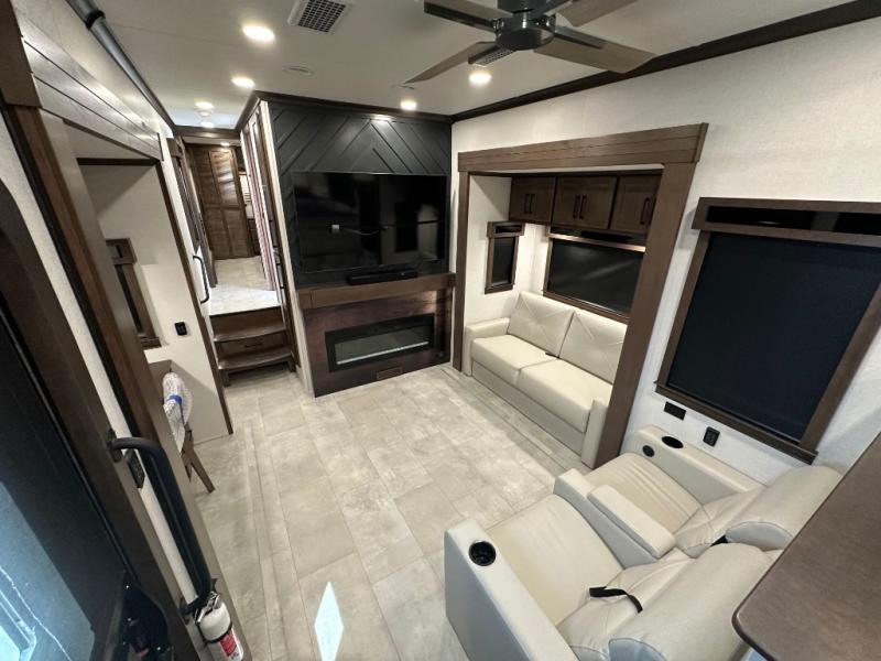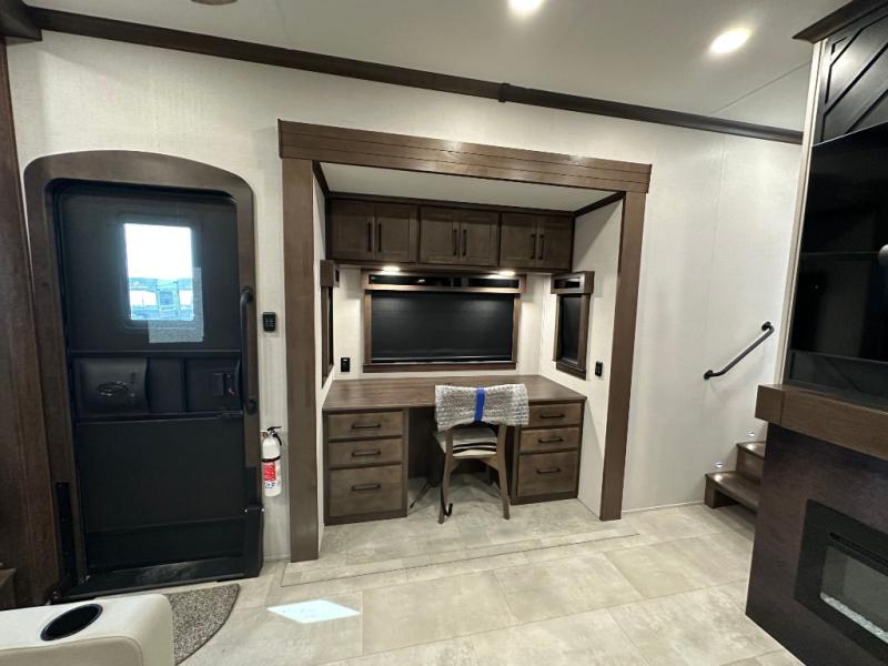 You will feel right at home in this fifth wheel! The rear private bedroom has a 72" x 80" king bed slide for a good night's rest, a rear large wardrobe with the washer and dryer next to it, and even a dresser with a 40" LED TV. And two can get ready at once in the full bathroom with the dual sink vanity. You can then head to either the desk slide to get some work done or whip up some scrambled eggs on the three burner cooktop at the island in the front kitchen. The kitchen even has a dishwasher for easy clean up and two bar stools at the high top dinette that overlooks the middle living area. Relax each night in true comfort on either the E-Z Glide sofa bed slide or the theater seating across from the entertainment center which has a fireplace and 65" Samsung LED Smart TV to watch your favorite movies!