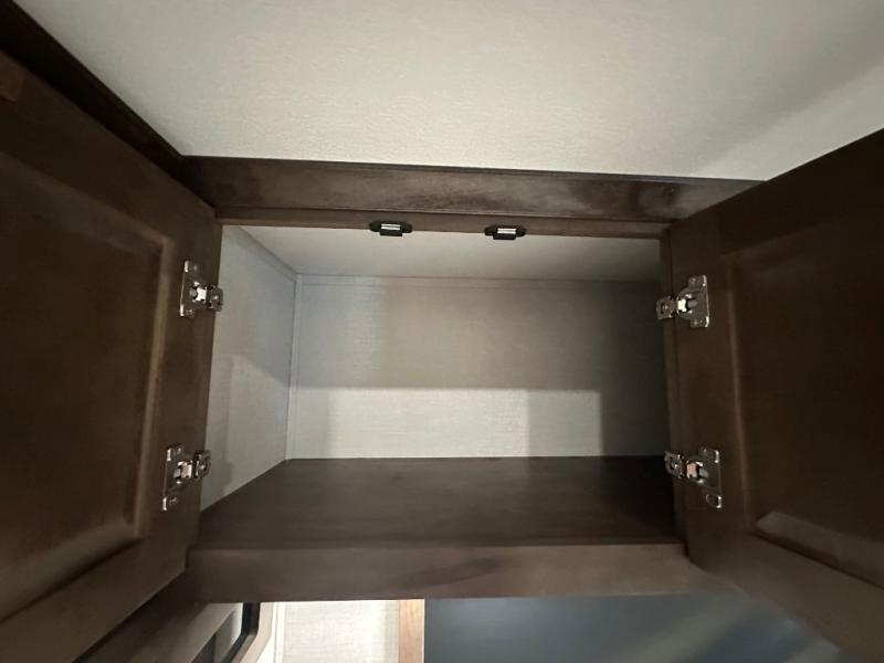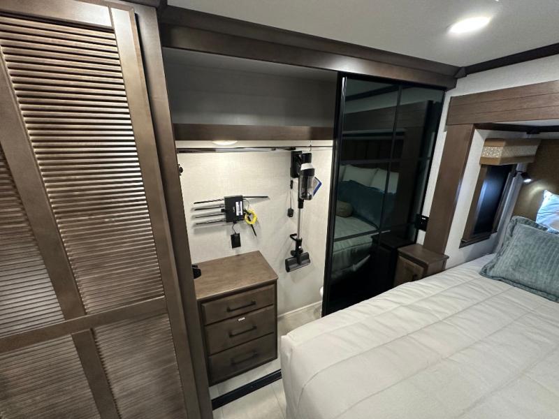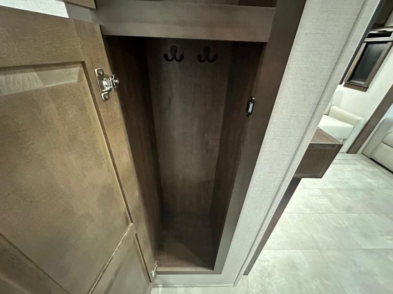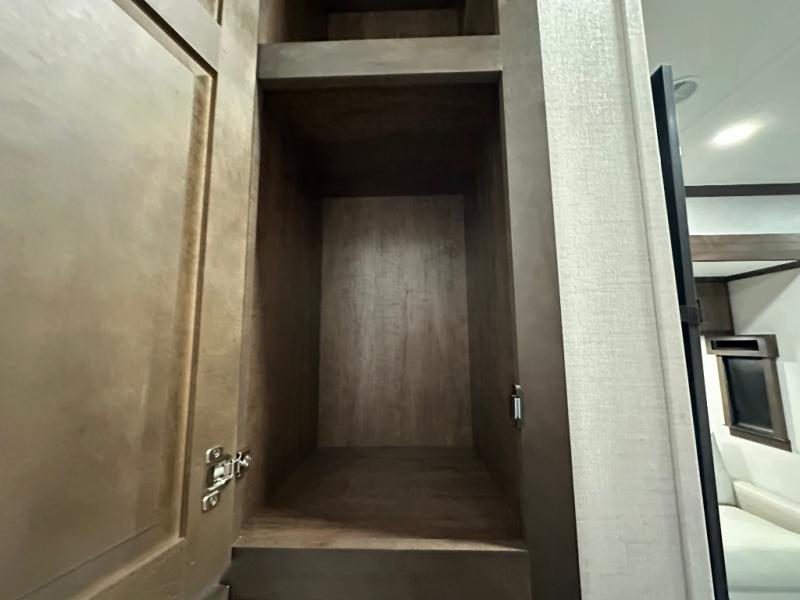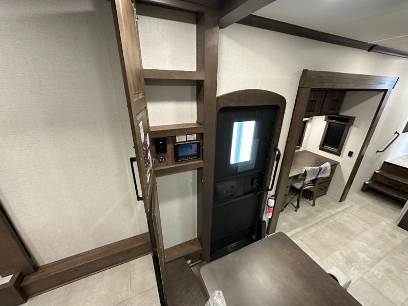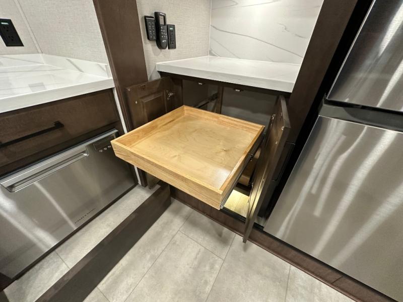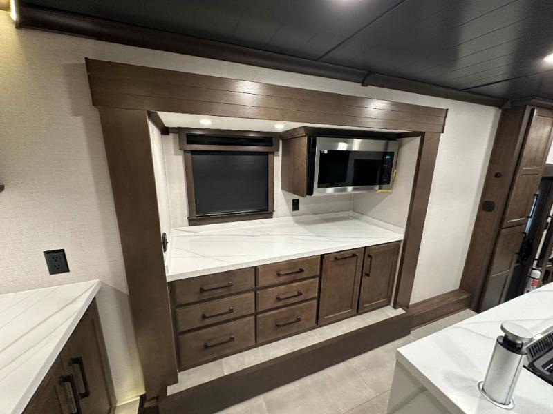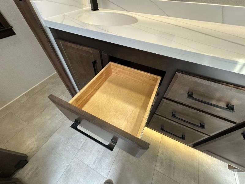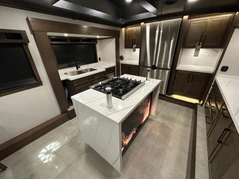 You will feel right at home in this fifth wheel! The rear private bedroom has a 72" x 80" king bed slide for a good night's rest, a rear large wardrobe with the washer and dryer next to it, and even a dresser with a 40" LED TV. And two can get ready at once in the full bathroom with the dual sink vanity. You can then head to either the desk slide to get some work done or whip up some scrambled eggs on the three burner cooktop at the island in the front kitchen. The kitchen even has a dishwasher for easy clean up and two bar stools at the high top dinette that overlooks the middle living area. Relax each night in true comfort on either the E-Z Glide sofa bed slide or the theater seating across from the entertainment center which has a fireplace and 65" Samsung LED Smart TV to watch your favorite movies!