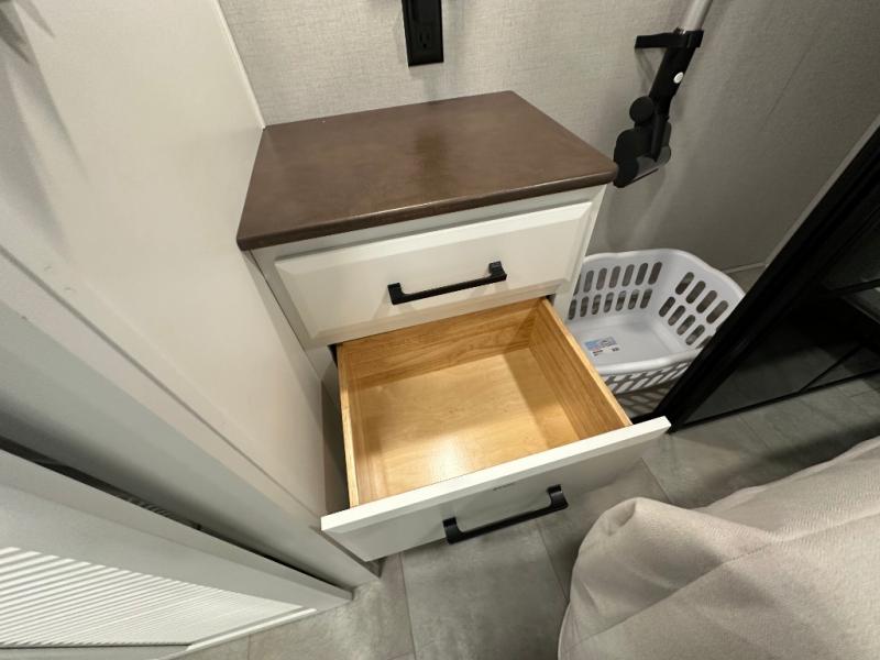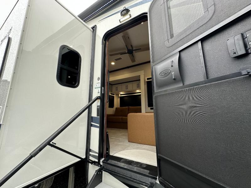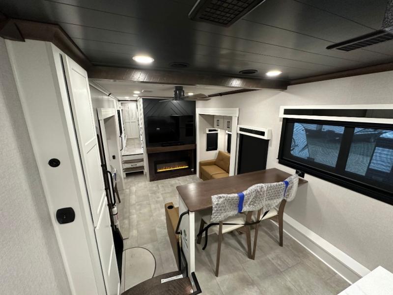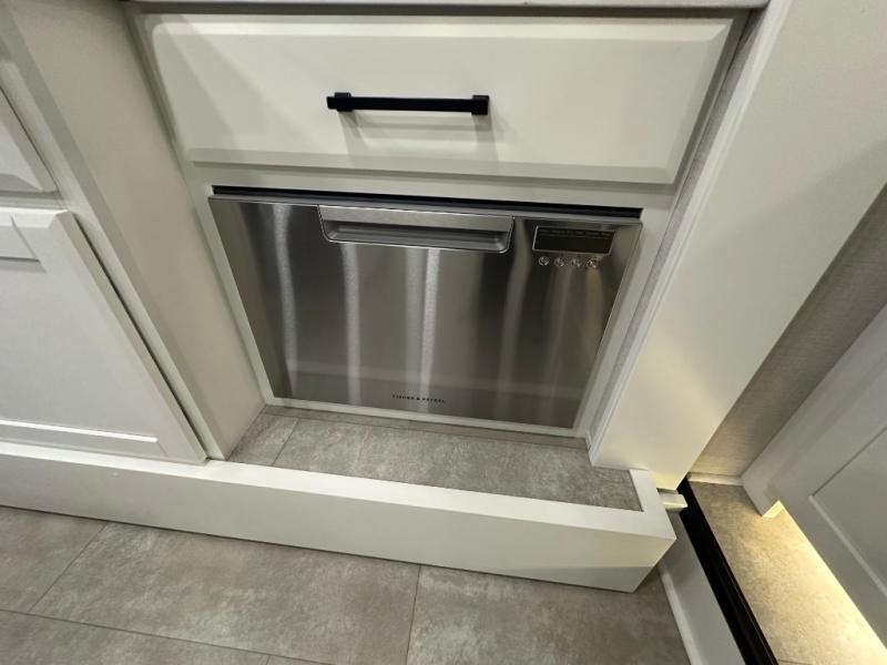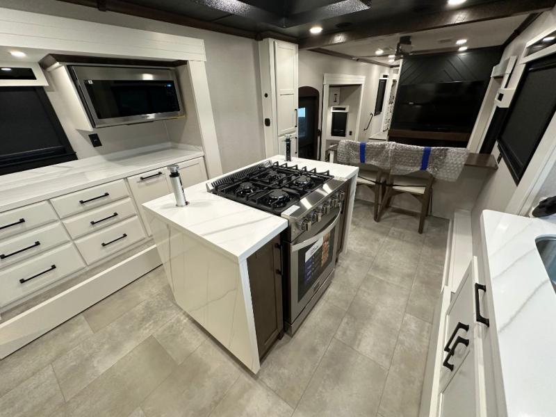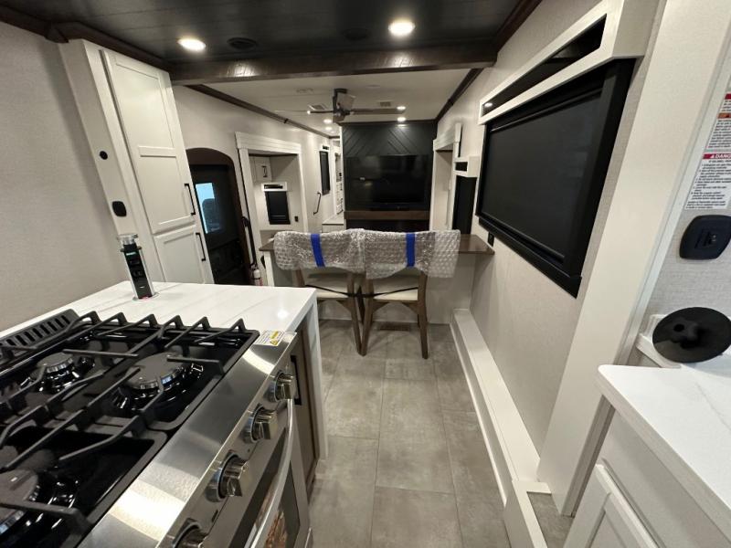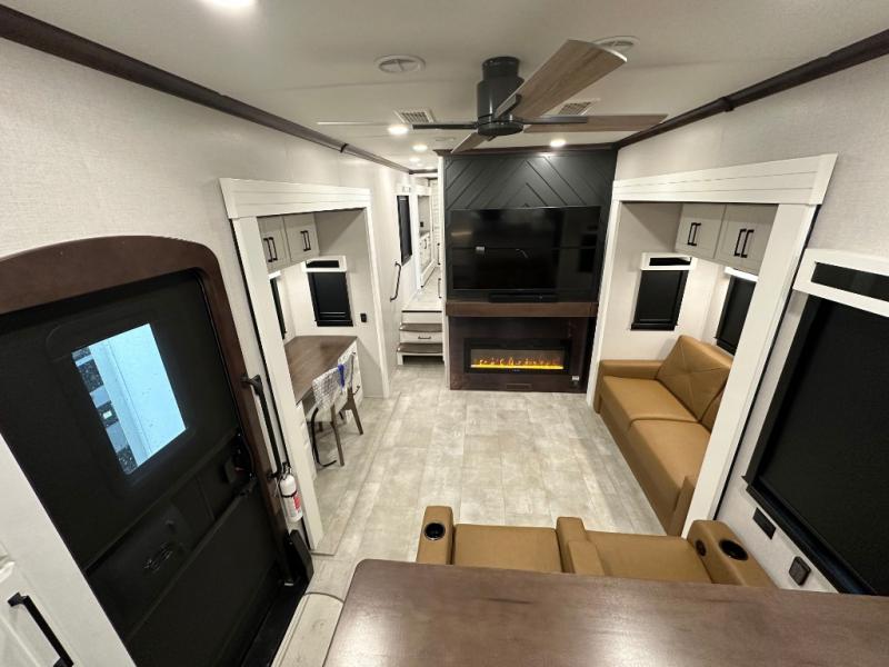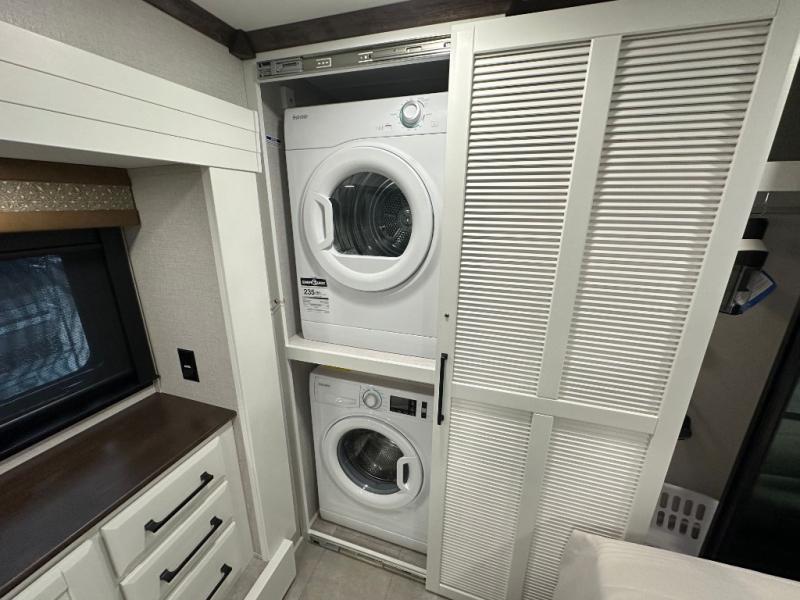 You will feel right at home in this fifth wheel! The rear private bedroom has a 72" x 80" king bed slide for a good night's rest, a rear large wardrobe with the washer and dryer next to it, and even a dresser with a 40" LED TV. And two can get ready at once in the full bathroom with the dual sink vanity. You can then head to either the desk slide to get some work done or whip up some scrambled eggs on the three burner cooktop at the island in the front kitchen. The kitchen even has a dishwasher for easy clean up and two bar stools at the high top dinette that overlooks the middle living area. Relax each night in true comfort on either the E-Z Glide sofa bed slide or the theater seating across from the entertainment center which has a fireplace and 65" Samsung LED Smart TV to watch your favorite movies!