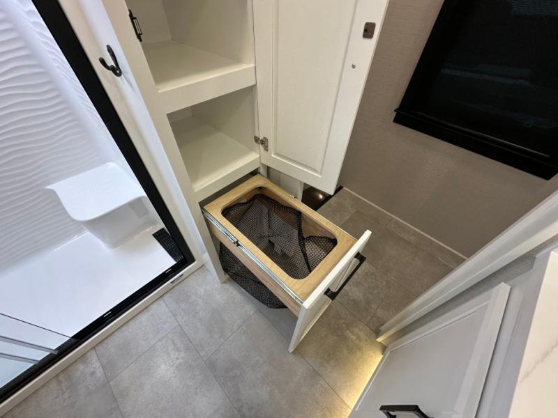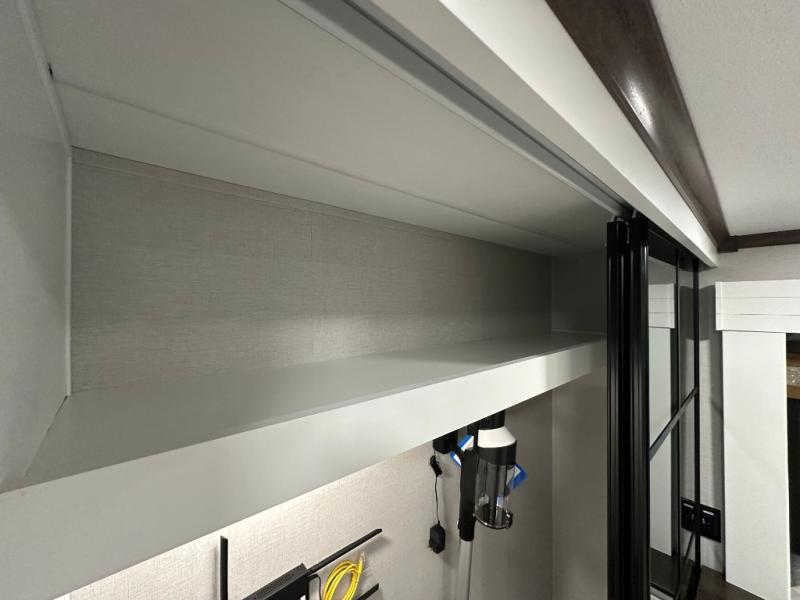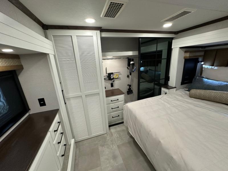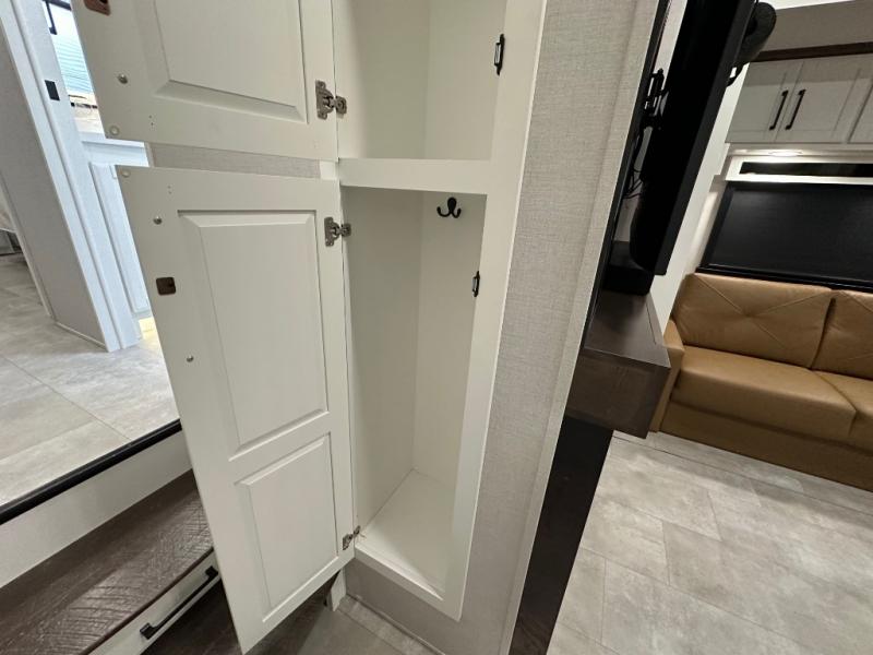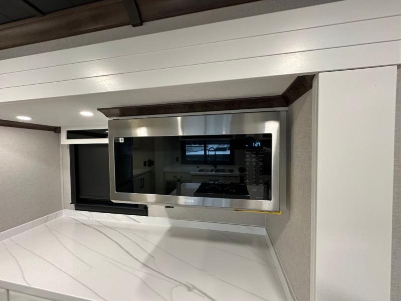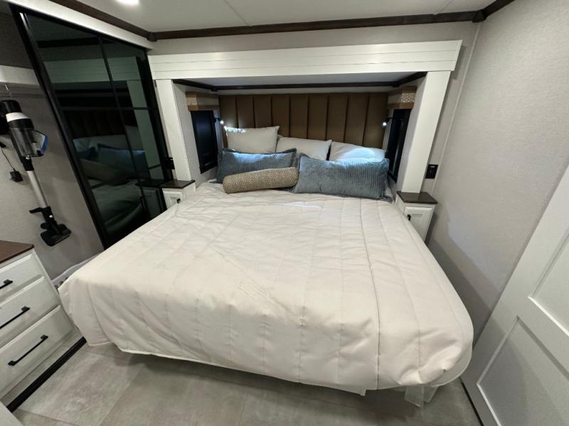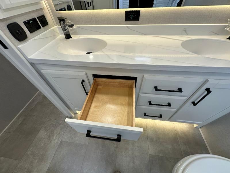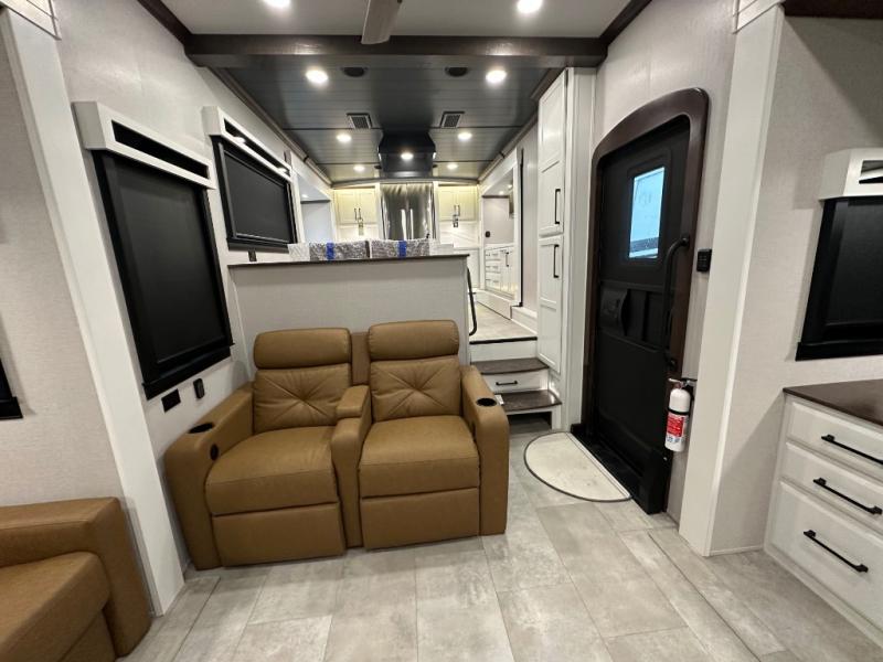 You will feel right at home in this fifth wheel! The rear private bedroom has a 72" x 80" king bed slide for a good night's rest, a rear large wardrobe with the washer and dryer next to it, and even a dresser with a 40" LED TV. And two can get ready at once in the full bathroom with the dual sink vanity. You can then head to either the desk slide to get some work done or whip up some scrambled eggs on the three burner cooktop at the island in the front kitchen. The kitchen even has a dishwasher for easy clean up and two bar stools at the high top dinette that overlooks the middle living area. Relax each night in true comfort on either the E-Z Glide sofa bed slide or the theater seating across from the entertainment center which has a fireplace and 65" Samsung LED Smart TV to watch your favorite movies!