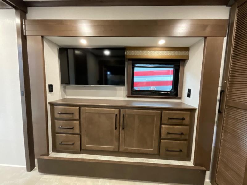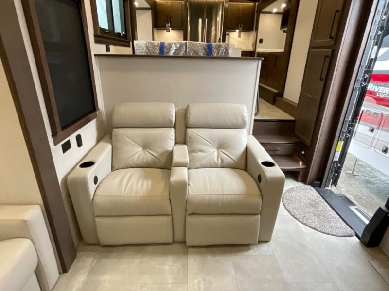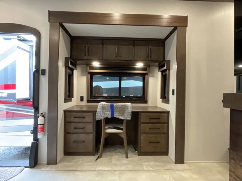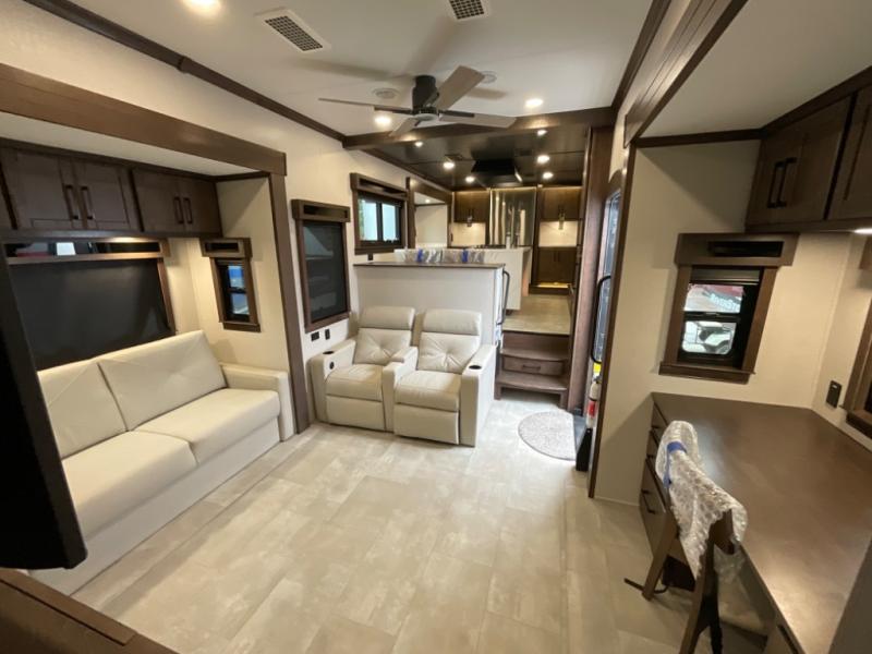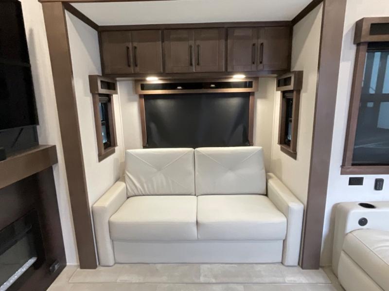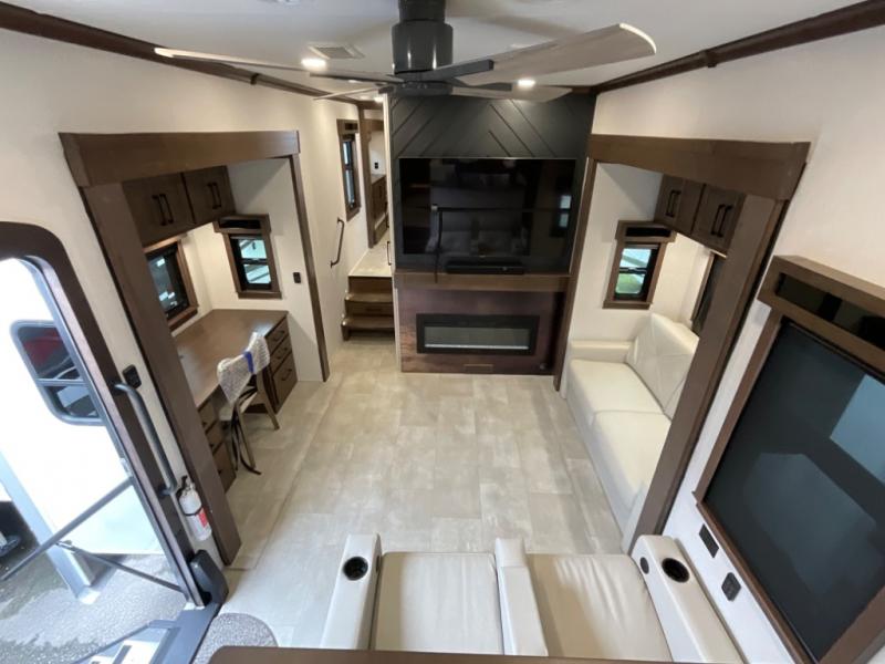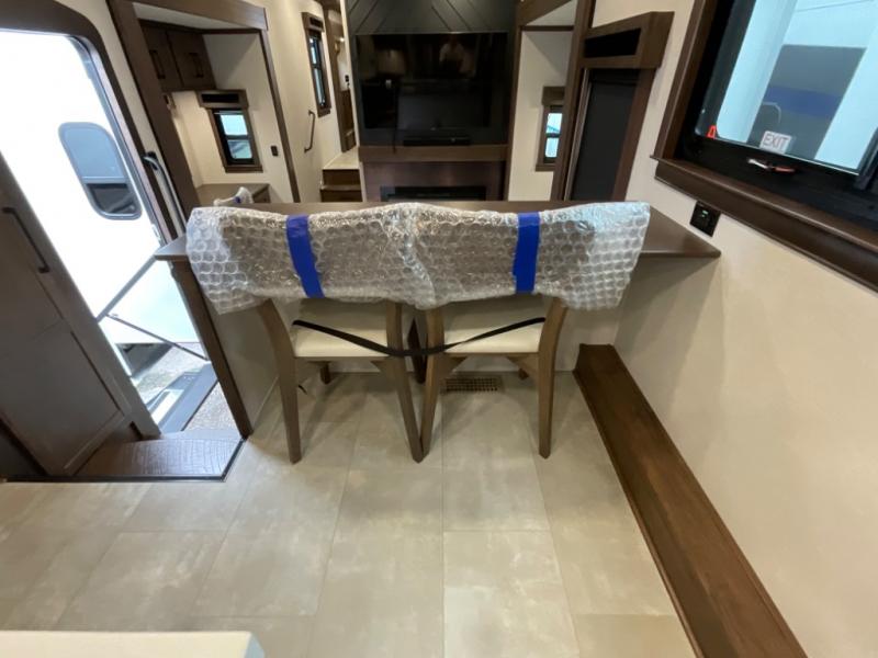You will feel right at home in this fifth wheel! The rear private bedroom has a 72" x 80" king bed slide for a good night's rest, a rear large wardrobe with the washer and dryer next to it, and even a dresser with a 40" LED TV. And two can get ready at once in the full bathroom with the dual sink vanity. You can then head to either the desk slide to get some work done or whip up some scrambled eggs on the three burner cooktop at the island in the front kitchen. The kitchen even has a dishwasher for easy clean up and two bar stools at the high top dinette that overlooks the middle living area. Relax each night in true comfort on either the E-Z Glide sofa bed slide or the theater seating across from the entertainment center which has a fireplace and 65" Samsung LED Smart TV to watch your favorite movies!