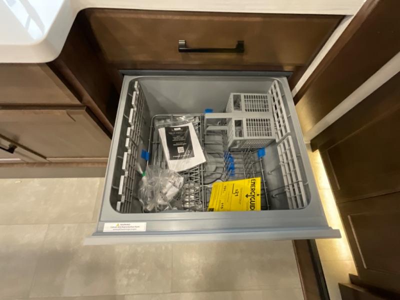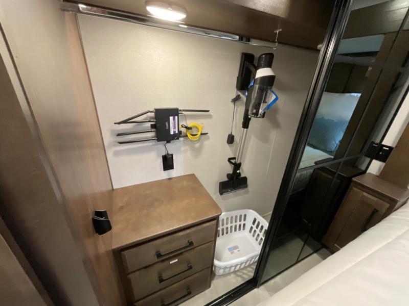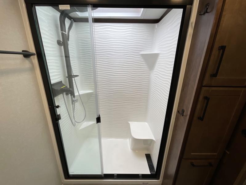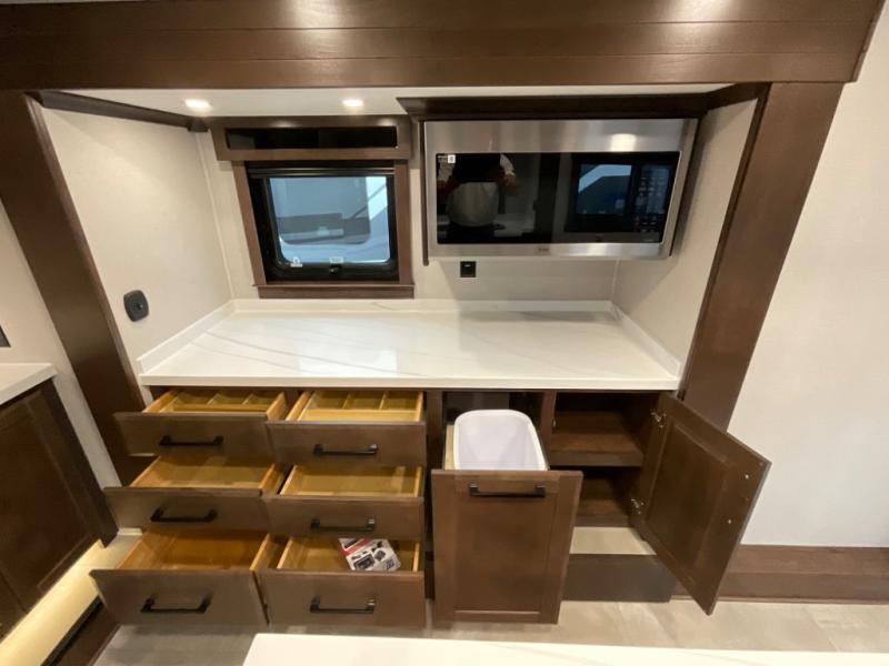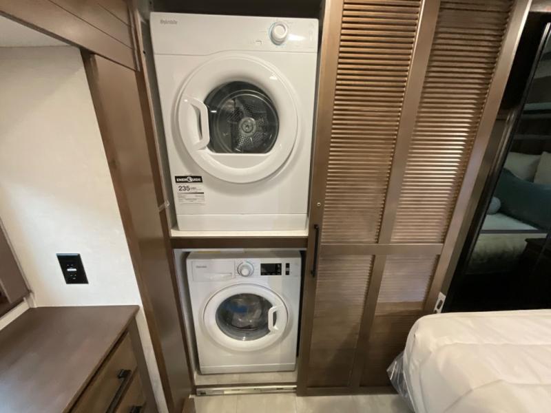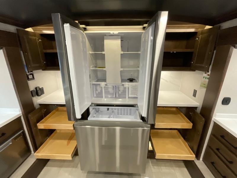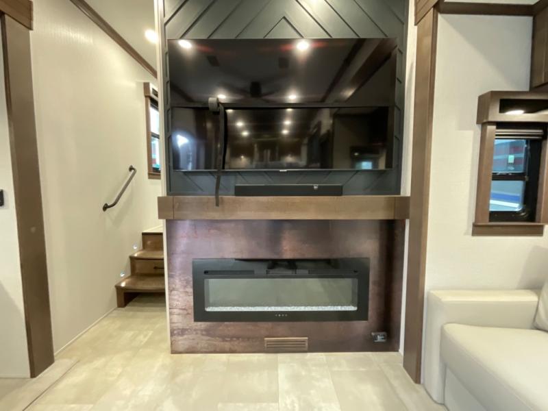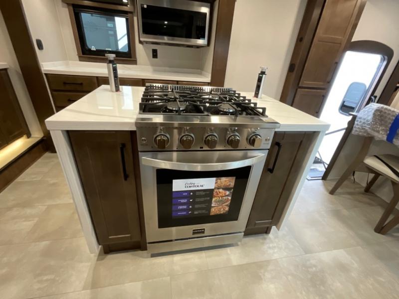 You will feel right at home in this fifth wheel! The rear private bedroom has a 72" x 80" king bed slide for a good night's rest, a rear large wardrobe with the washer and dryer next to it, and even a dresser with a 40" LED TV. And two can get ready at once in the full bathroom with the dual sink vanity. You can then head to either the desk slide to get some work done or whip up some scrambled eggs on the three burner cooktop at the island in the front kitchen. The kitchen even has a dishwasher for easy clean up and two bar stools at the high top dinette that overlooks the middle living area. Relax each night in true comfort on either the E-Z Glide sofa bed slide or the theater seating across from the entertainment center which has a fireplace and 65" Samsung LED Smart TV to watch your favorite movies!