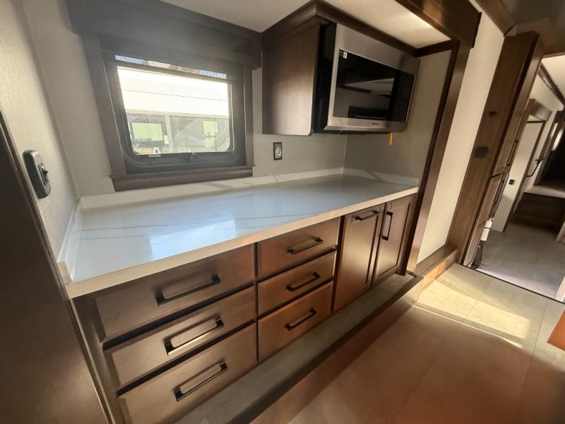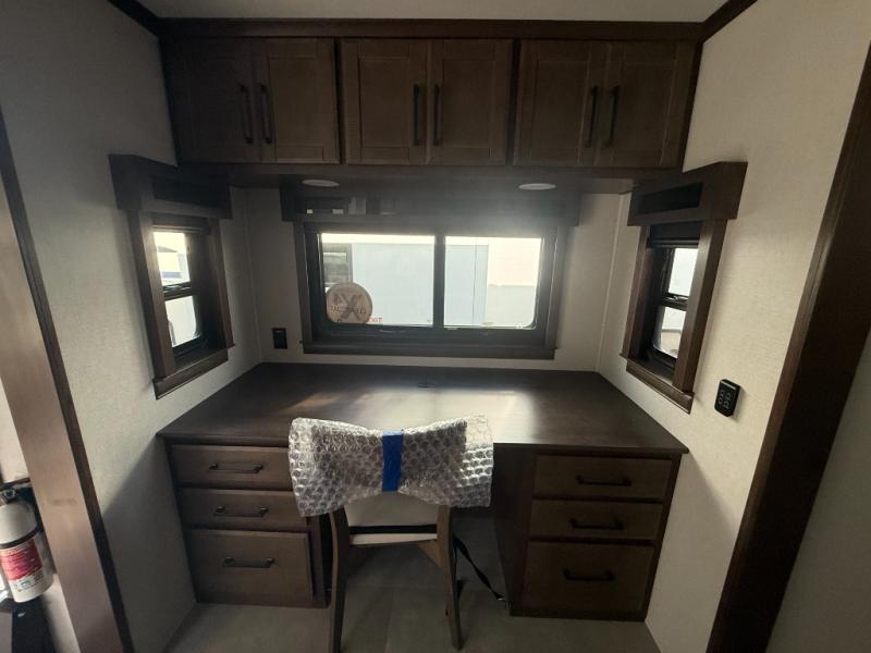 You will feel right at home in this fifth wheel! The rear private bedroom has a 72" x 80" king bed slide for a good night's rest, a rear large wardrobe with the washer and dryer next to it, and even a dresser with a 40" LED TV. And two can get ready at once in the full bathroom with the dual sink vanity. You can then head to either the desk slide to get some work done or whip up some scrambled eggs on the three burner cooktop at the island in the front kitchen. The kitchen even has a dishwasher for easy clean up and two bar stools at the high top dinette that overlooks the middle living area. Relax each night in true comfort on either the E-Z Glide sofa bed slide or the theater seating across from the entertainment center which has a fireplace and 65" Samsung LED Smart TV to watch your favorite movies!