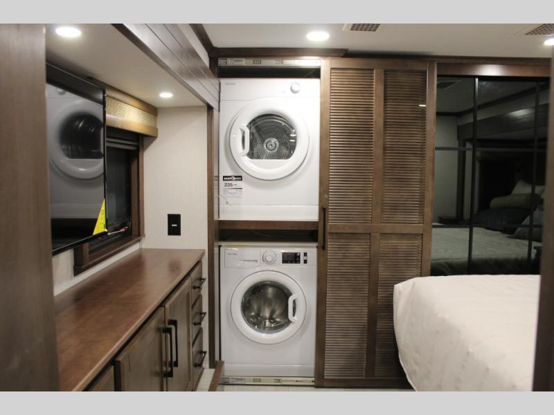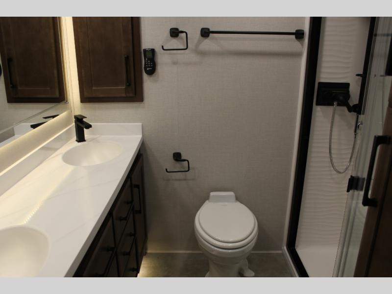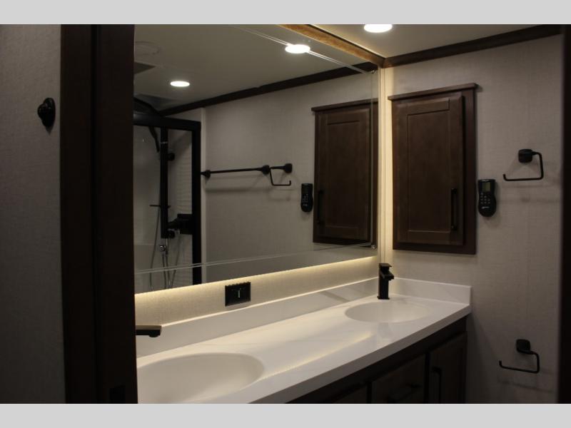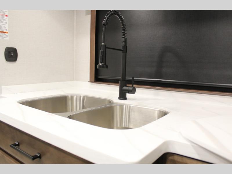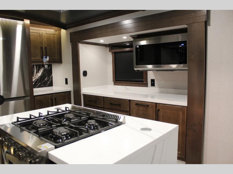The Forest River RiverStone fifth wheels and toy haulers are luxurious units that have it all! You'll find an automatic six-point hydraulic level-up system to keep your unit in place, and there is preparation for a four-camera observation system. The TravlFi Journey XTR 4G/LTE router and WiFi extender will help you stay connected to the outside world, and you'll never have to overpack again since the Splendid “Astral” stackable washer and dryer will let you clean the small amount of clothes you've brought with you. Another high luxury is the Fischer Paykal dishwasher which will allow you to spend more time enjoying your camp life and less time cleaning up. Each unit is built with a LCI Road Armour suspension system, dual-pane frameless windows, a full docking station, a 200W solar panel, and a BMPro touch control system.
