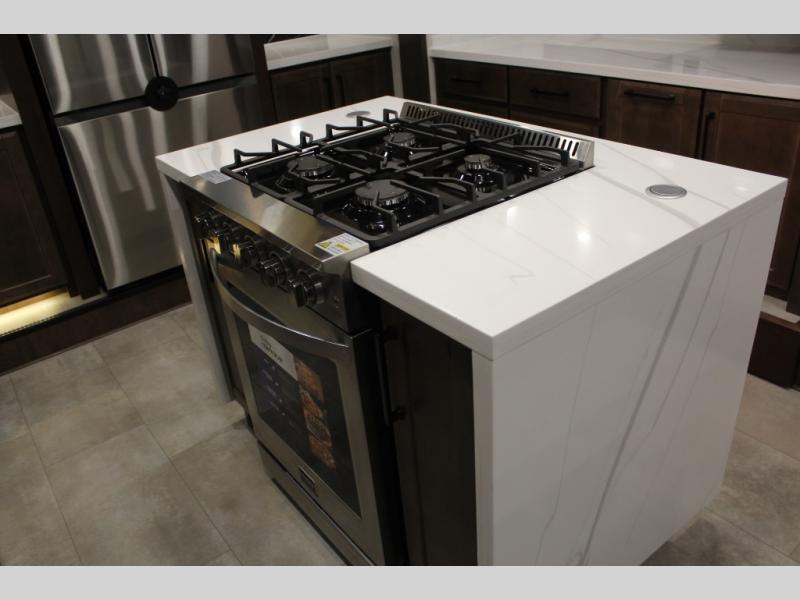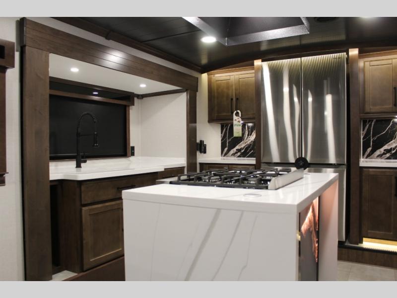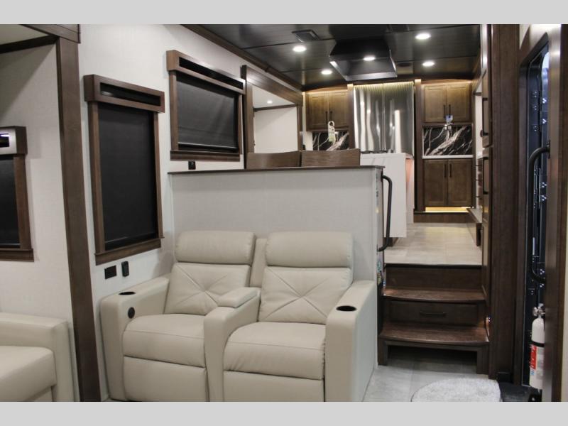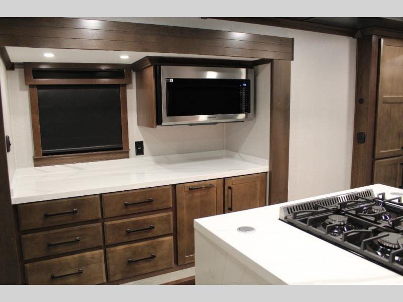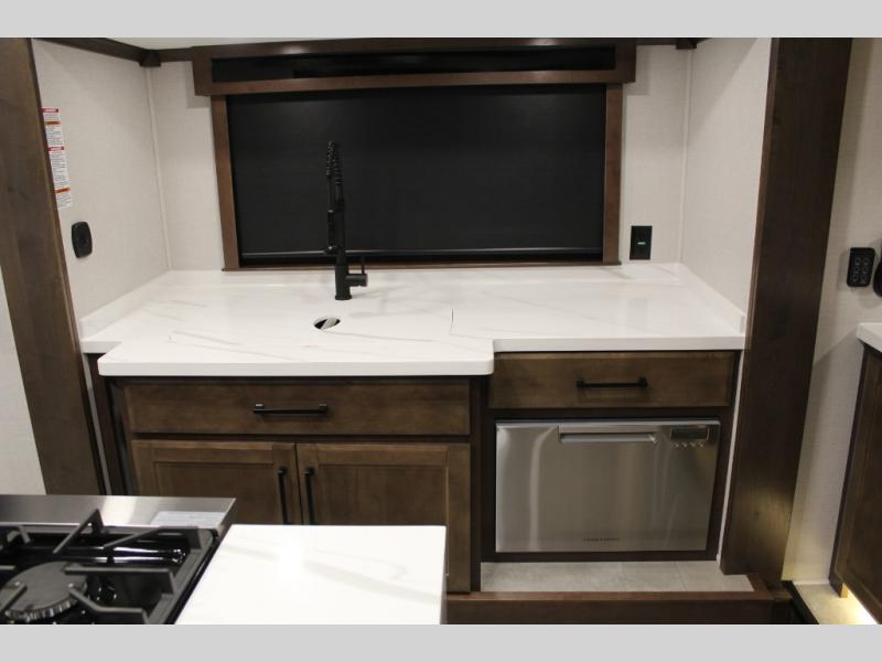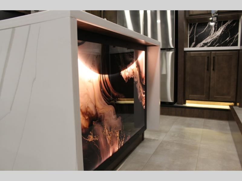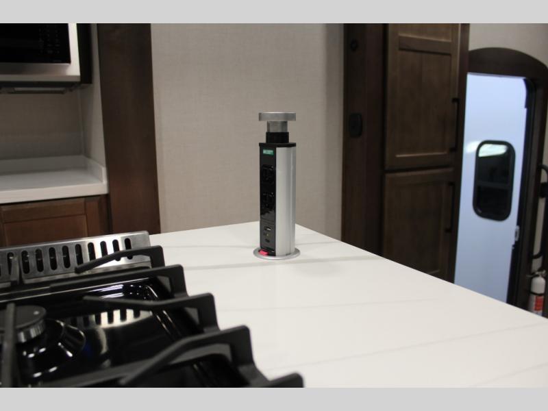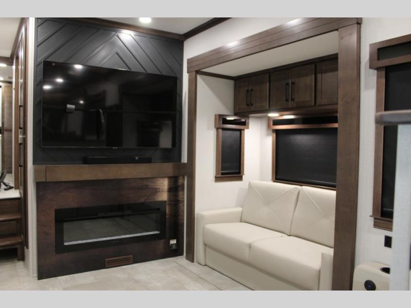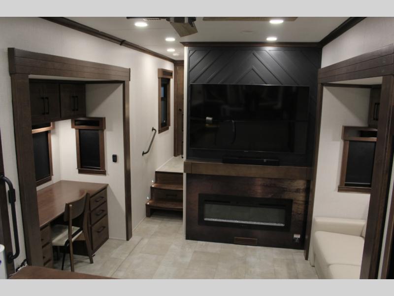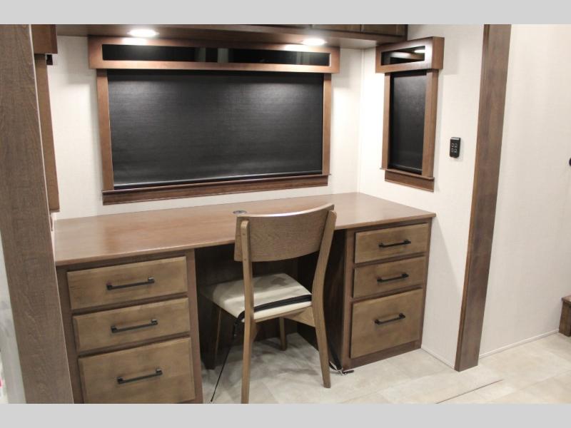 You will feel right at home in this fifth wheel! The rear private bedroom has a 72" x 80" king bed slide for a good night's rest, a rear large wardrobe with the washer and dryer next to it, and even a dresser with a 40" LED TV. And two can get ready at once in the full bathroom with the dual sink vanity. You can then head to either the desk slide to get some work done or whip up some scrambled eggs on the three burner cooktop at the island in the front kitchen. The kitchen even has a dishwasher for easy clean up and two bar stools at the high top dinette that overlooks the middle living area. Relax each night in true comfort on either the E-Z Glide sofa bed slide or the theater seating across from the entertainment center which has a fireplace and 65" Samsung LED Smart TV to watch your favorite movies!