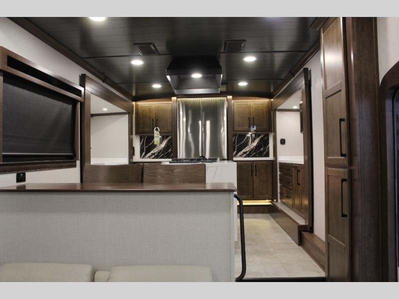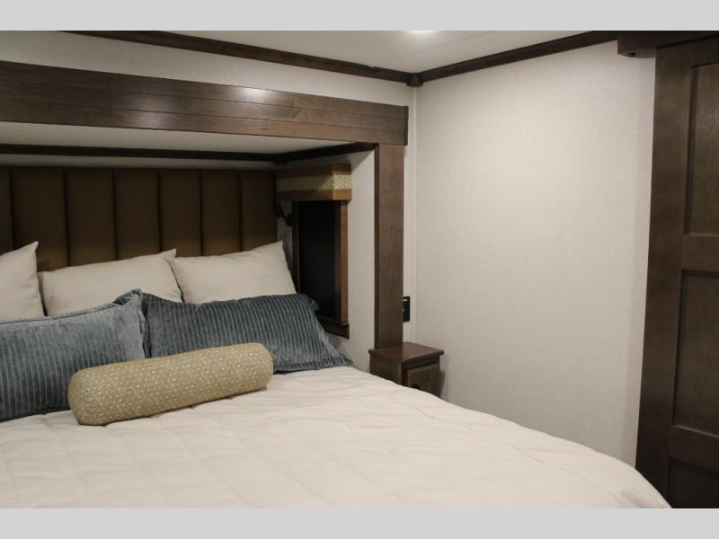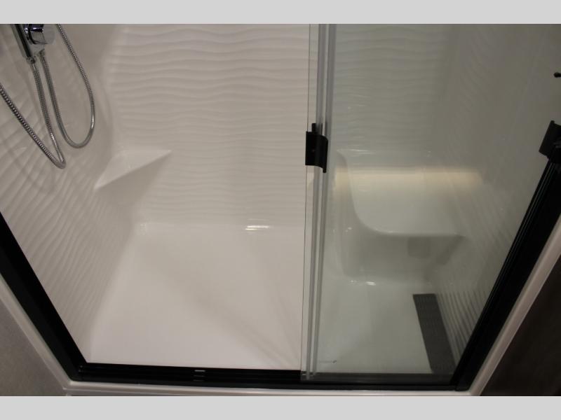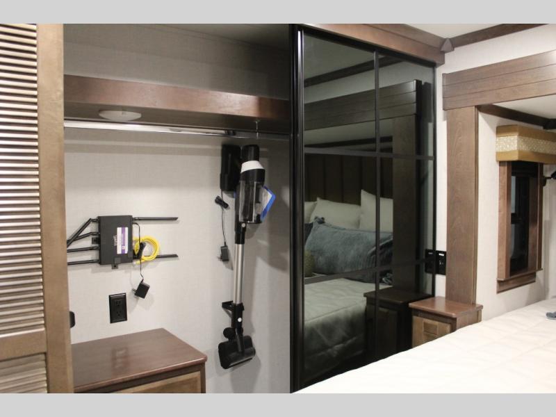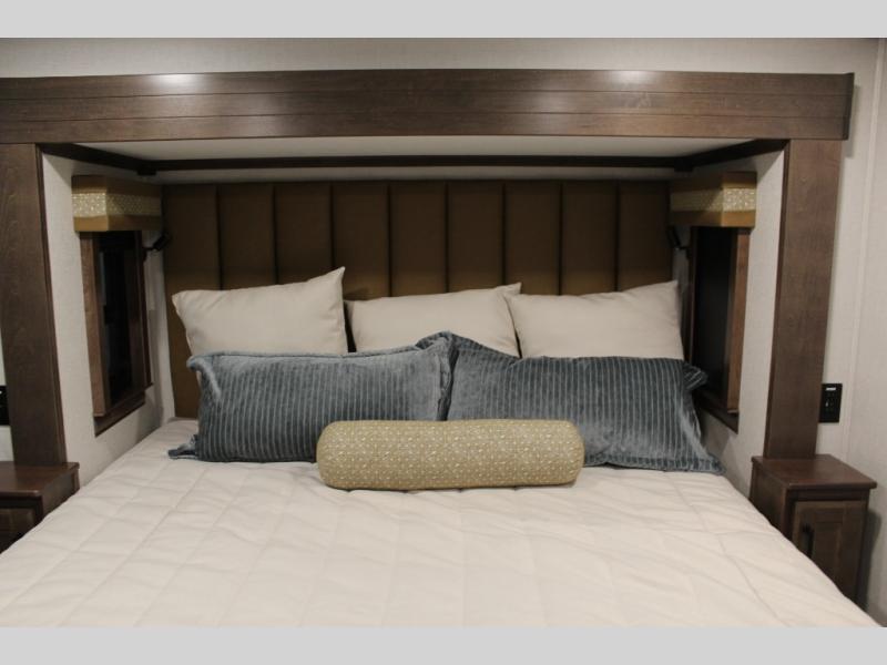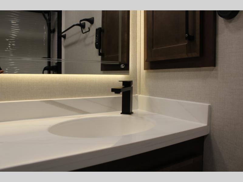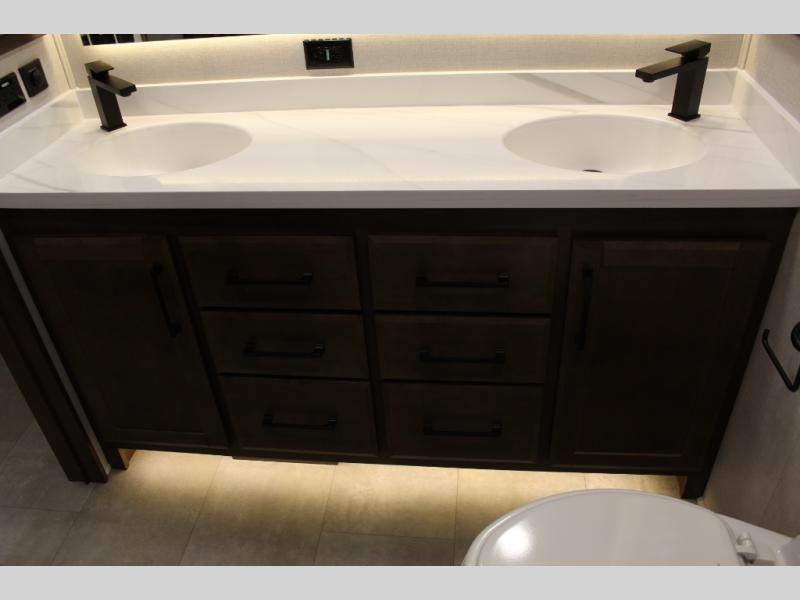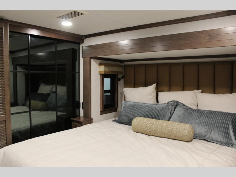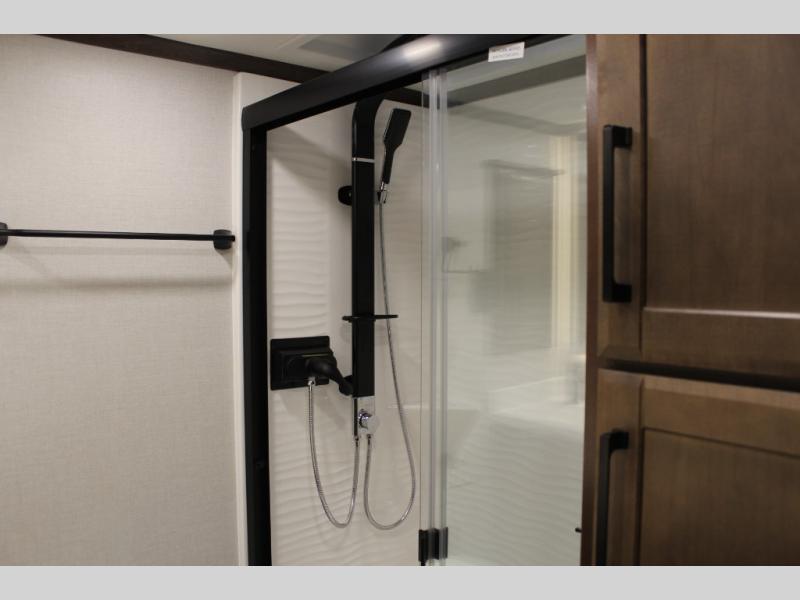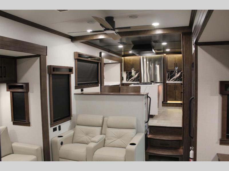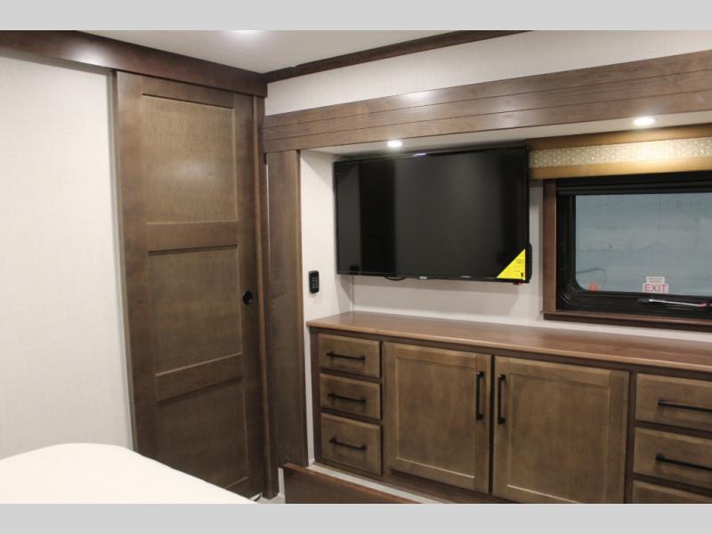 You will feel right at home in this fifth wheel! The rear private bedroom has a 72" x 80" king bed slide for a good night's rest, a rear large wardrobe with the washer and dryer next to it, and even a dresser with a 40" LED TV. And two can get ready at once in the full bathroom with the dual sink vanity. You can then head to either the desk slide to get some work done or whip up some scrambled eggs on the three burner cooktop at the island in the front kitchen. The kitchen even has a dishwasher for easy clean up and two bar stools at the high top dinette that overlooks the middle living area. Relax each night in true comfort on either the E-Z Glide sofa bed slide or the theater seating across from the entertainment center which has a fireplace and 65" Samsung LED Smart TV to watch your favorite movies!