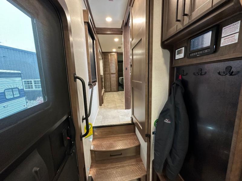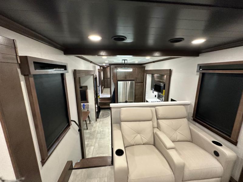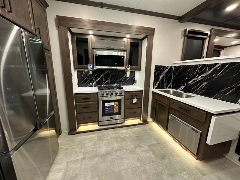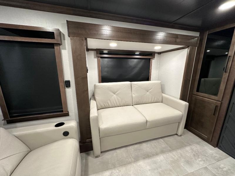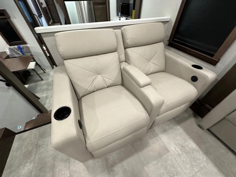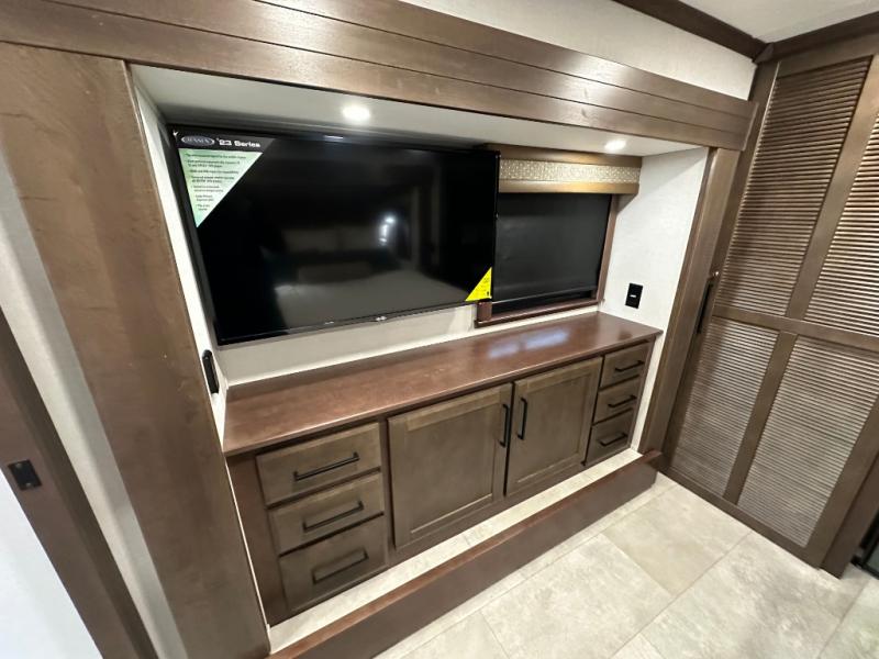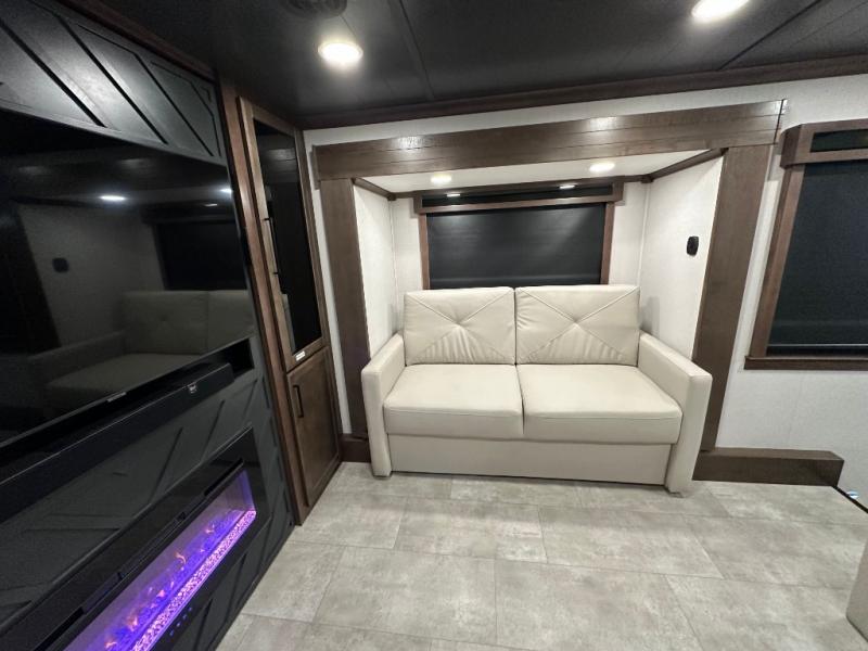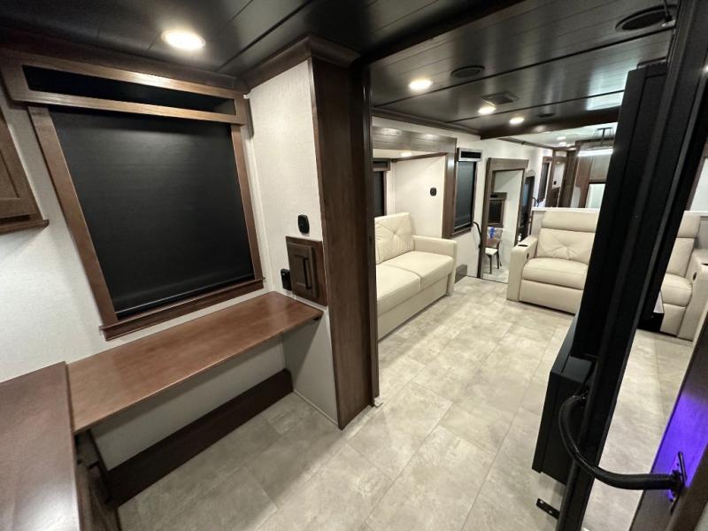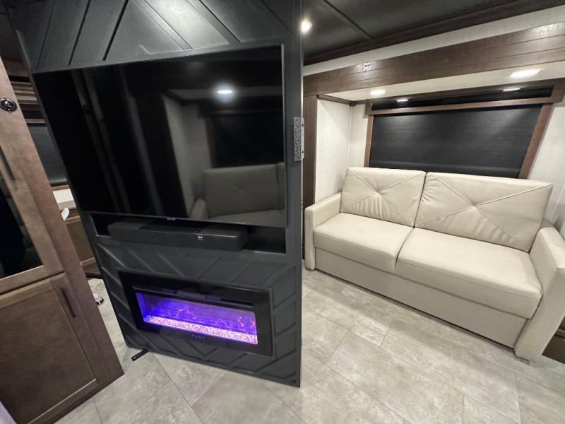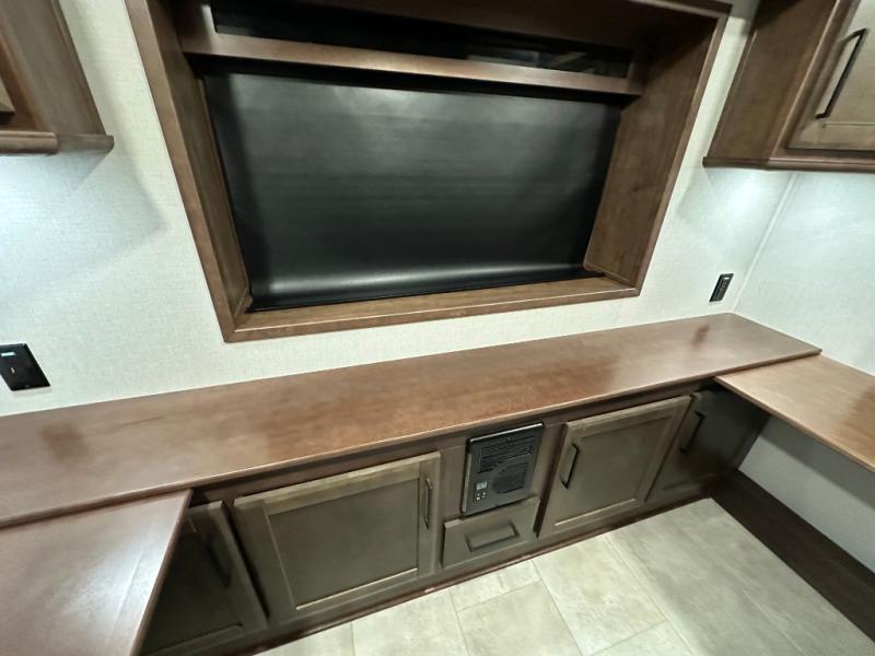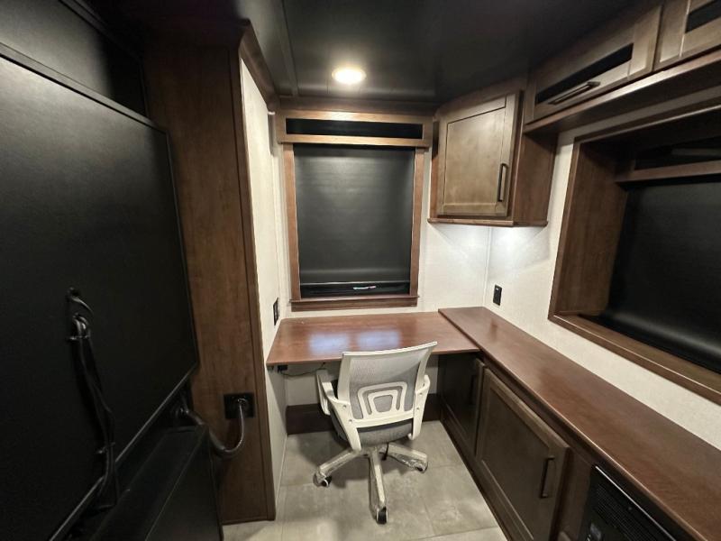 Pack your bags and head to your most comfortable camping trip ever in this award winning fifth wheel! The rear private bedroom has a 72" x 80" king bed slide for a good night's rest, a rear large wardrobe with the washer and dryer next to it, and even a dresser with a 40" LED TV. Get ready in the full bathroom with the shower then head to either the pull-out dinette to read the morning paper or whip up some scrambled eggs on the three burner cooktop in the middle kitchen. The kitchen even has two pantries for all your favorite snacks and a coat rack to hang your jacket. You can relax in the evenings on the two E-Z Glide sofa beds or the theater sofa across from the 65" Samsung LED Smart TV. What's behind the swiveling entertainment center is where the real convenience is found with this model; a hidden front office with ample counter space to get your work done!