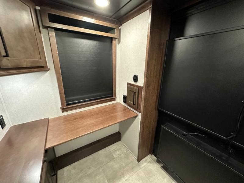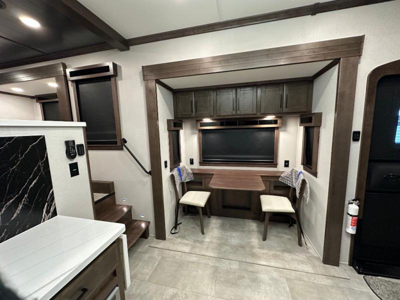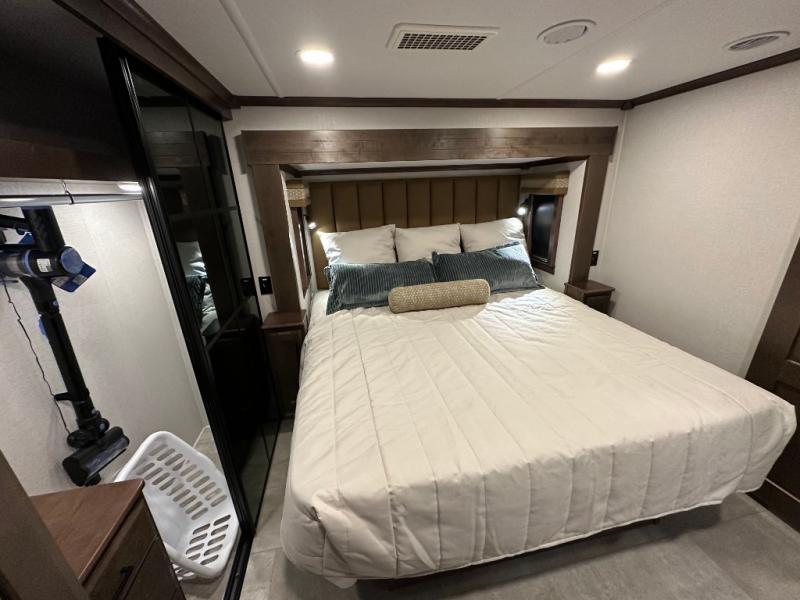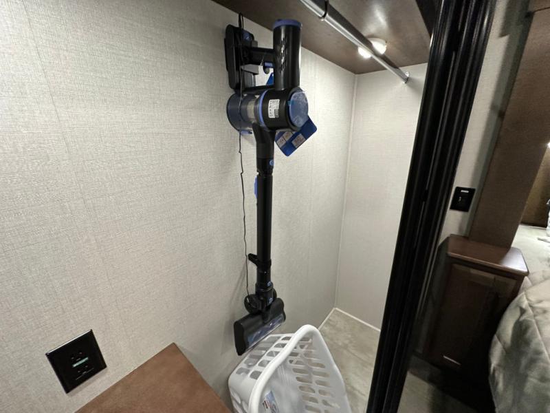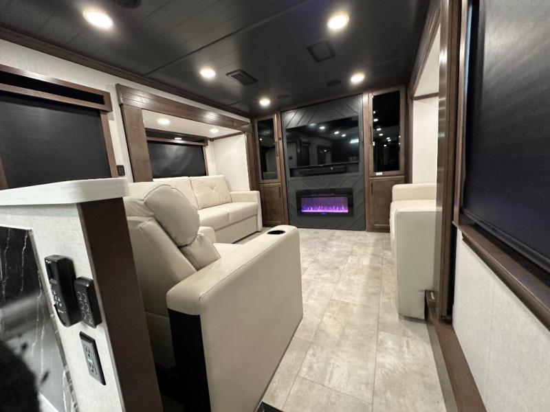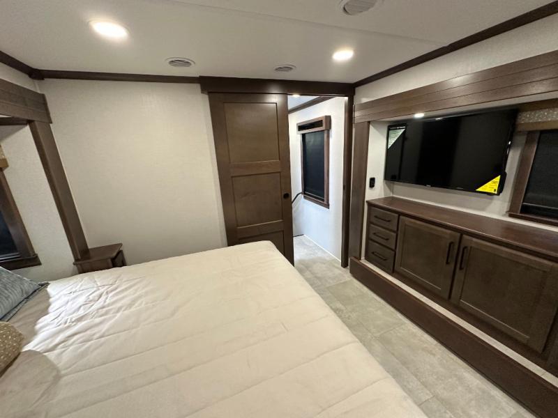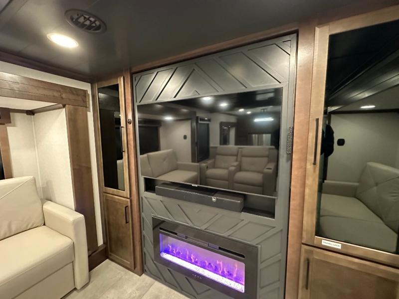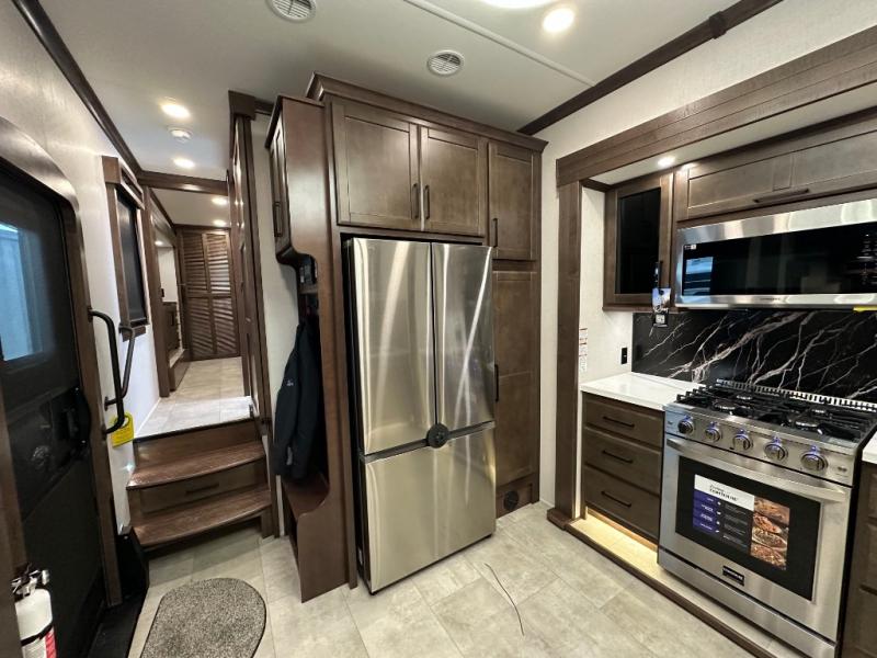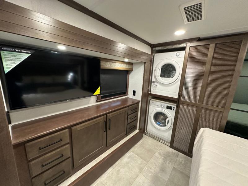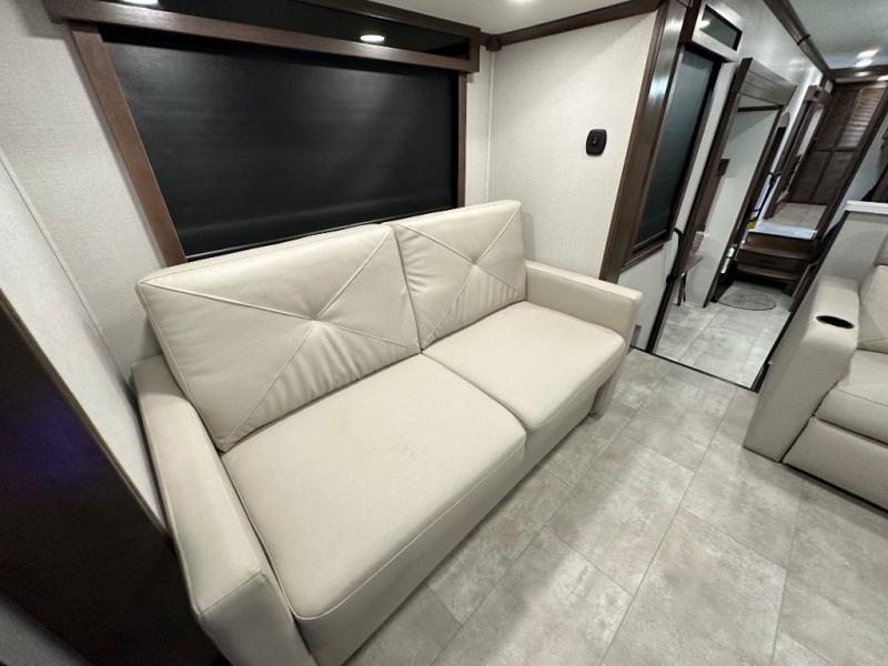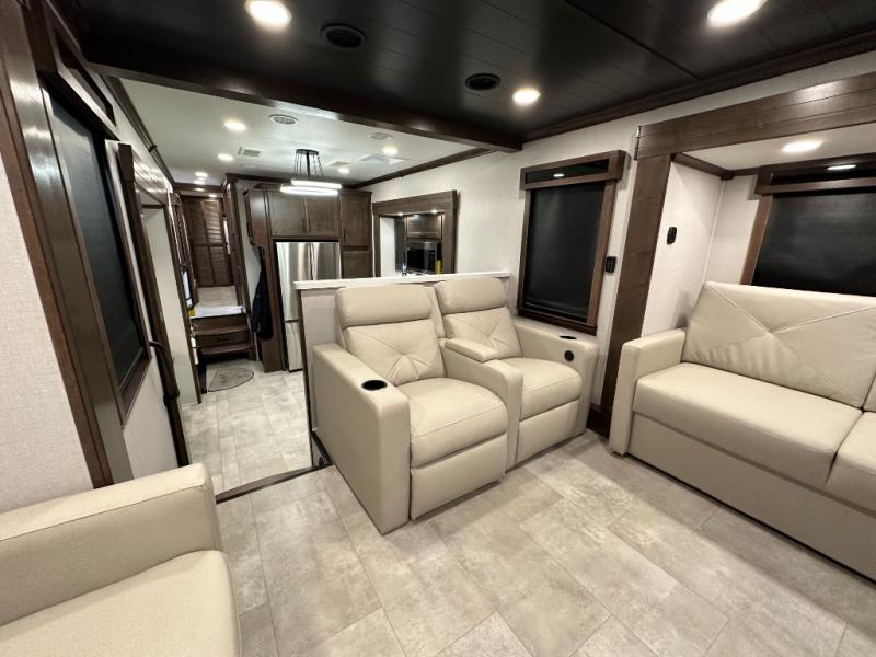 Pack your bags and head to your most comfortable camping trip ever in this award winning fifth wheel! The rear private bedroom has a 72" x 80" king bed slide for a good night's rest, a rear large wardrobe with the washer and dryer next to it, and even a dresser with a 40" LED TV. Get ready in the full bathroom with the shower then head to either the pull-out dinette to read the morning paper or whip up some scrambled eggs on the three burner cooktop in the middle kitchen. The kitchen even has two pantries for all your favorite snacks and a coat rack to hang your jacket. You can relax in the evenings on the two E-Z Glide sofa beds or the theater sofa across from the 65" Samsung LED Smart TV. What's behind the swiveling entertainment center is where the real convenience is found with this model; a hidden front office with ample counter space to get your work done!