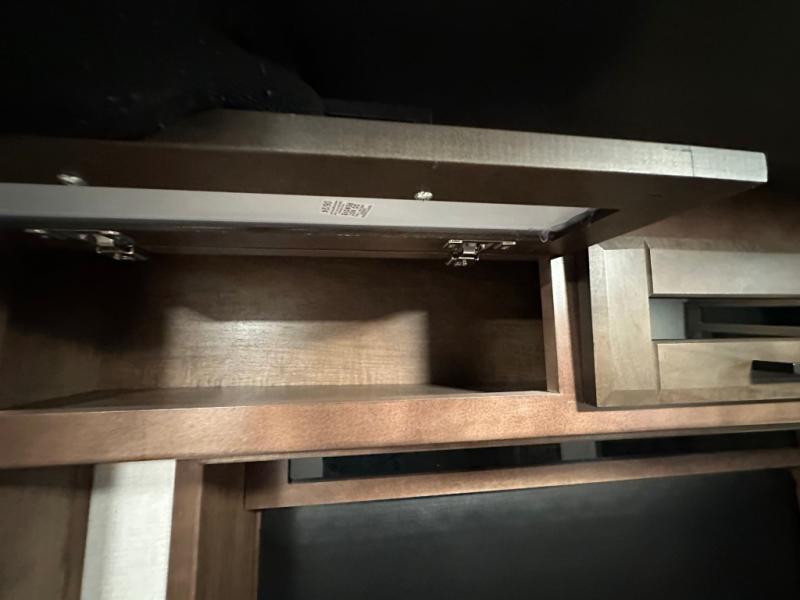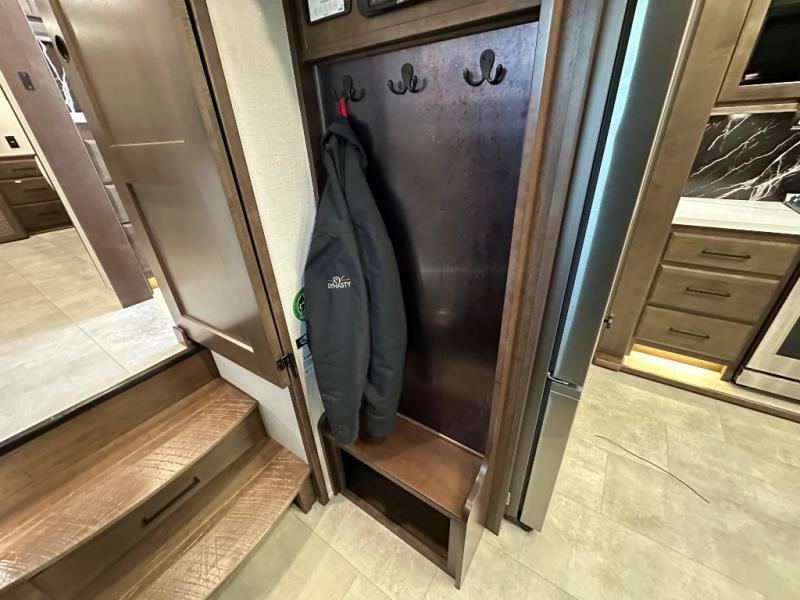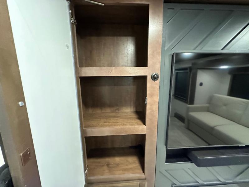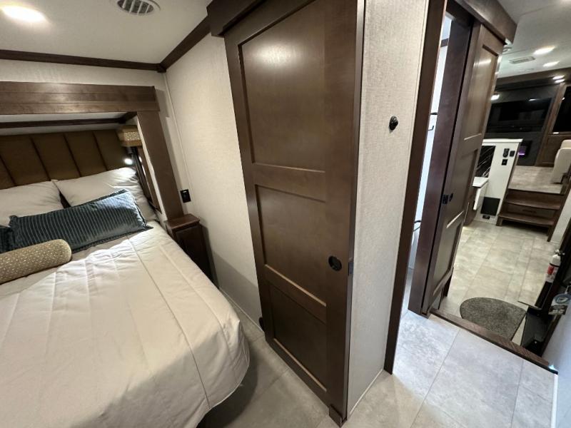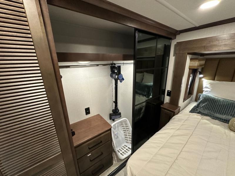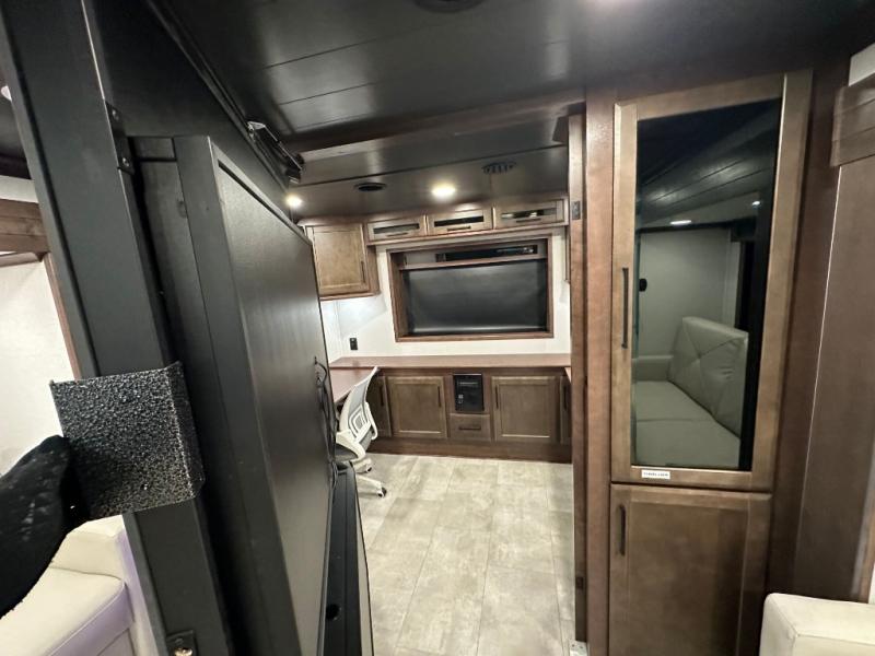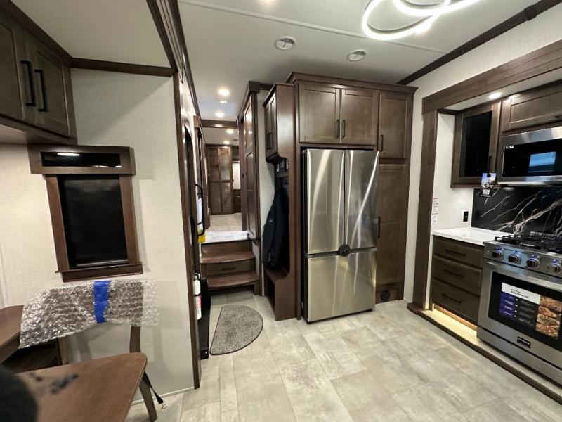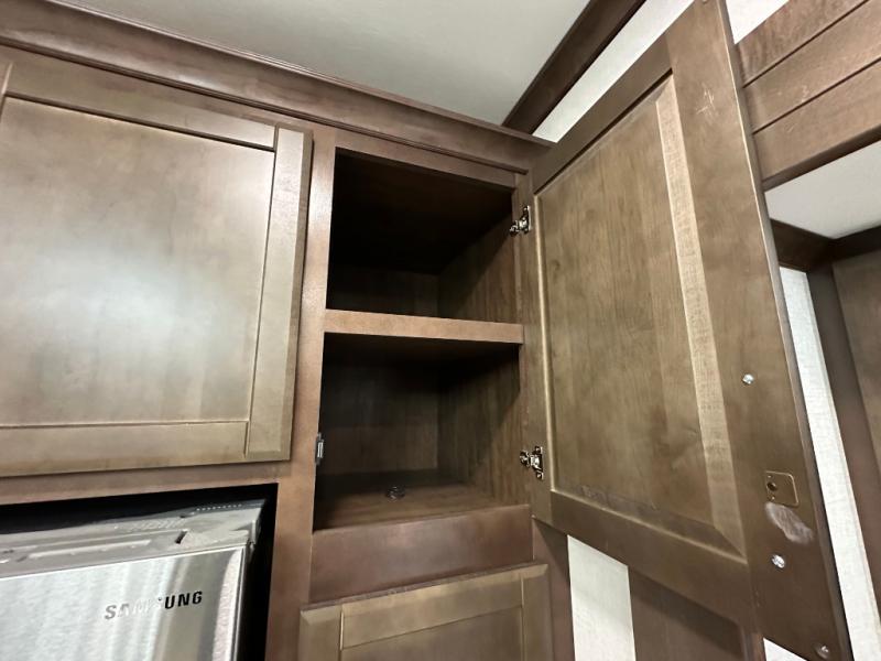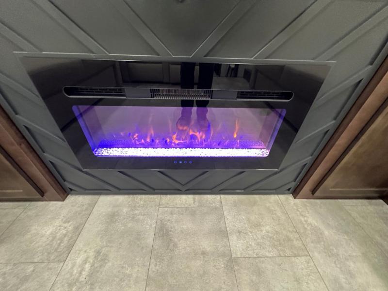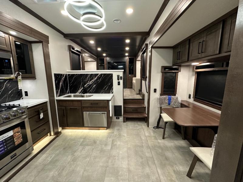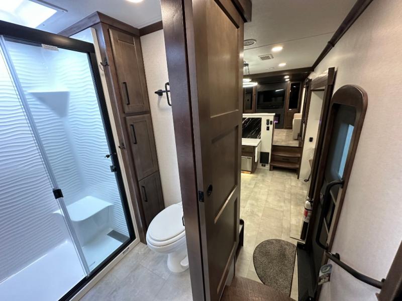 Pack your bags and head to your most comfortable camping trip ever in this award winning fifth wheel! The rear private bedroom has a 72" x 80" king bed slide for a good night's rest, a rear large wardrobe with the washer and dryer next to it, and even a dresser with a 40" LED TV. Get ready in the full bathroom with the shower then head to either the pull-out dinette to read the morning paper or whip up some scrambled eggs on the three burner cooktop in the middle kitchen. The kitchen even has two pantries for all your favorite snacks and a coat rack to hang your jacket. You can relax in the evenings on the two E-Z Glide sofa beds or the theater sofa across from the 65" Samsung LED Smart TV. What's behind the swiveling entertainment center is where the real convenience is found with this model; a hidden front office with ample counter space to get your work done!