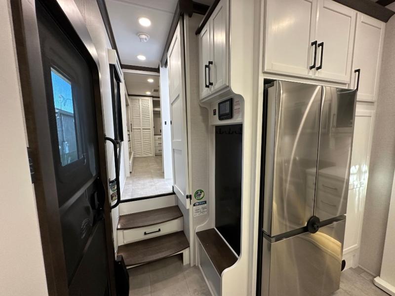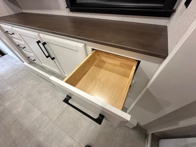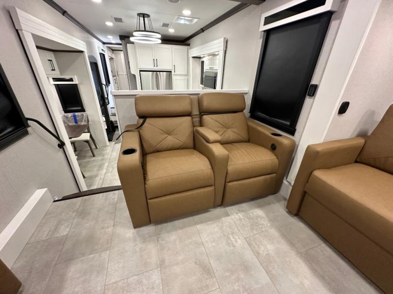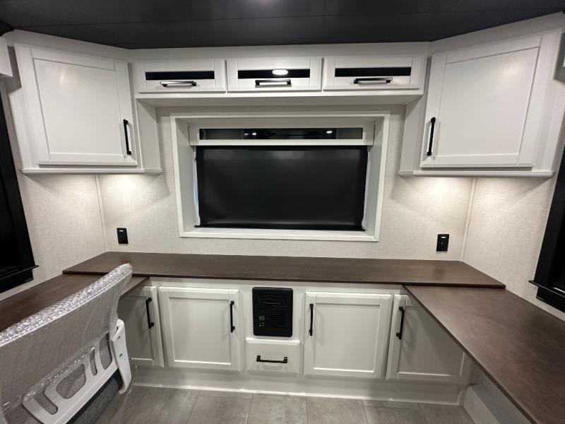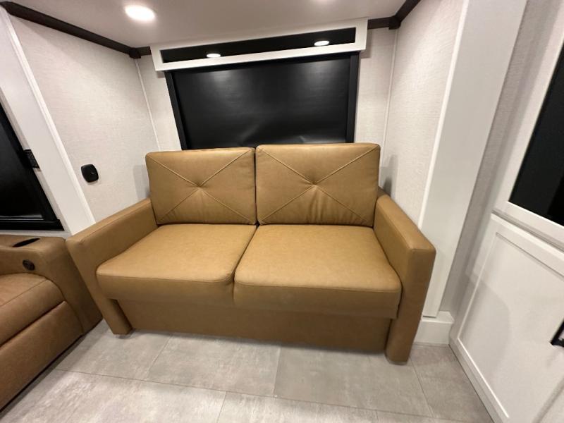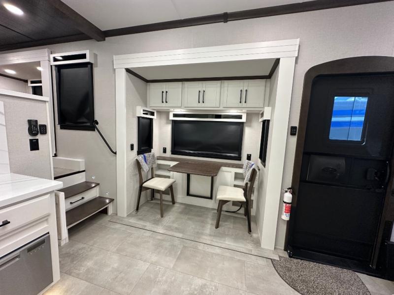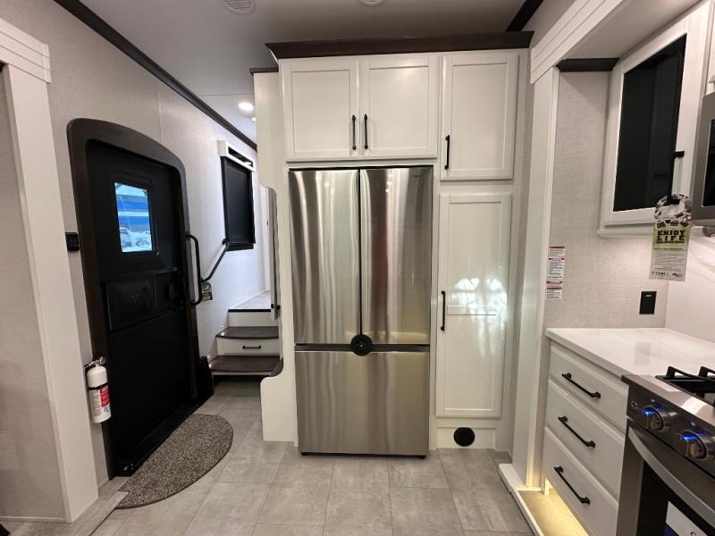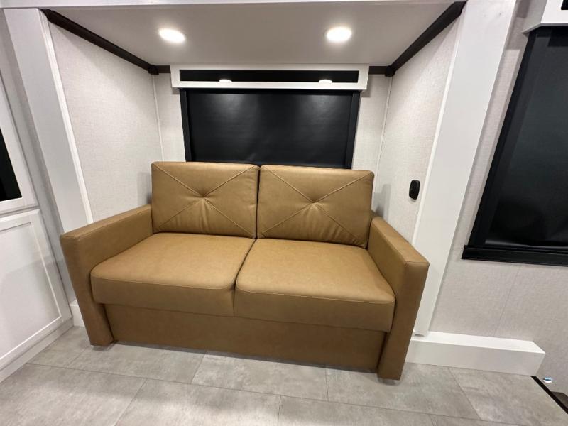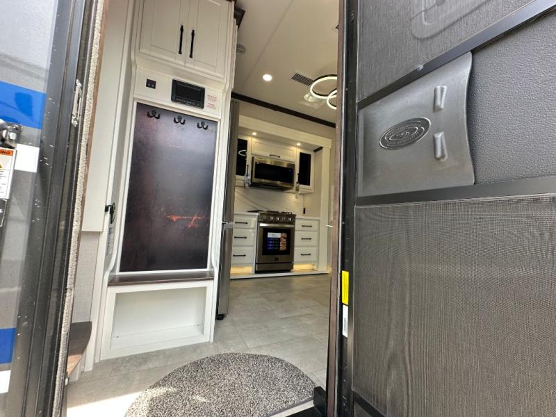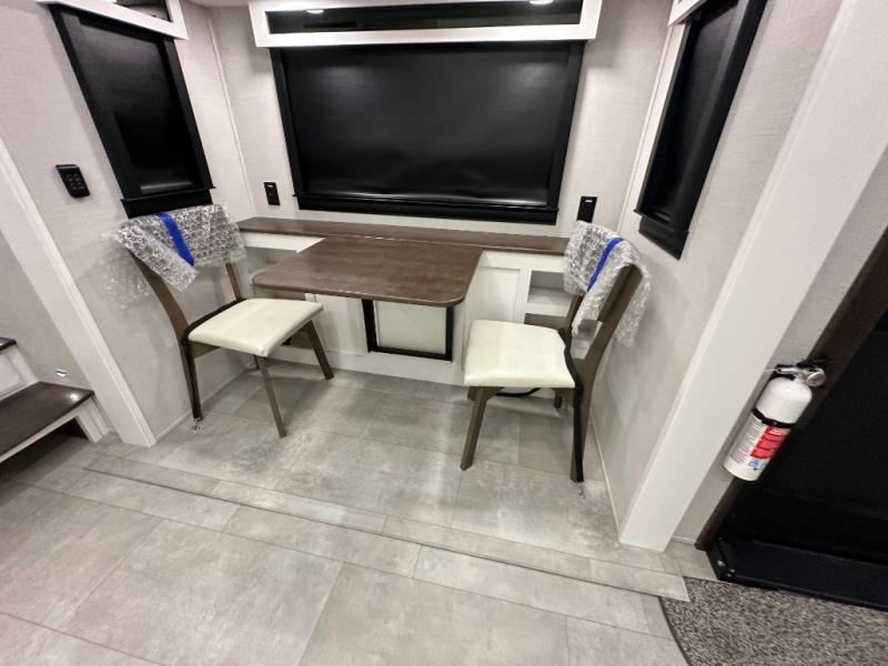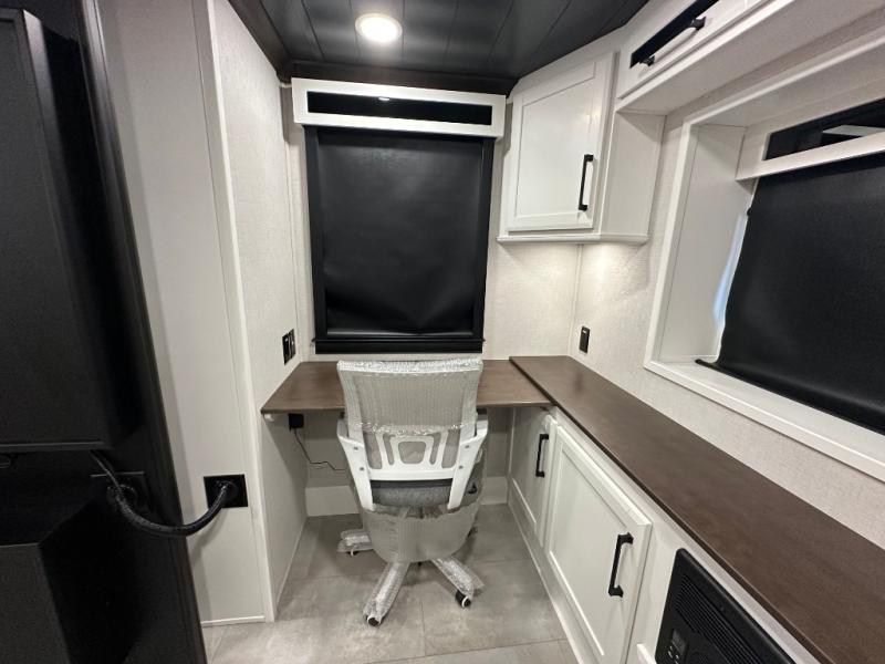 Pack your bags and head to your most comfortable camping trip ever in this packed out fifth wheel! The rear private bedroom has a 72" x 80" king bed slide for a good night's rest, a rear large wardrobe with the washer and dryer next to it, and even a dresser with a 40" LED TV. Get ready in the full bathroom with the shower then head to either the pull-out dinette to read the morning paper or whip up some scrambled eggs on the three burner cooktop in the middle kitchen. The kitchen even has two pantries for all your favorite snacks and a coat rack to hang your jacket. You can relax in the evenings on the two E-Z Glide sofa beds or the theater sofa across from the Samsung LED Smart TV. What's behind the swiveling entertainment center is where the real convenience is found with this model; a hidden front office with ample counter space to get your work done!