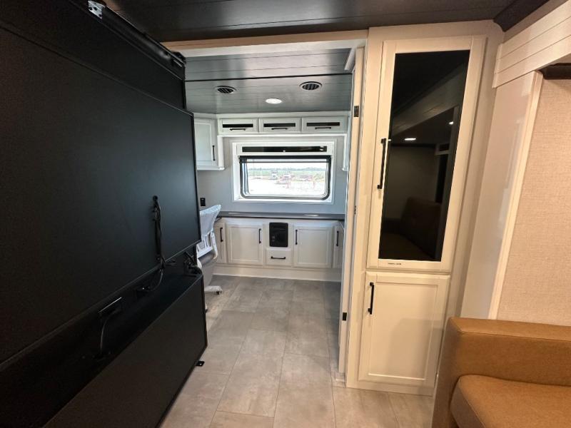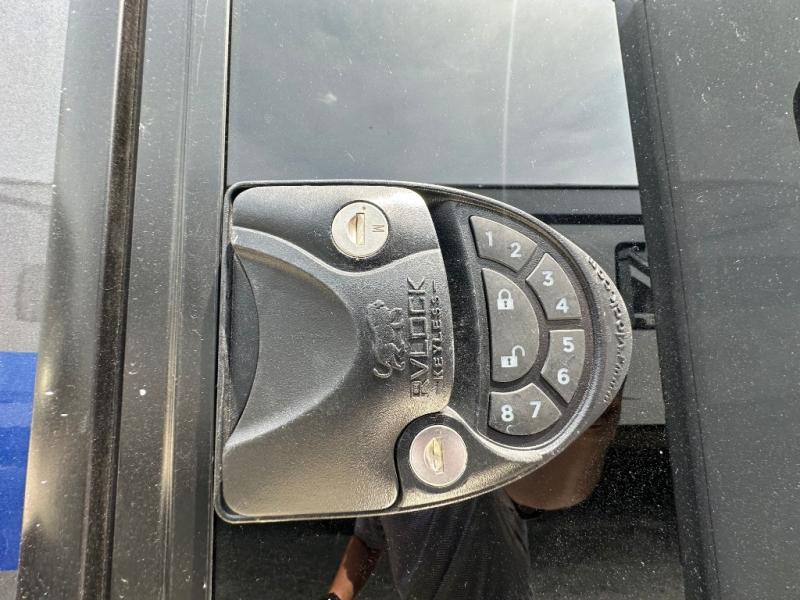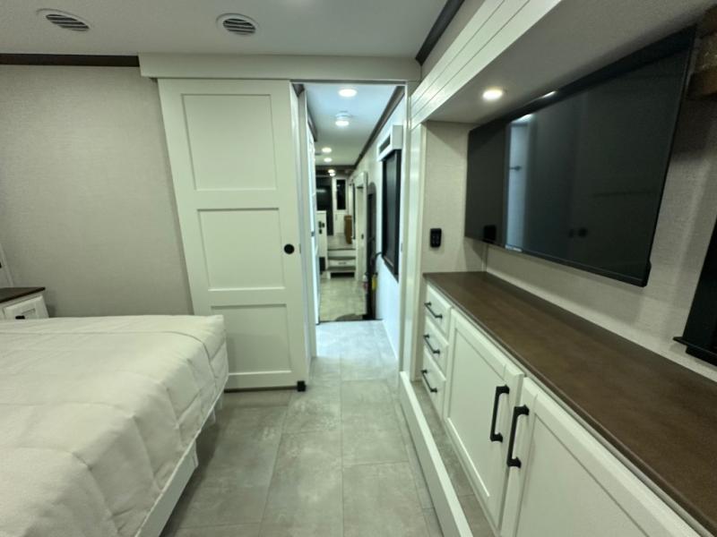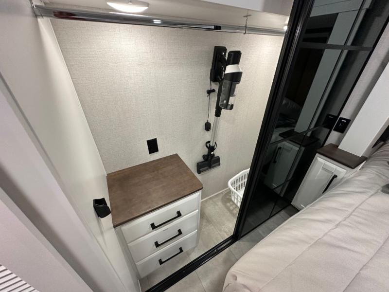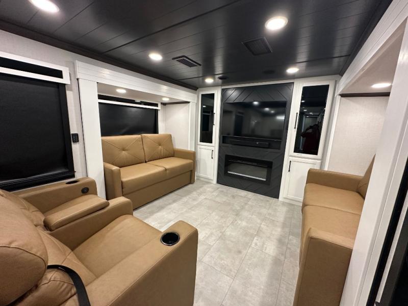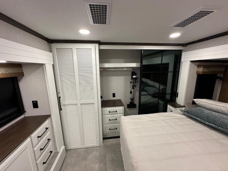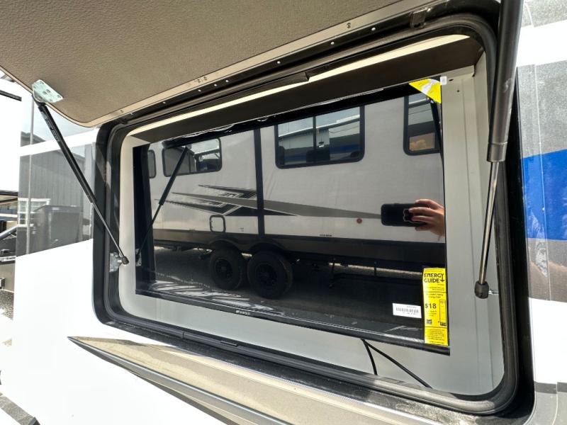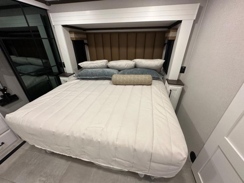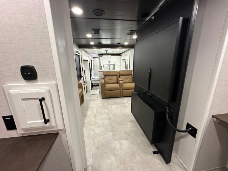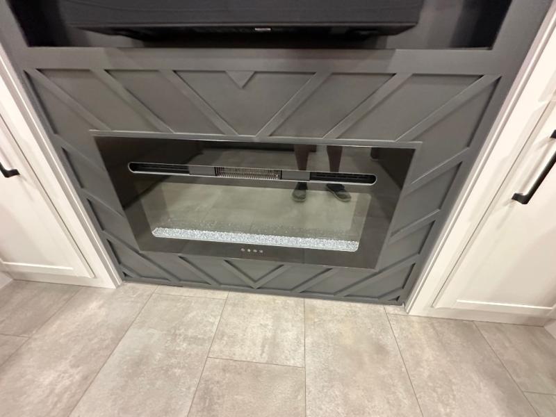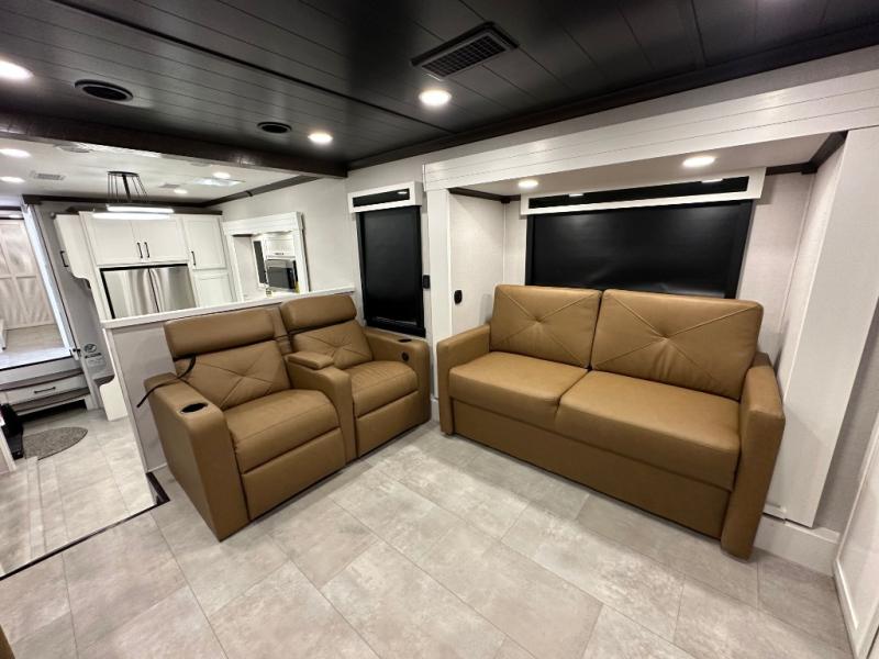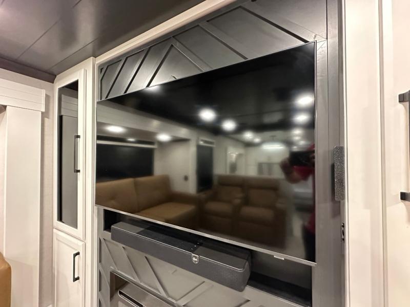 Pack your bags and head to your most comfortable camping trip ever in this packed out fifth wheel! The rear private bedroom has a 72" x 80" king bed slide for a good night's rest, a rear large wardrobe with the washer and dryer next to it, and even a dresser with a 40" LED TV. Get ready in the full bathroom with the shower then head to either the pull-out dinette to read the morning paper or whip up some scrambled eggs on the three burner cooktop in the middle kitchen. The kitchen even has two pantries for all your favorite snacks and a coat rack to hang your jacket. You can relax in the evenings on the two E-Z Glide sofa beds or the theater sofa across from the Samsung LED Smart TV. What's behind the swiveling entertainment center is where the real convenience is found with this model; a hidden front office with ample counter space to get your work done!