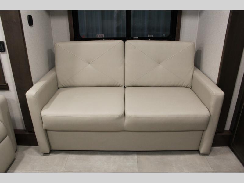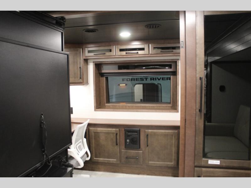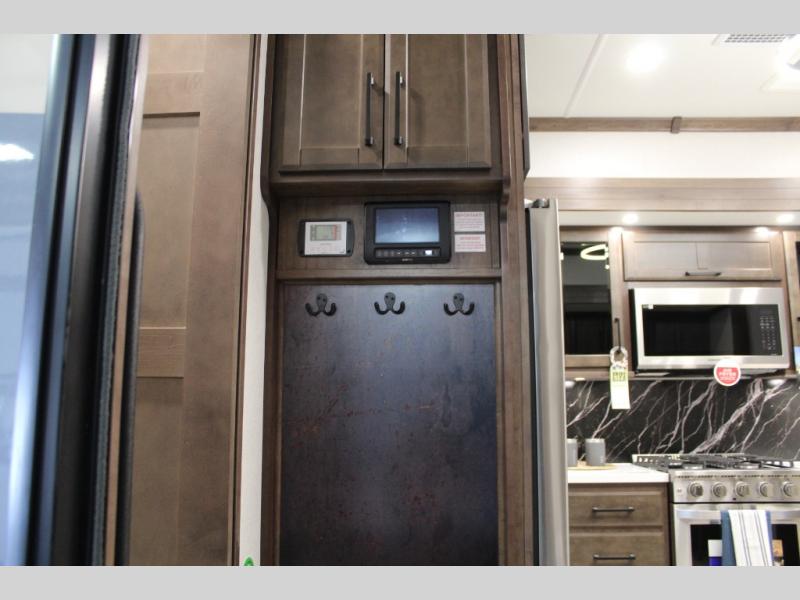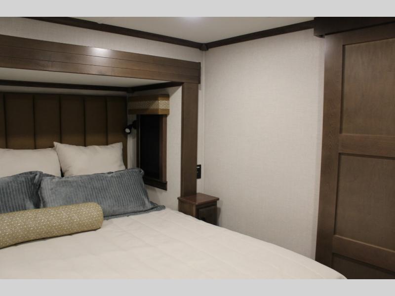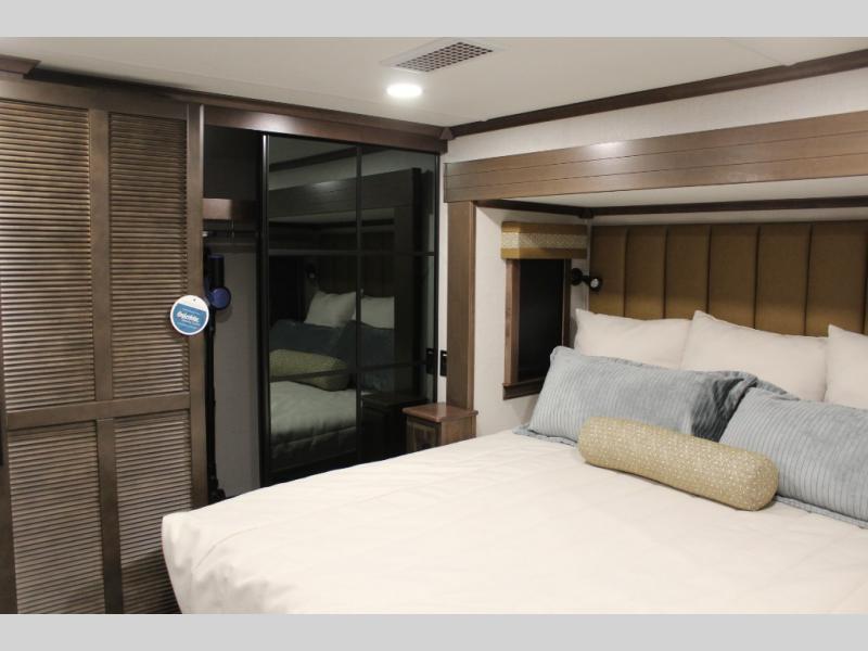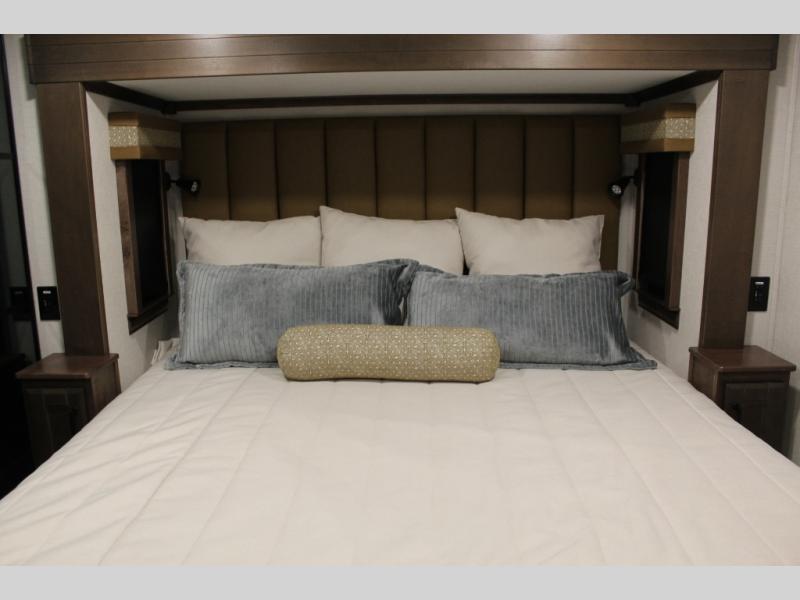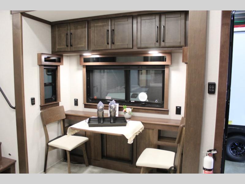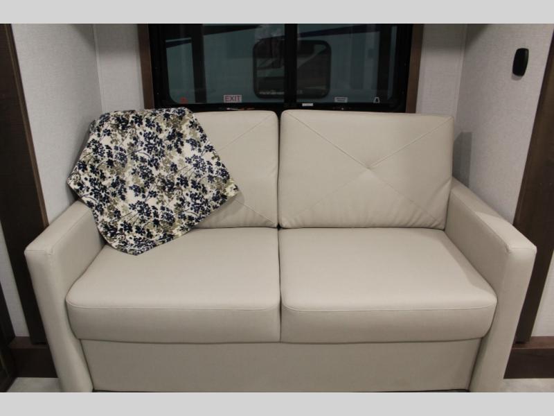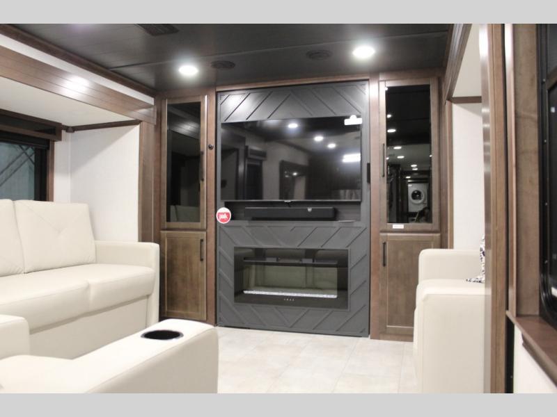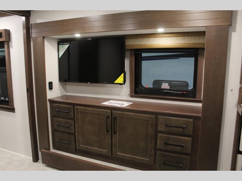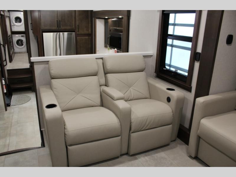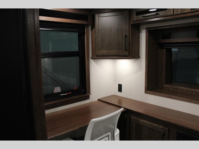 Pack your bags and head to your most comfortable camping trip ever in this packed out fifth wheel! The rear private bedroom has a 72" x 80" king bed slide for a good night's rest, a rear large wardrobe with the washer and dryer next to it, and even a dresser with a 40" LED TV. Get ready in the full bathroom with the shower then head to either the pull-out dinette to read the morning paper or whip up some scrambled eggs on the three burner cooktop in the middle kitchen. The kitchen even has two pantries for all your favorite snacks and a coat rack to hang your jacket. You can relax in the evenings on the two E-Z Glide sofa beds or the theater sofa across from the Samsung LED Smart TV. What's behind the swiveling entertainment center is where the real convenience is found with this model; a hidden front office with ample counter space to get your work done!
