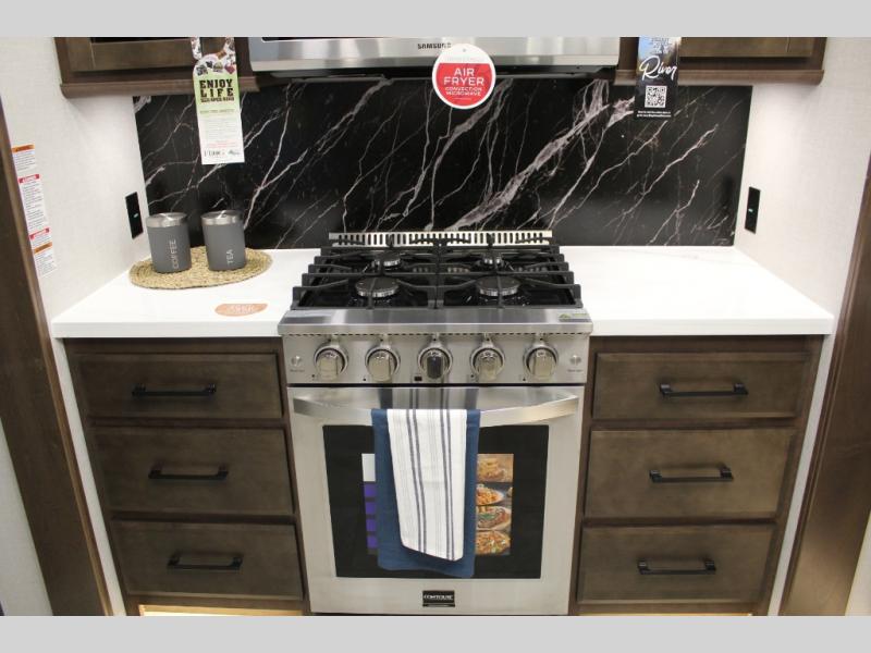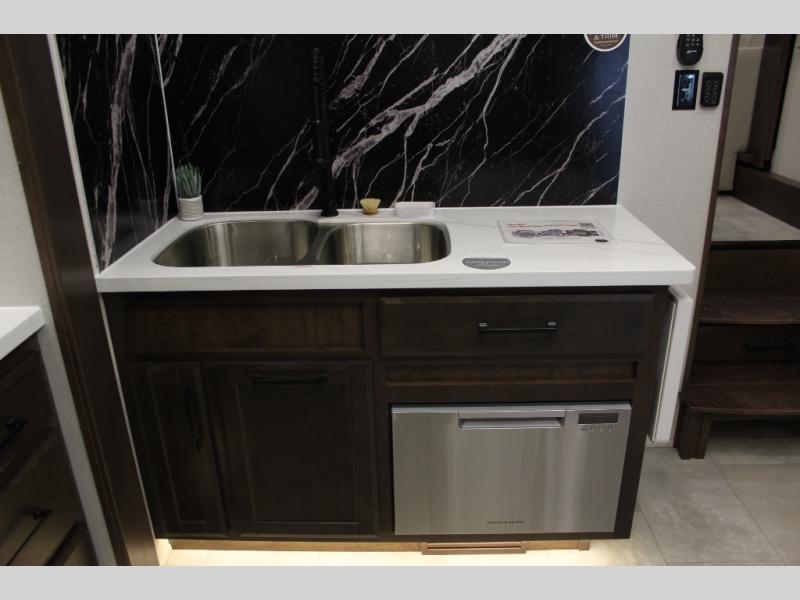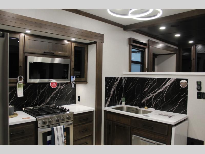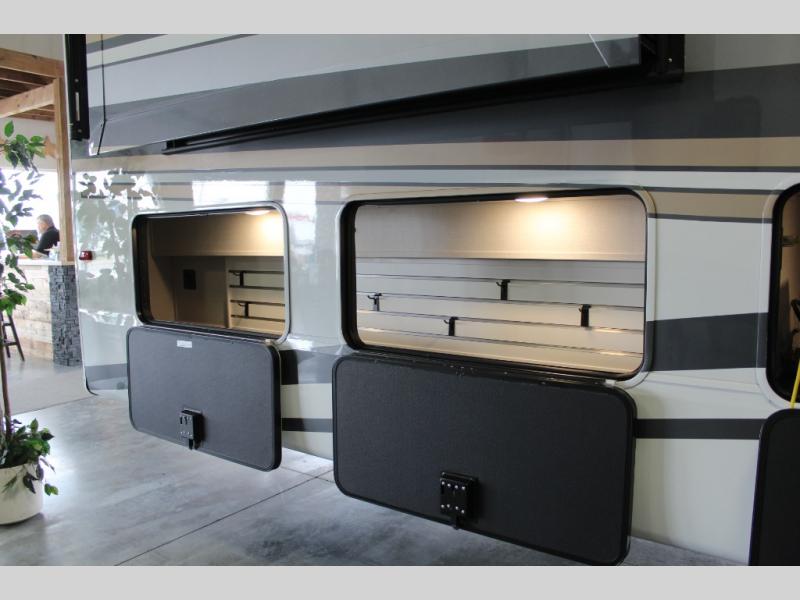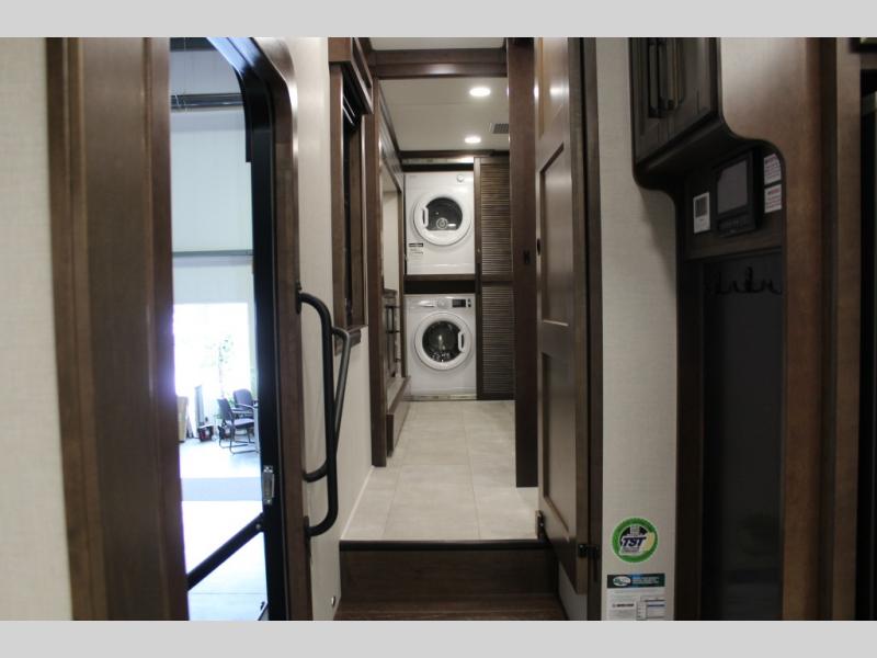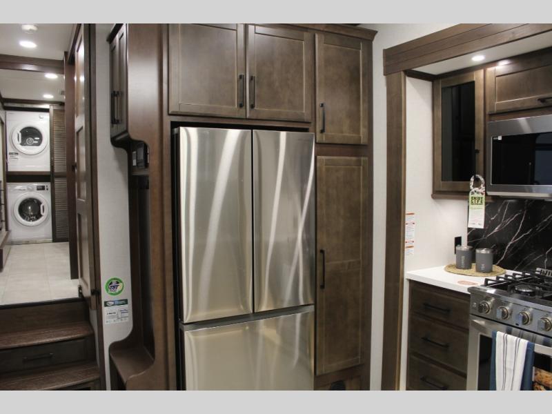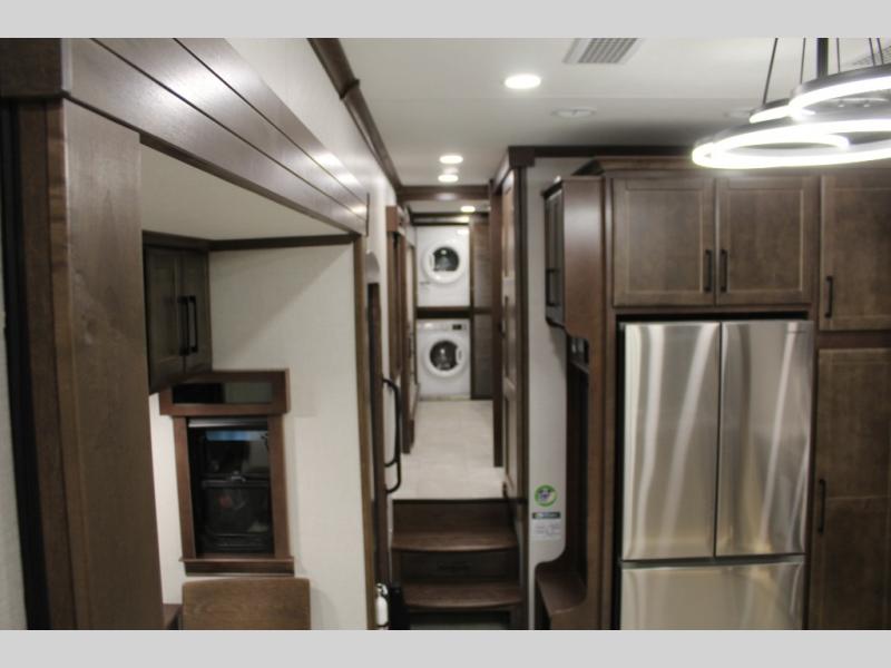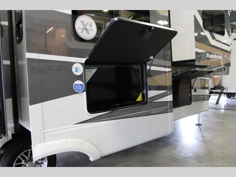 The Forest River RiverStone fifth wheels and toy haulers are luxurious units that have it all! You'll find an automatic six-point hydraulic level-up system to keep your unit in place, and there is preparation for a four-camera observation system. The TravlFi Journey XTR 4G/LTE router and WiFi extender will help you stay connected to the outside world, and you'll never have to overpack again since the Splendid “Astral” stackable washer and dryer will let you clean the small amount of clothes you've brought with you. Another high luxury is the Fischer Paykal dishwasher which will allow you to spend more time enjoying your camp life and less time cleaning up. Each unit is built with a LCI Road Armour suspension system, dual-pane frameless windows, a full docking station, a 200W solar panel, and a BMPro touch control system.