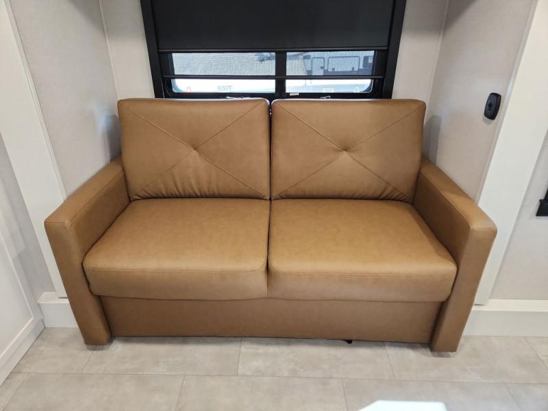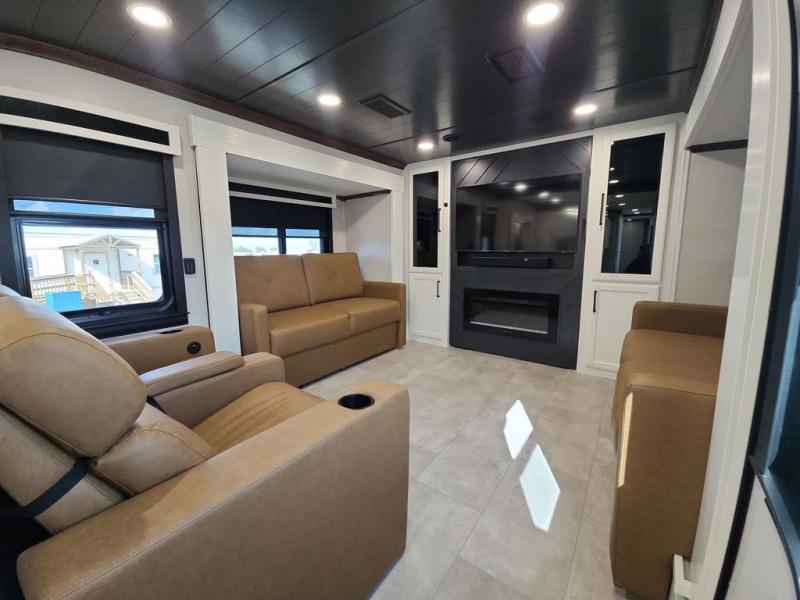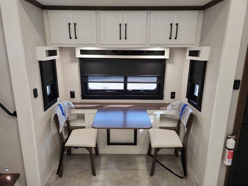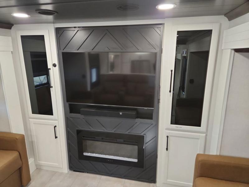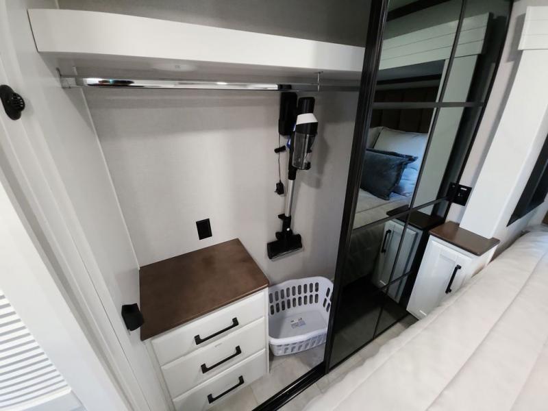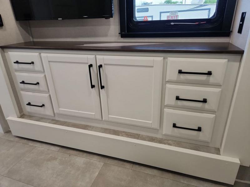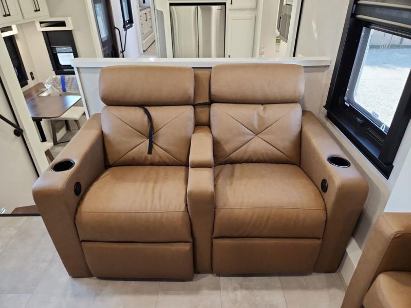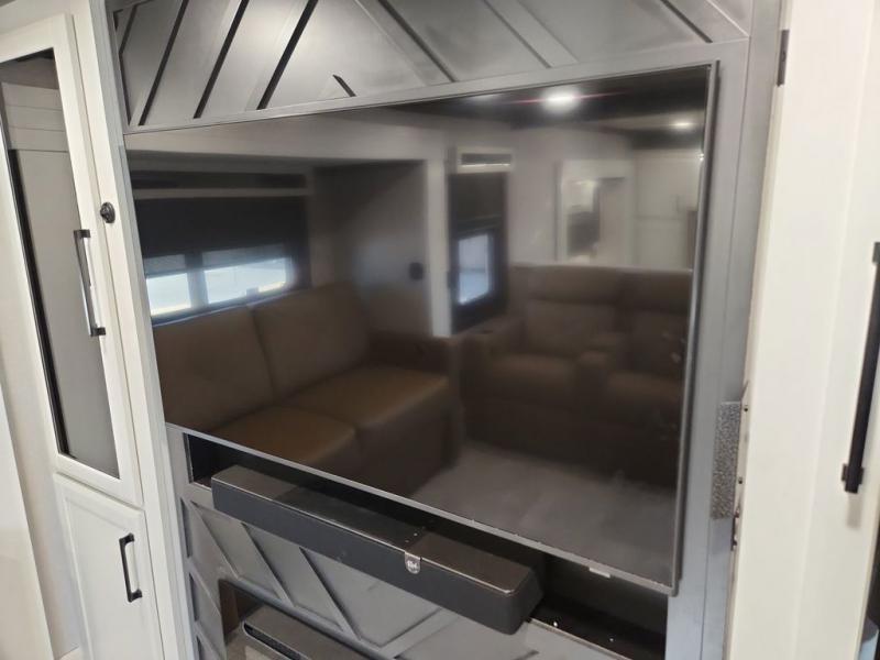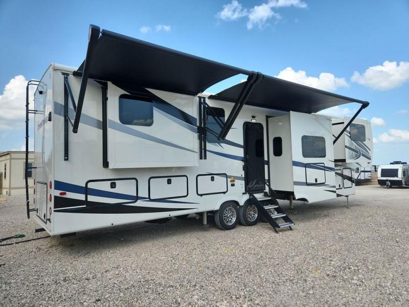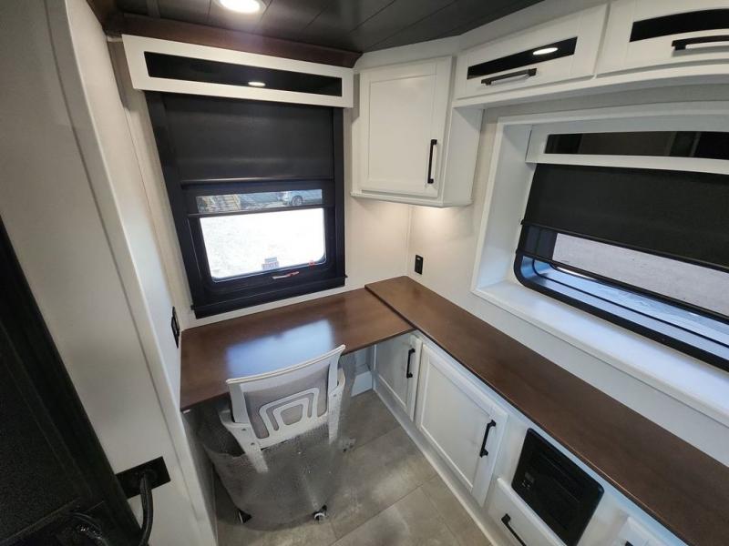 Pack your bags and head to your most comfortable camping trip ever in this packed out fifth wheel! The rear private bedroom has a 72" x 80" king bed slide for a good night's rest, a rear large wardrobe with the washer and dryer next to it, and even a dresser with a 40" LED TV. Get ready in the full bathroom with the shower then head to either the pull-out dinette to read the morning paper or whip up some scrambled eggs on the three burner cooktop in the middle kitchen. The kitchen even has two pantries for all your favorite snacks and a coat rack to hang your jacket. You can relax in the evenings on the two E-Z Glide sofa beds or the theater sofa across from the Samsung LED Smart TV. What's behind the swiveling entertainment center is where the real convenience is found with this model; a hidden front office with ample counter space to get your work done!