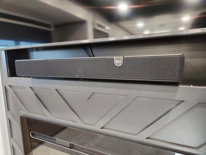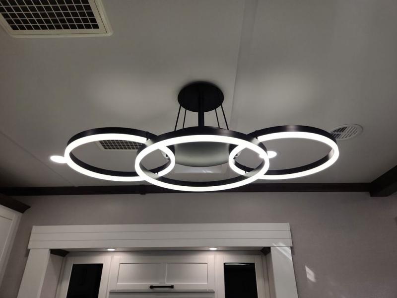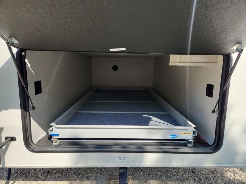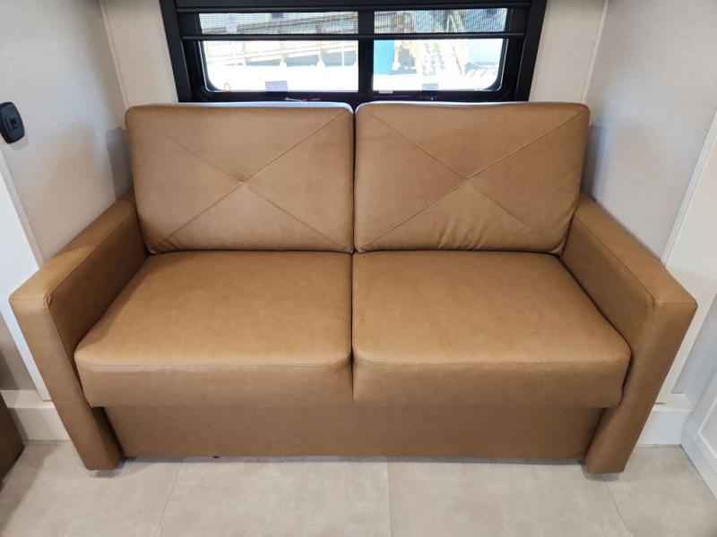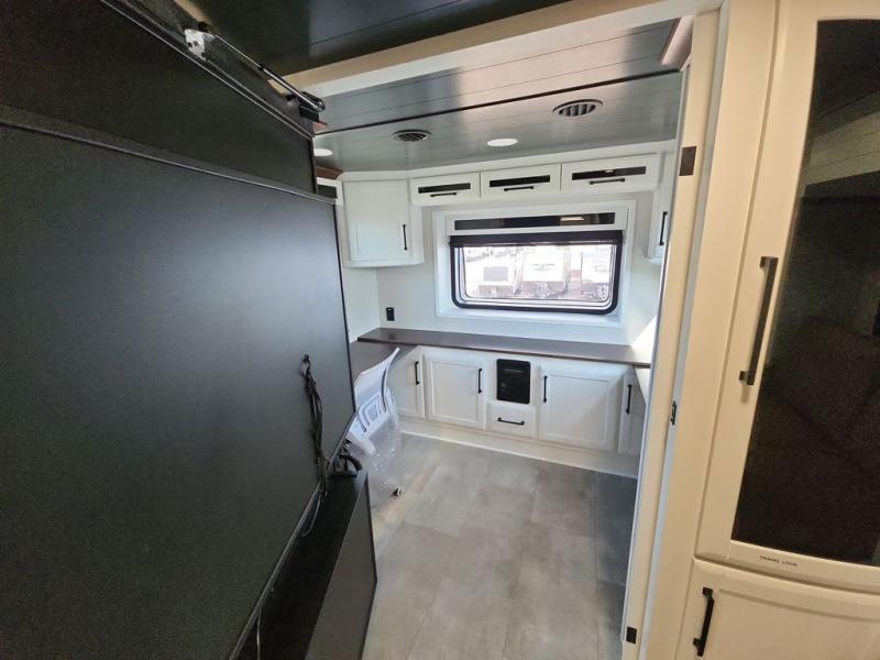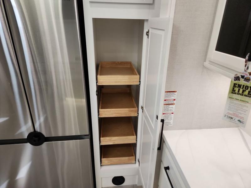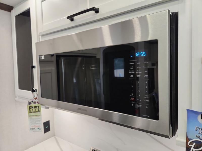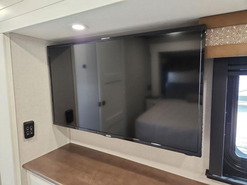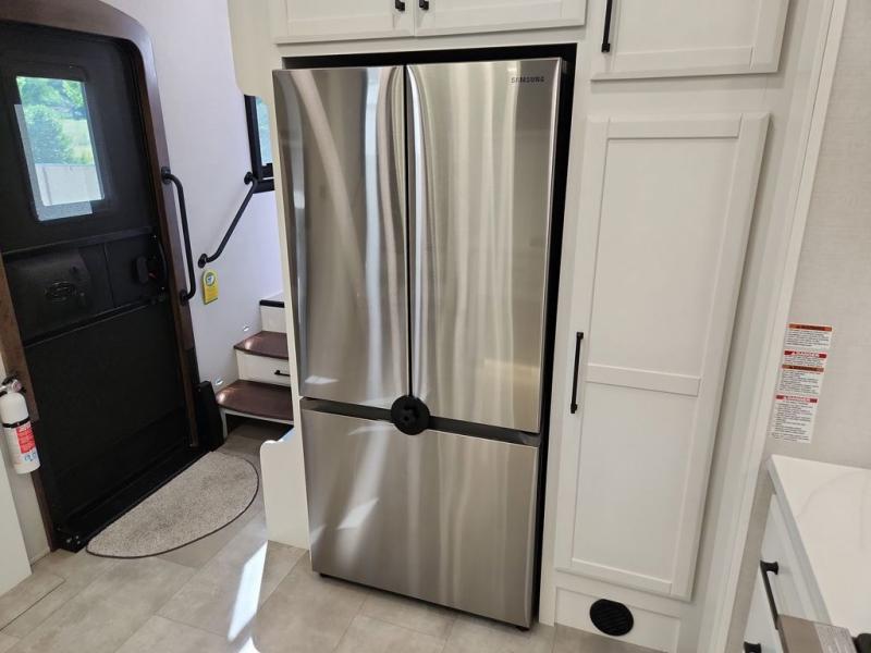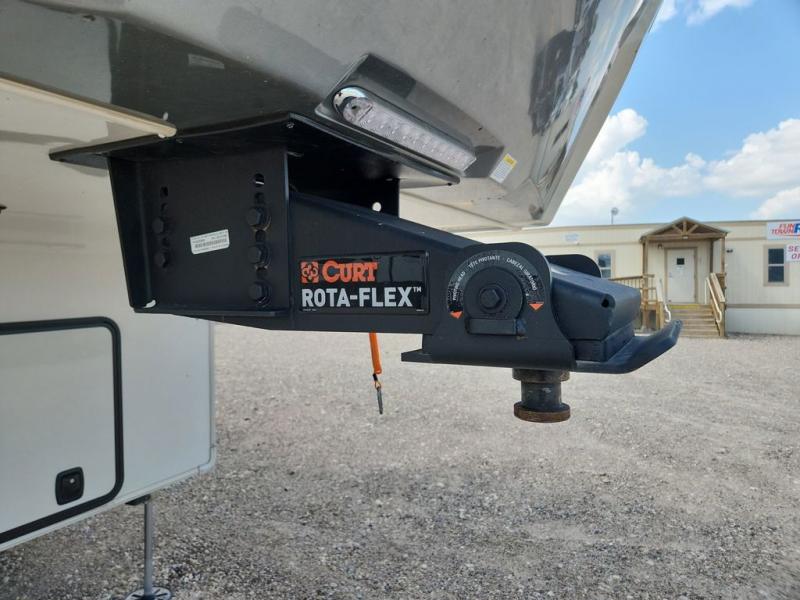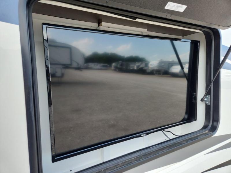 Pack your bags and head to your most comfortable camping trip ever in this packed out fifth wheel! The rear private bedroom has a 72" x 80" king bed slide for a good night's rest, a rear large wardrobe with the washer and dryer next to it, and even a dresser with a 40" LED TV. Get ready in the full bathroom with the shower then head to either the pull-out dinette to read the morning paper or whip up some scrambled eggs on the three burner cooktop in the middle kitchen. The kitchen even has two pantries for all your favorite snacks and a coat rack to hang your jacket. You can relax in the evenings on the two E-Z Glide sofa beds or the theater sofa across from the Samsung LED Smart TV. What's behind the swiveling entertainment center is where the real convenience is found with this model; a hidden front office with ample counter space to get your work done!