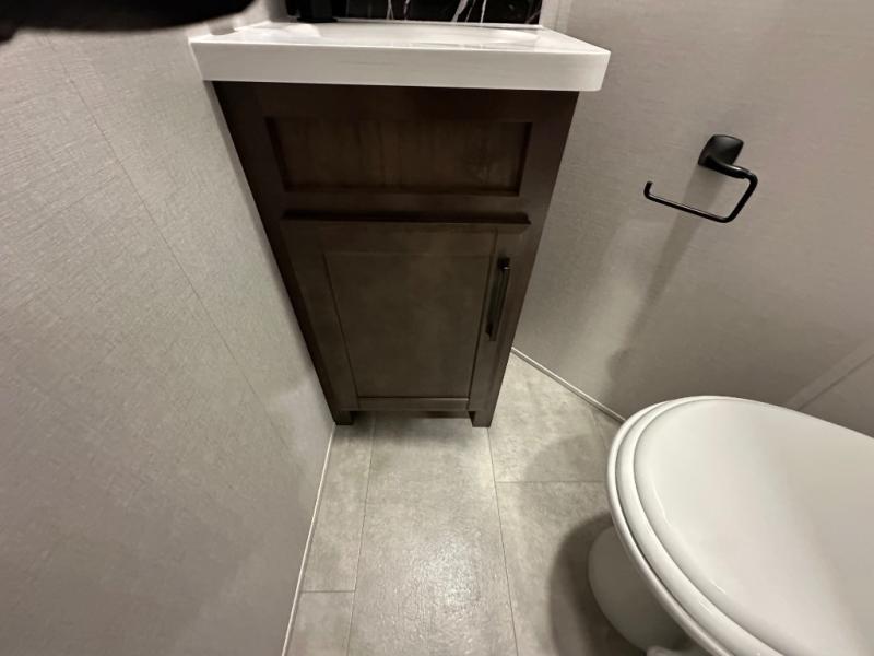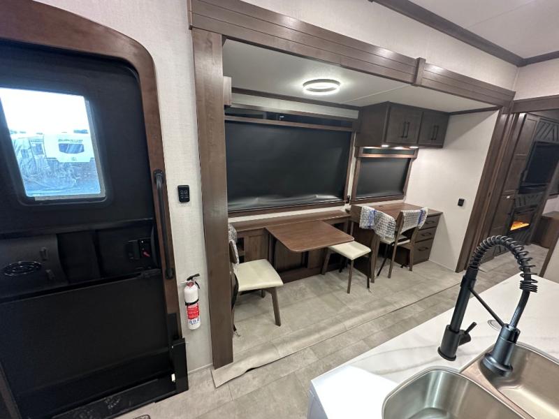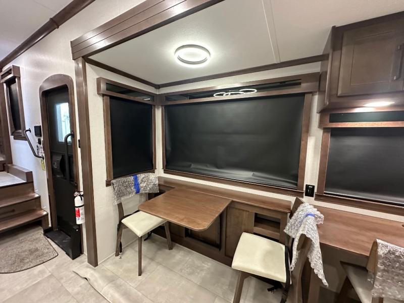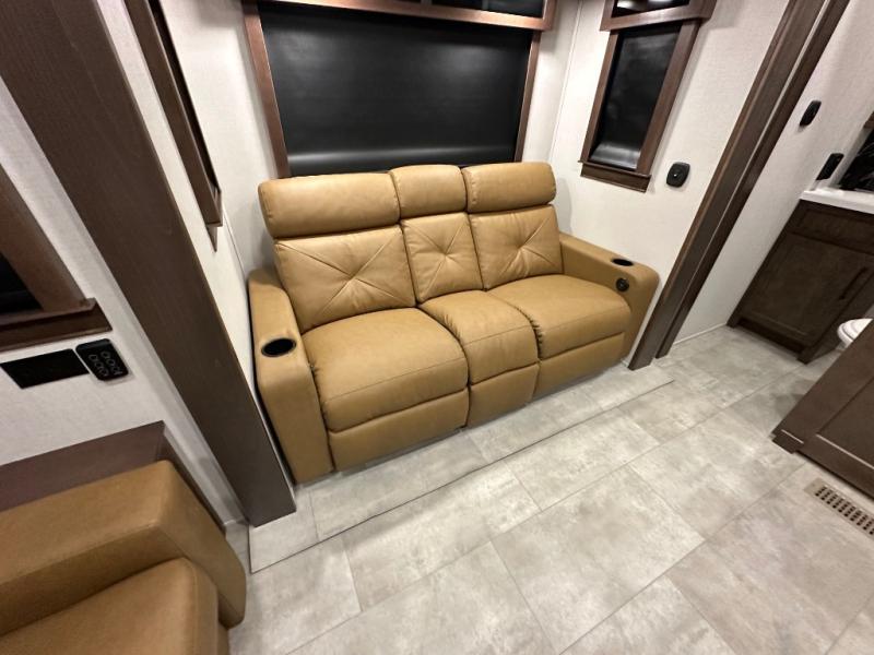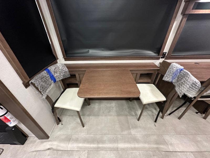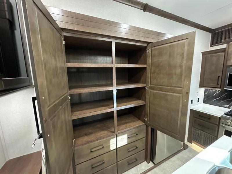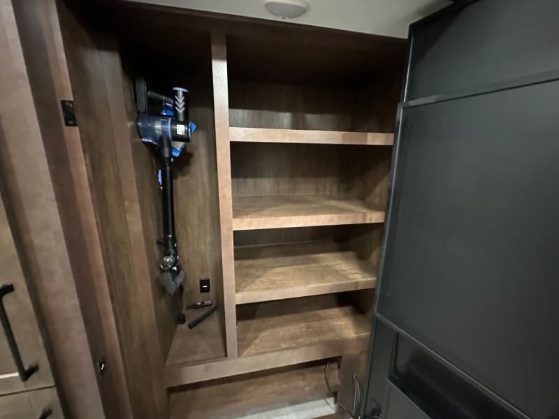 This RiverStone fifth wheel has an amazing den in the back! This area is not only an excellent lounging space with its theater sofa, hide-a-bed sofa, and entertainment center, but it is also a comfortable guest suite because it contains its own half bathroom and a drop-down queen bed. Each section of this unit has opposing slides, so you'll have plenty of living space, and the kitchen area has a pull-out dinette so that you can sit down with hot meals each night. You have a large pantry for snacks and an 18-cubic foot French door refrigerator with ice maker for cold beverages. The ceiling fan allows you to cool off the interior without overworking the AC, and the cordless vacuum will help you clean up messes.
