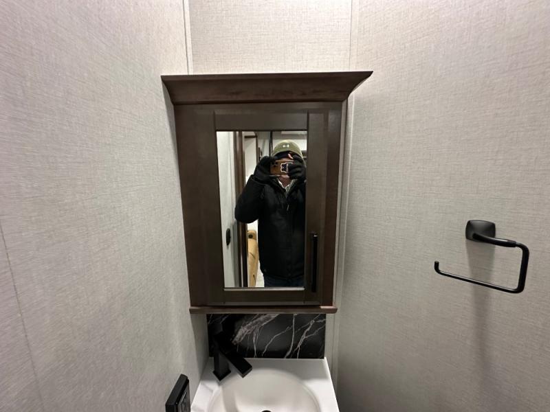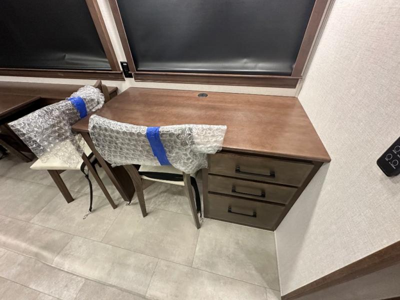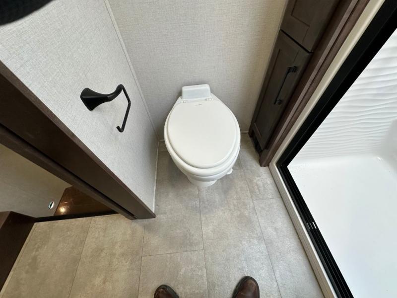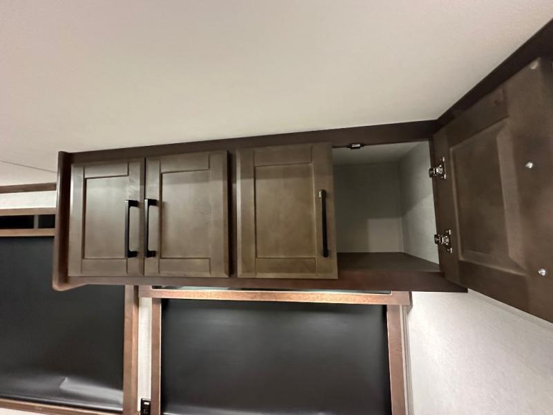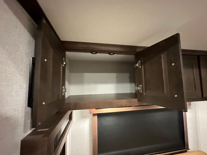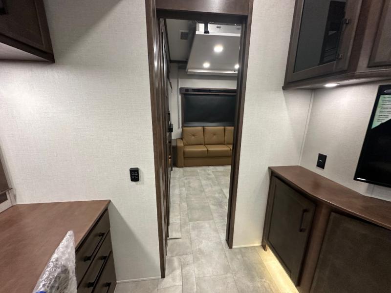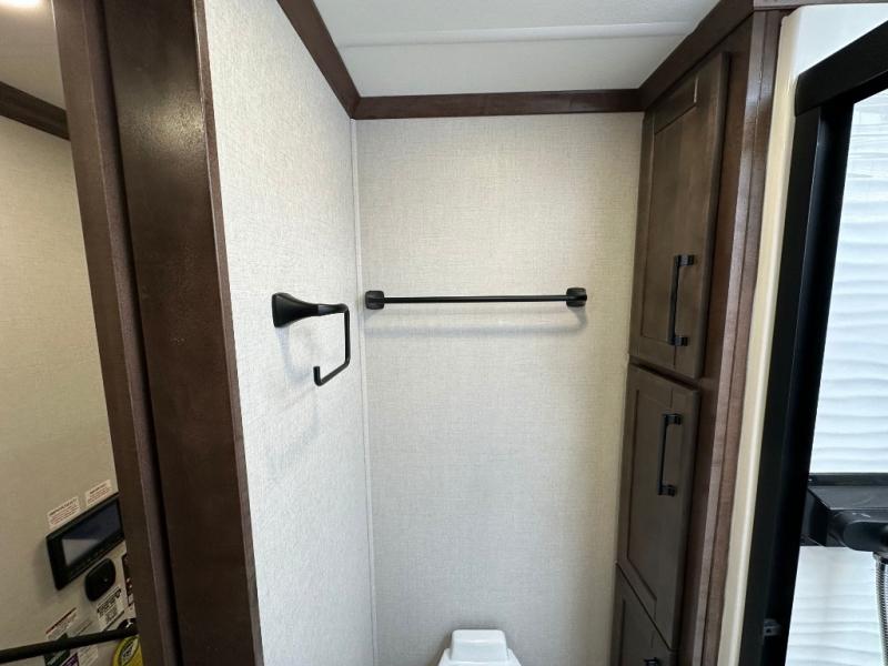 This RiverStone fifth wheel has an amazing den in the back! This area is not only an excellent lounging space with its theater sofa, hide-a-bed sofa, and entertainment center, but it is also a comfortable guest suite because it contains its own half bathroom and a drop-down queen bed. Each section of this unit has opposing slides, so you'll have plenty of living space, and the kitchen area has a pull-out dinette so that you can sit down with hot meals each night. You have a large pantry for snacks and an 18-cubic foot French door refrigerator with ice maker for cold beverages. The ceiling fan allows you to cool off the interior without overworking the AC, and the cordless vacuum will help you clean up messes.