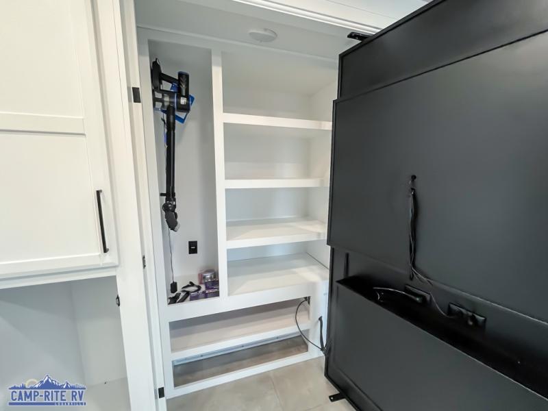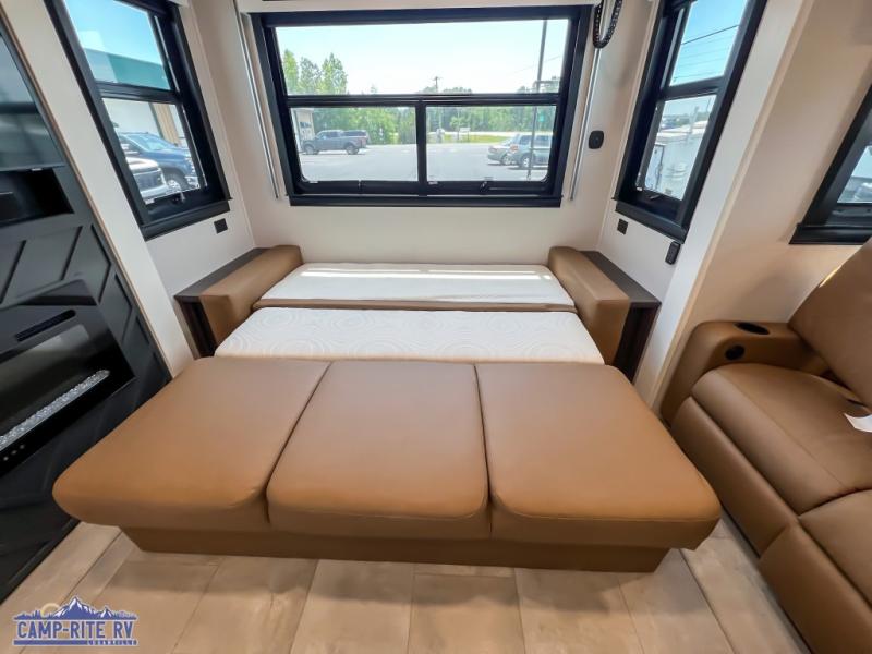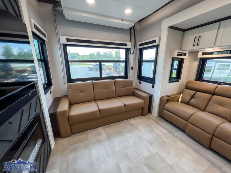 This RiverStone fifth wheel has an amazing den in the back! This area is not only an excellent lounging space with its theater sofa, hide-a-bed sofa, and entertainment center, but it is also a comfortable guest suite because it contains its own half bathroom and a drop-down queen bed. Each section of this unit has opposing slides, so you'll have plenty of living space, and the kitchen area has a pull-out dinette so that you can sit down with hot meals each night. You have a large pantry for snacks and an 18-cubic foot French door refrigerator with ice maker for cold beverages. The ceiling fan allows you to cool off the interior without overworking the AC, and the cordless vacuum will help you clean up messes.