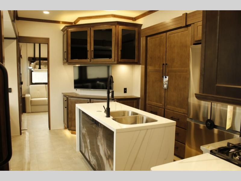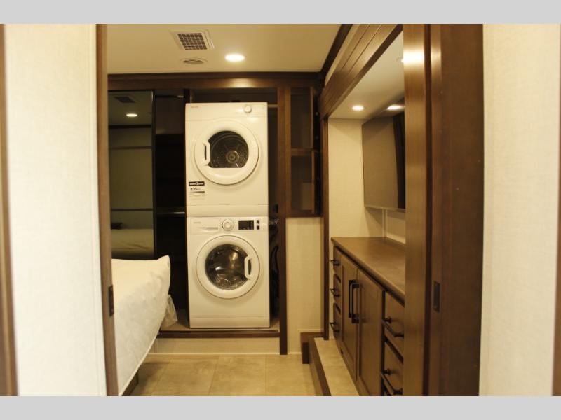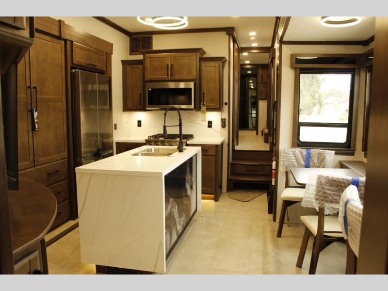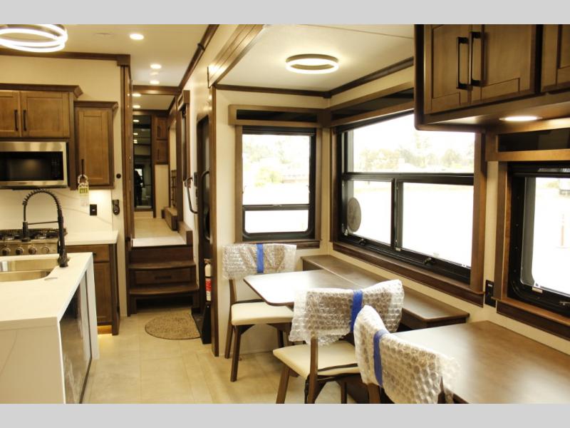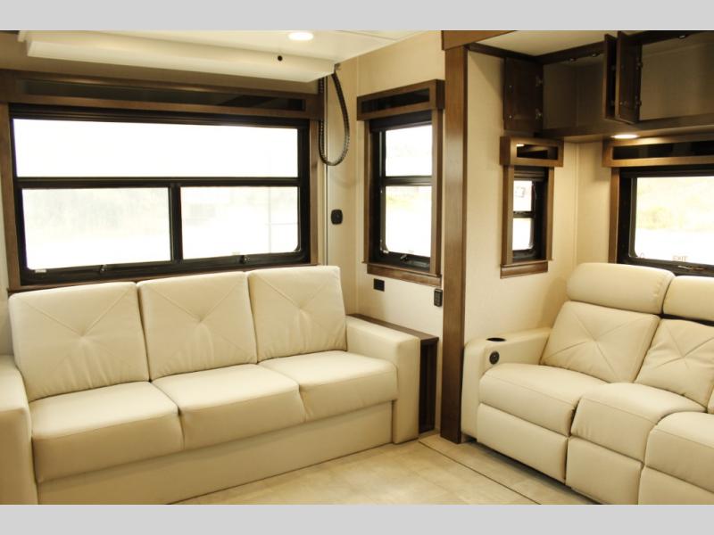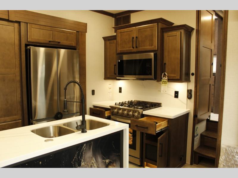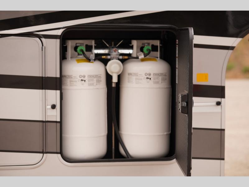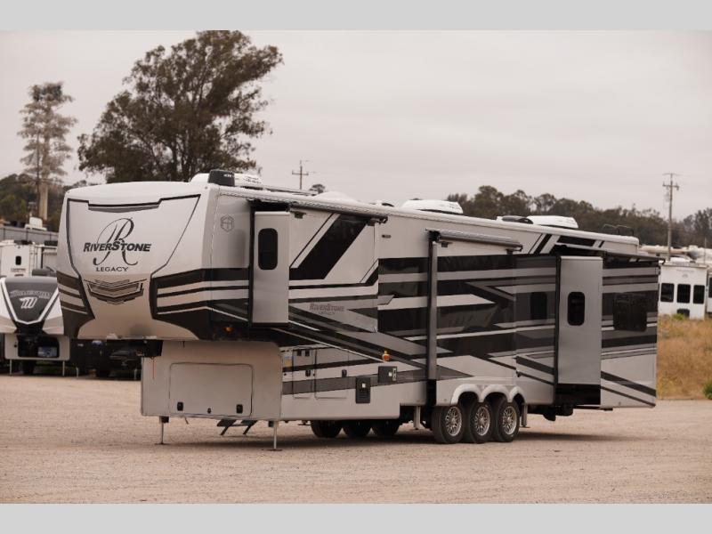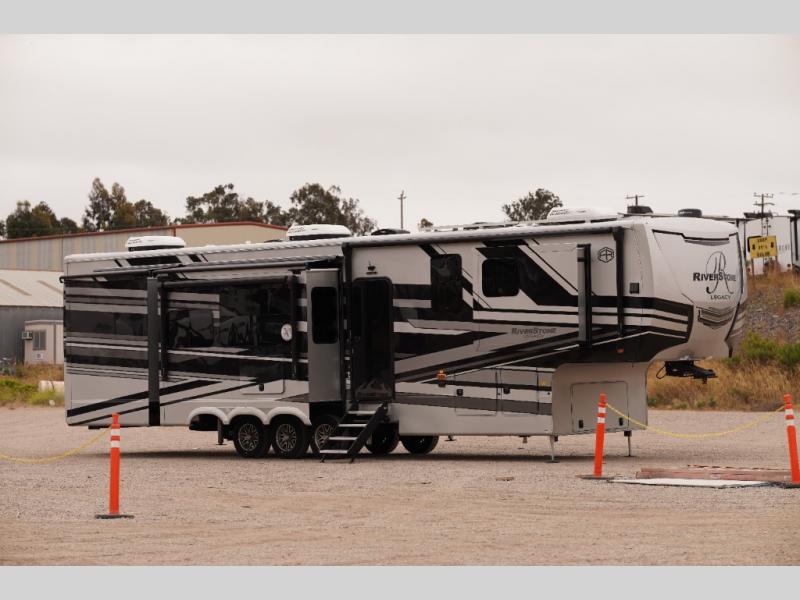 The Forest River RiverStone fifth wheels and toy haulers are luxurious units that have it all! You'll find an automatic six-point hydraulic level-up system to keep your unit in place, and there is preparation for a four-camera observation system. The TravlFi Journey XTR 4G/LTE router and WiFi extender will help you stay connected to the outside world, and you'll never have to overpack again since the Splendid “Astral” stackable washer and dryer will let you clean the small amount of clothes you've brought with you. Another high luxury is the Fischer Paykal dishwasher which will allow you to spend more time enjoying your camp life and less time cleaning up. Each unit is built with a LCI Road Armour suspension system, dual-pane frameless windows, a full docking station, a 200W solar panel, and a BMPro touch control system.