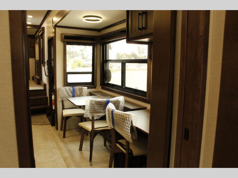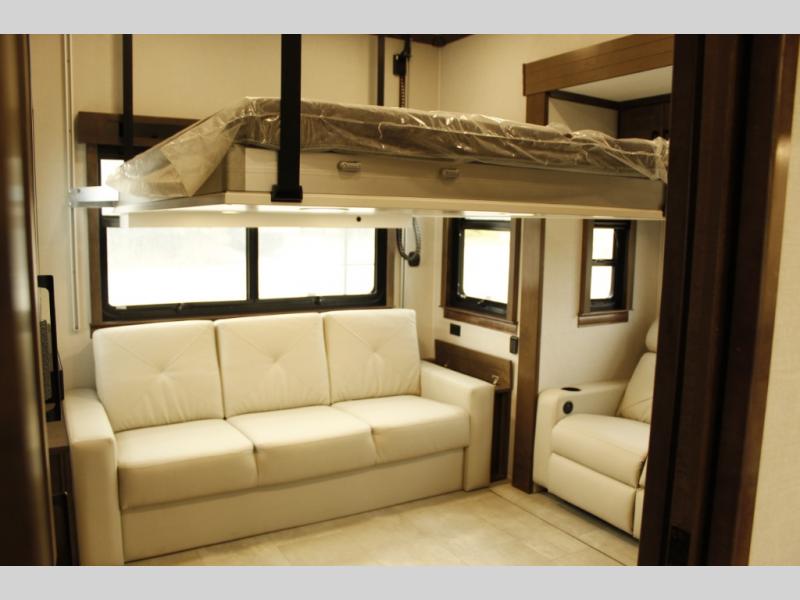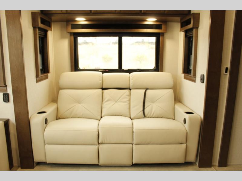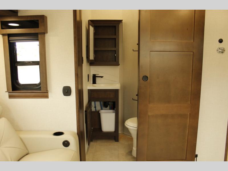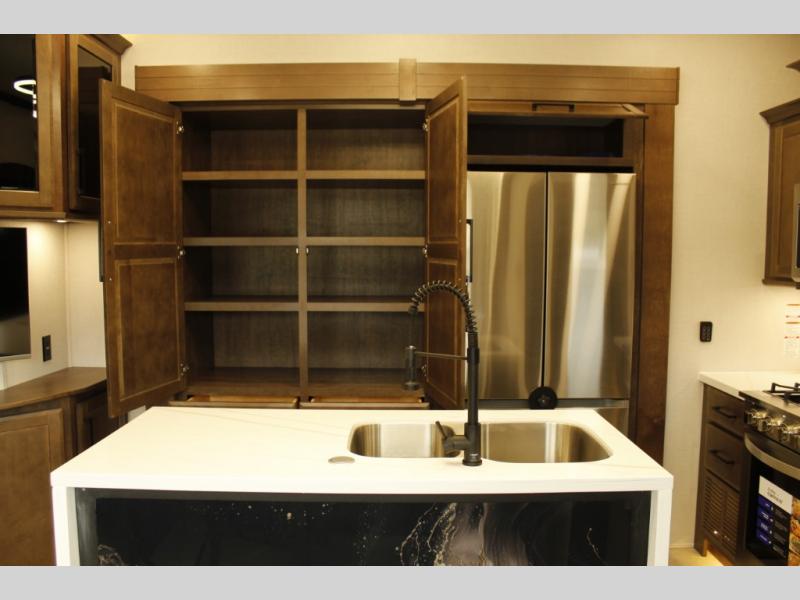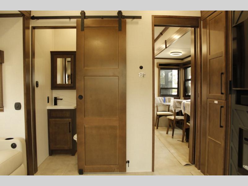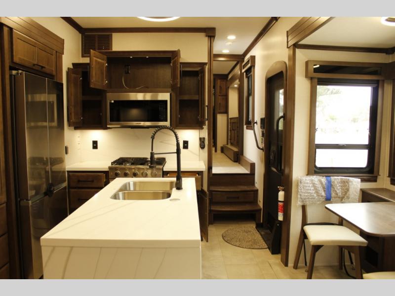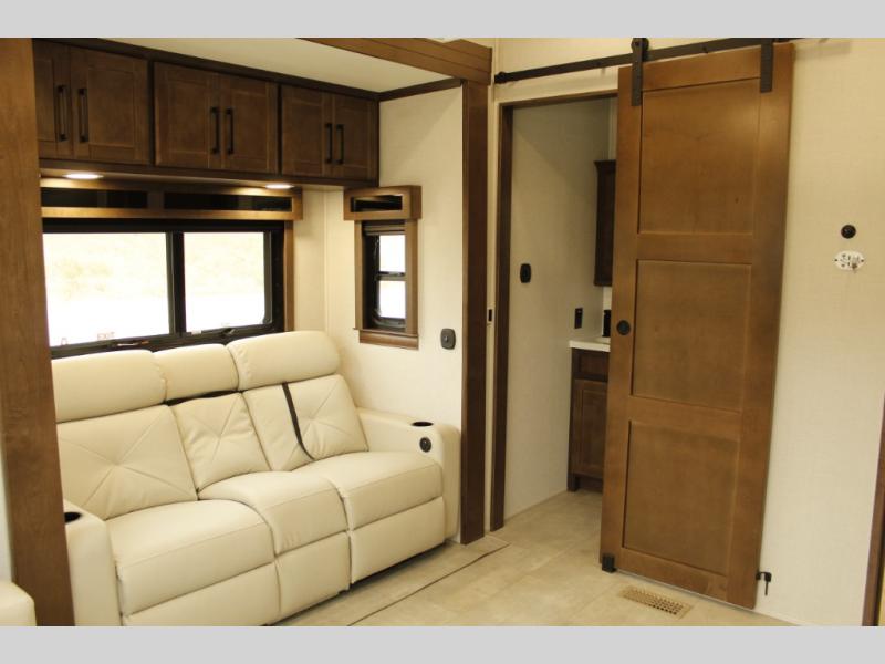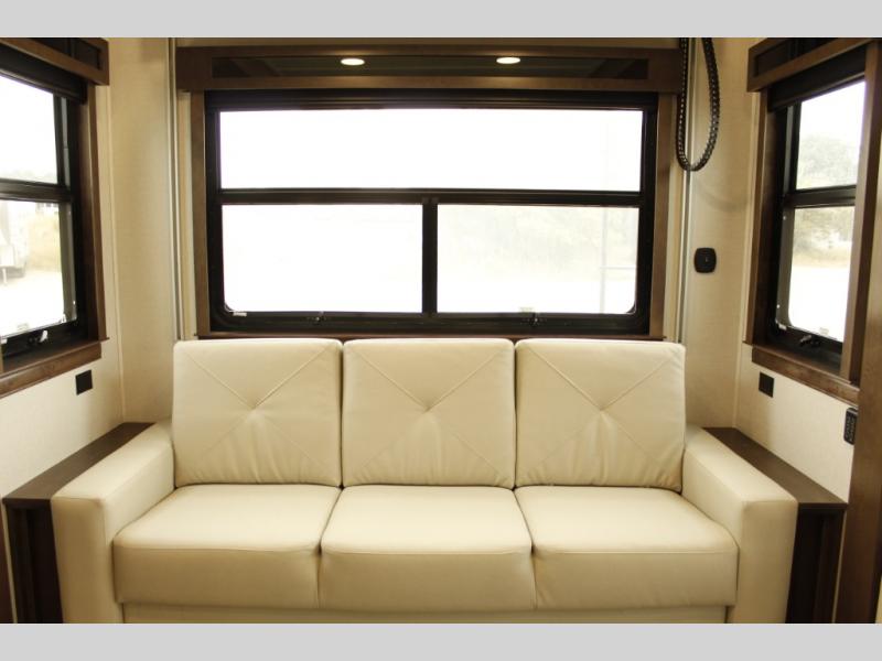 This RiverStone fifth wheel has an amazing den in the back! This area is not only an excellent lounging space with its theater sofa, hide-a-bed sofa, and entertainment center, but it is also a comfortable guest suite because it contains its own half bathroom and a drop-down queen bed. Each section of this unit has opposing slides, so you'll have plenty of living space, and the kitchen area has a pull-out dinette so that you can sit down with hot meals each night. You have a large pantry for snacks and an 18-cubic foot French door refrigerator with ice maker for cold beverages. The ceiling fan allows you to cool off the interior without overworking the AC, and the cordless vacuum will help you clean up messes.
