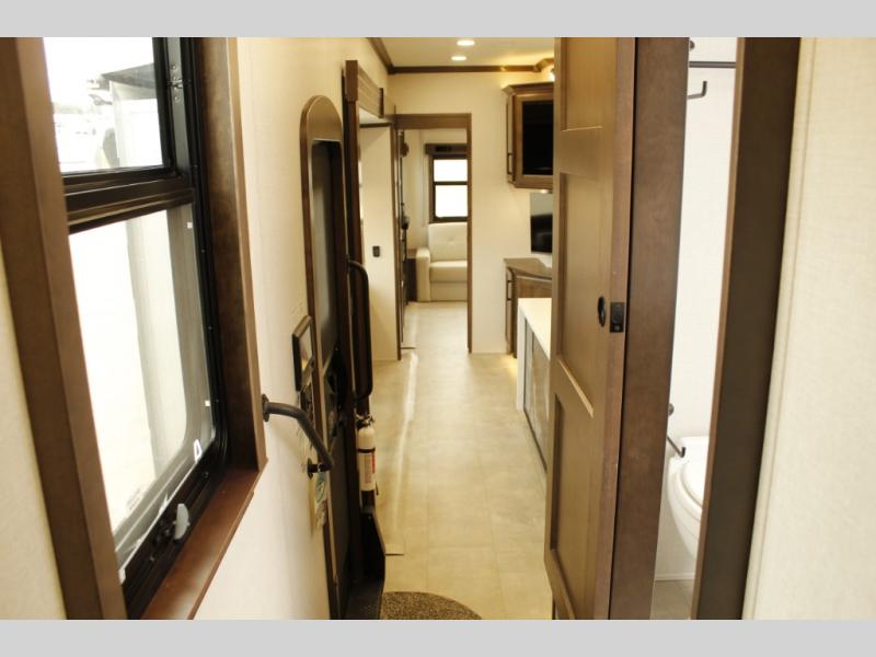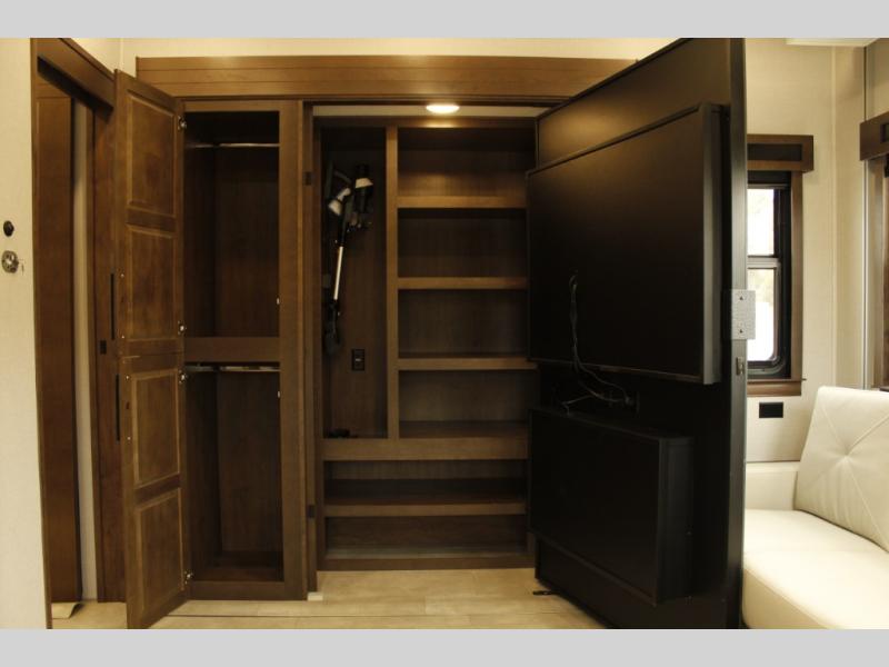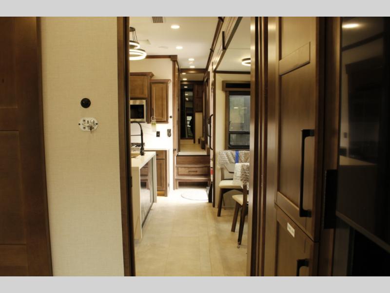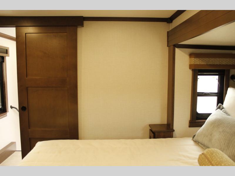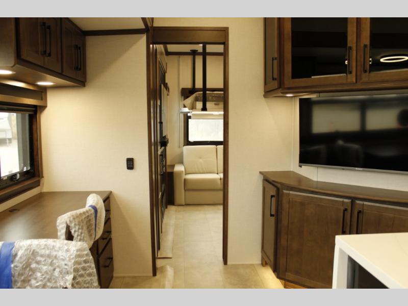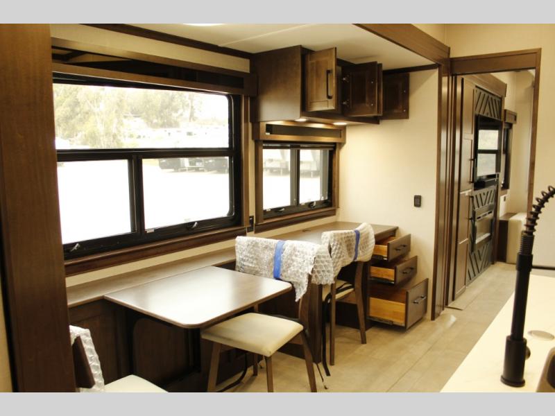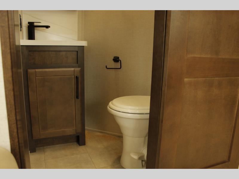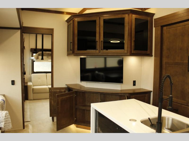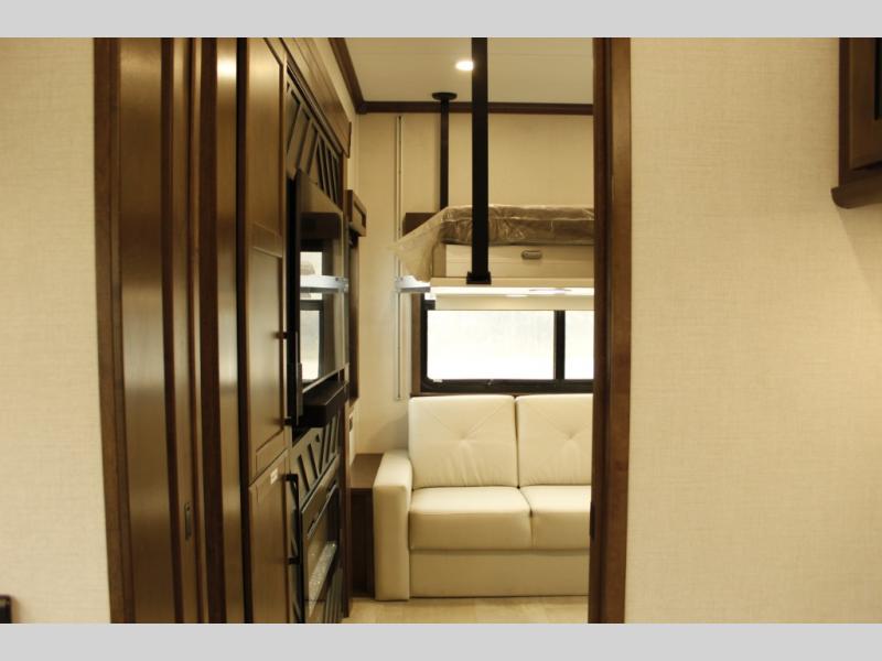 This RiverStone fifth wheel has an amazing den in the back! This area is not only an excellent lounging space with its theater sofa, hide-a-bed sofa, and entertainment center, but it is also a comfortable guest suite because it contains its own half bathroom and a drop-down queen bed. Each section of this unit has opposing slides, so you'll have plenty of living space, and the kitchen area has a pull-out dinette so that you can sit down with hot meals each night. You have a large pantry for snacks and an 18-cubic foot French door refrigerator with ice maker for cold beverages. The ceiling fan allows you to cool off the interior without overworking the AC, and the cordless vacuum will help you clean up messes.