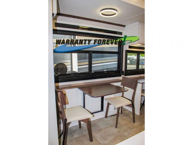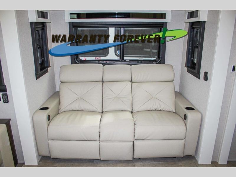 This RiverStone fifth wheel has an amazing den in the back! This area is not only an excellent lounging space with its theater sofa, hide-a-bed sofa, and entertainment center, but it is also a comfortable guest suite because it contains its own half bathroom and a drop-down queen bed. Each section of this unit has opposing slides, so you'll have plenty of living space, and the kitchen area has a pull-out dinette so that you can sit down with hot meals each night. You have a large pantry for snacks and an 18-cubic foot French door refrigerator with ice maker for cold beverages. The ceiling fan allows you to cool off the interior without overworking the AC, and the cordless vacuum will help you clean up messes.