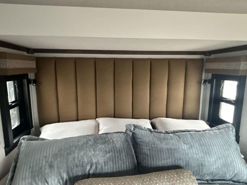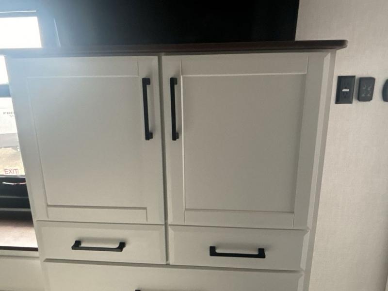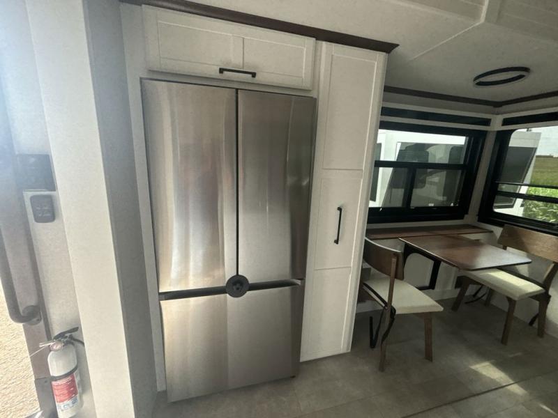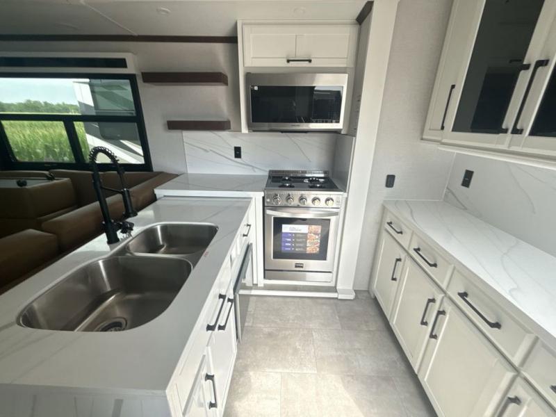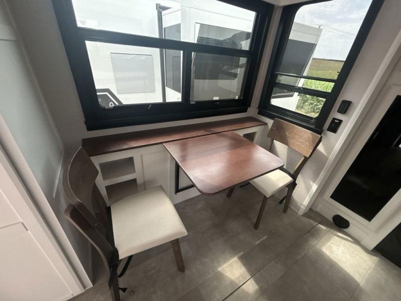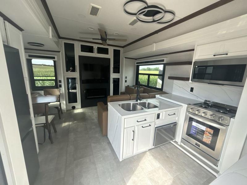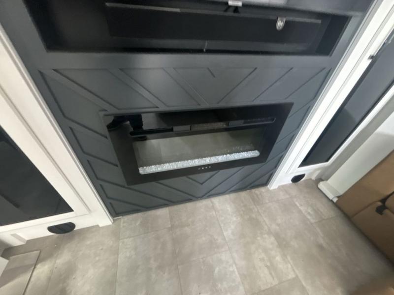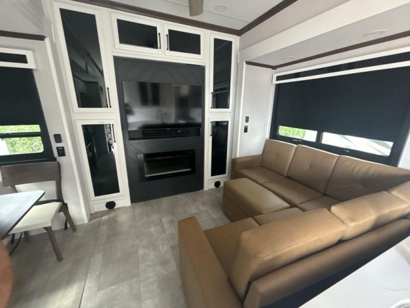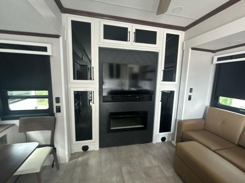 This is the perfect fifth wheel to travel with friends since there are two private bedrooms, one of which is a rear master with a full bath and its own exterior entry door. There is also a Murphy sofa here for your guests to sleep on, along with a wardrobe for their clothes and overhead storage. Head to the front private bedroom where you'll find a king bed slide, a dresser and a bench, a front wardrobe, plus a washer and dryer to make life at the campground easier than ever. The middle of this unit features the kitchen and living area. There is plenty of counter space plus a hutch and pantry for added storage. A sectional sofa provides tons of comfort, especially since its in perfect view of the fireplace and swinging entertainment center. There is also a dinette with four chairs where you can dine together and play a game of cards in the evening!