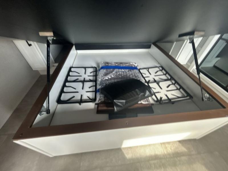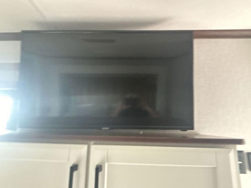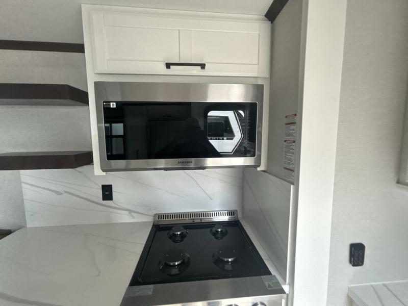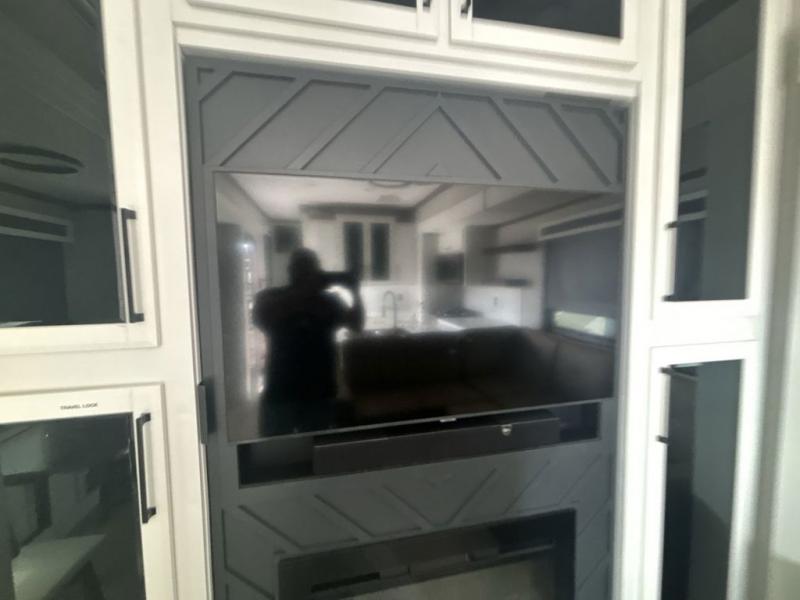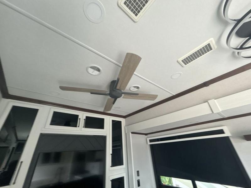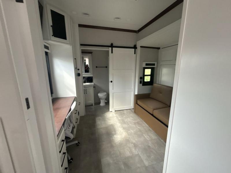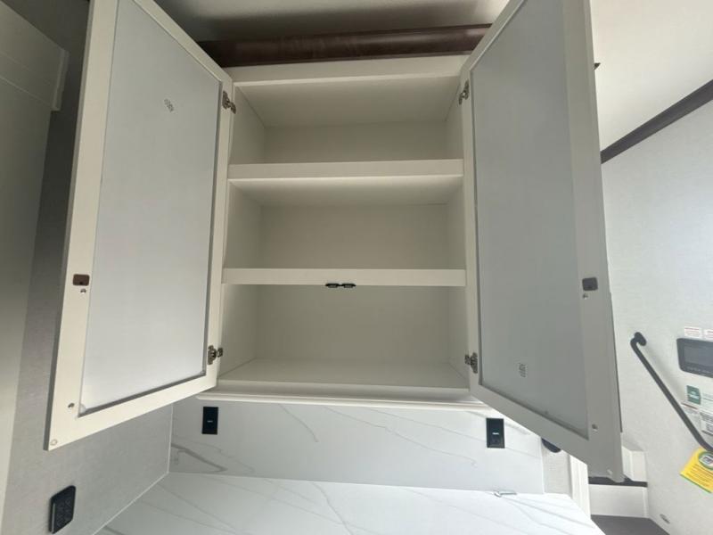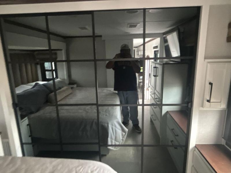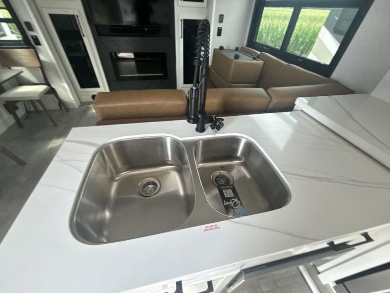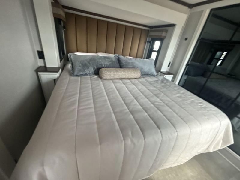 This is the perfect fifth wheel to travel with friends since there are two private bedrooms, one of which is a rear master with a full bath and its own exterior entry door. There is also a Murphy sofa here for your guests to sleep on, along with a wardrobe for their clothes and overhead storage. Head to the front private bedroom where you'll find a king bed slide, a dresser and a bench, a front wardrobe, plus a washer and dryer to make life at the campground easier than ever. The middle of this unit features the kitchen and living area. There is plenty of counter space plus a hutch and pantry for added storage. A sectional sofa provides tons of comfort, especially since its in perfect view of the fireplace and swinging entertainment center. There is also a dinette with four chairs where you can dine together and play a game of cards in the evening!