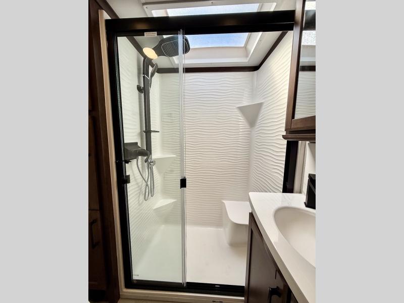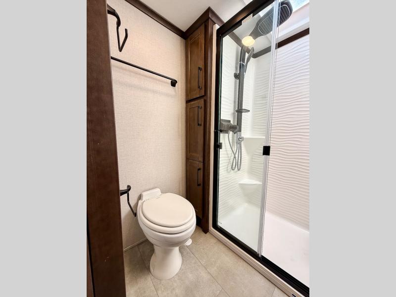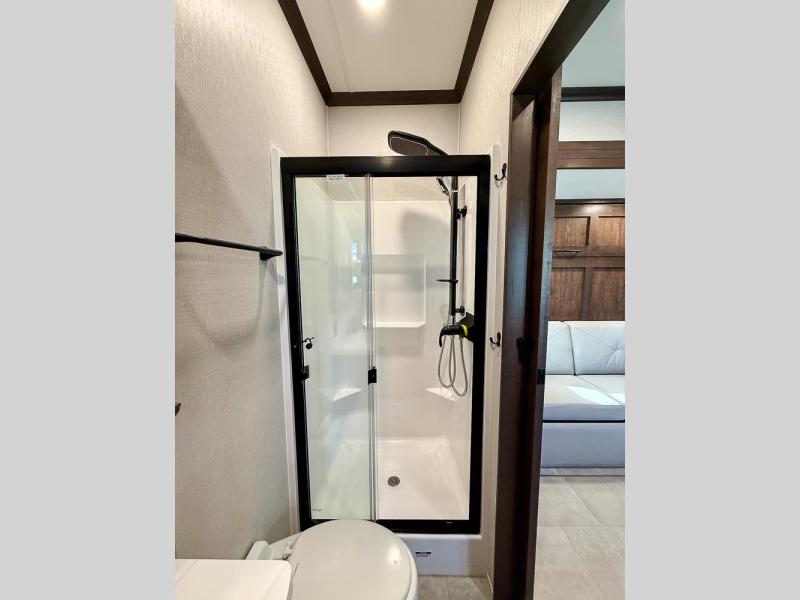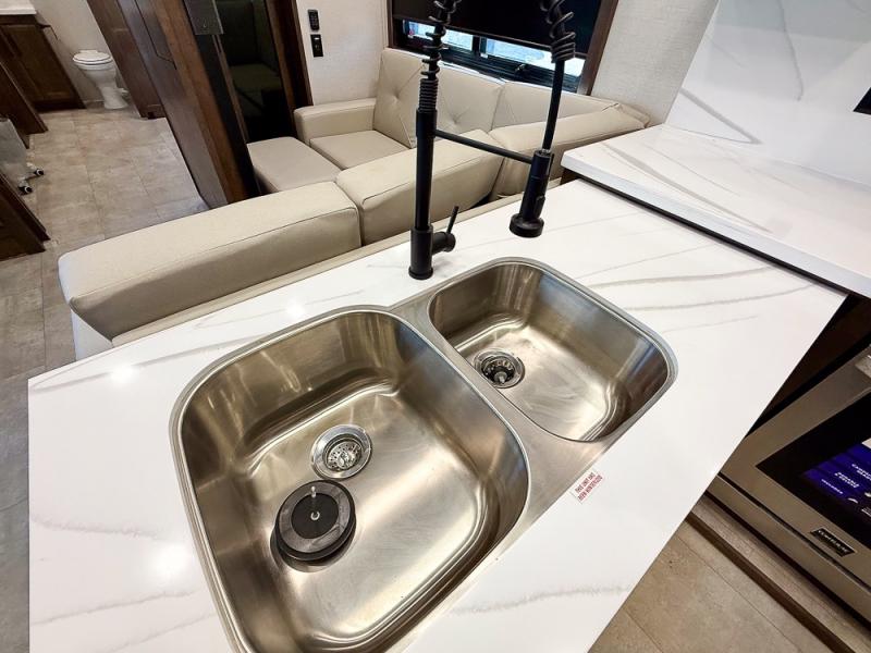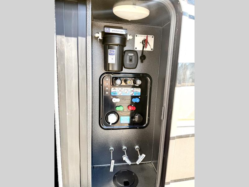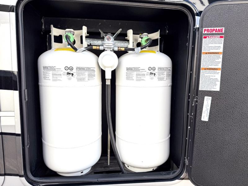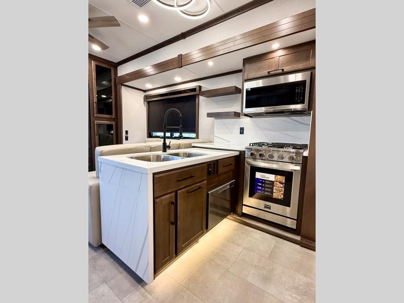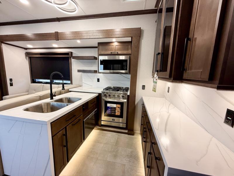 The Forest River RiverStone fifth wheels and toy haulers are luxurious units that have it all! You'll find an automatic six-point hydraulic level-up system to keep your unit in place, and there is preparation for a four-camera observation system. The TravlFi Journey XTR 4G/LTE router and WiFi extender will help you stay connected to the outside world, and you'll never have to overpack again since the Splendid “Astral” stackable washer and dryer will let you clean the small amount of clothes you've brought with you. Another high luxury is the Fischer Paykal dishwasher which will allow you to spend more time enjoying your camp life and less time cleaning up. Each unit is built with an LCI Road Armour suspension system, dual-pane frameless windows, a full docking station, a 200W solar panel, and a BMPro touch control system.
