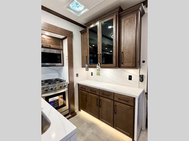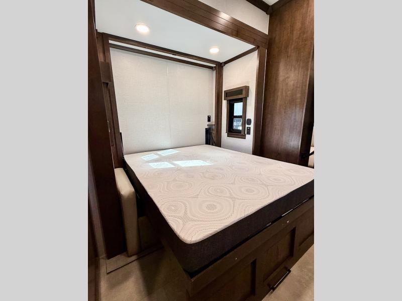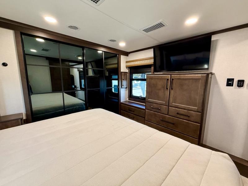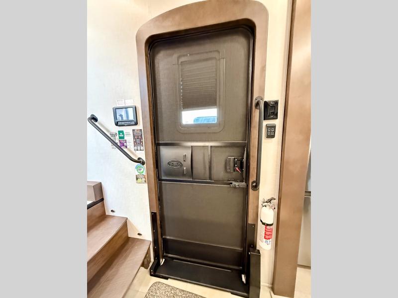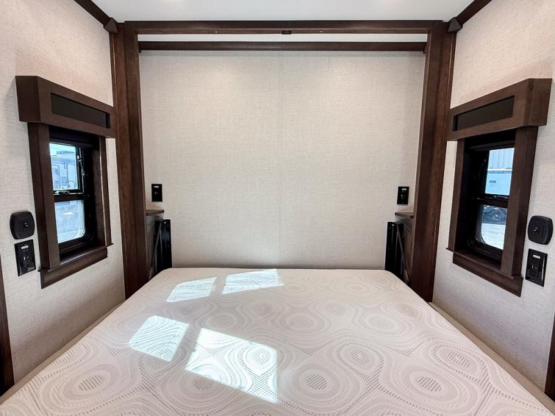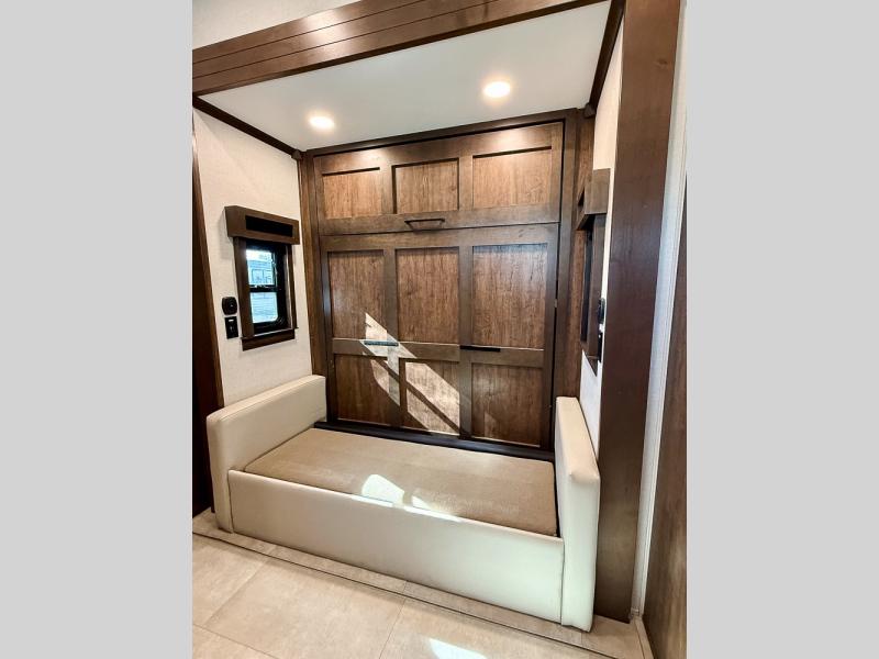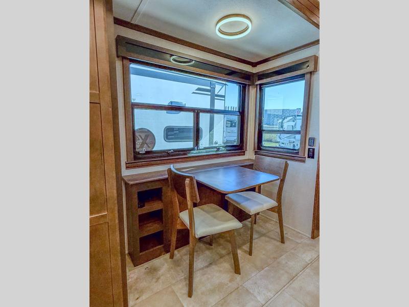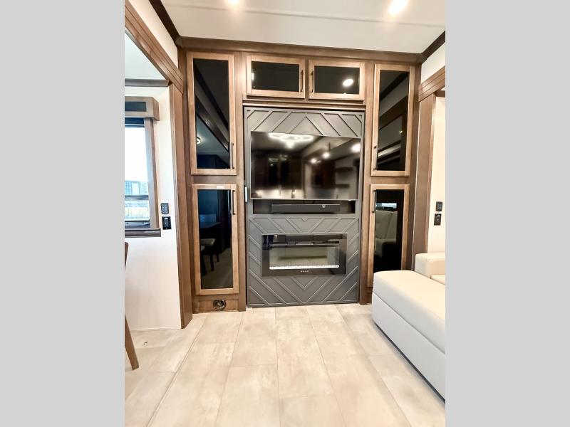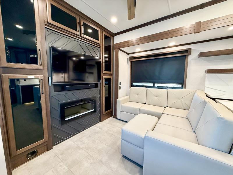 This is the perfect fifth wheel to travel with friends since there are two private bedrooms, one of which is a rear master with a full bath and its own exterior entry door. There is also a Murphy sofa here for your guests to sleep on, along with a wardrobe for their clothes and overhead storage. Head to the front private bedroom where you'll find a king bed slide, a dresser and a bench, a front wardrobe, plus a washer and dryer to make life at the campground easier than ever. The middle of this unit features the kitchen and living area. There is plenty of counter space plus a hutch and pantry for added storage. A sectional sofa provides tons of comfort, especially since its in perfect view of the fireplace and swinging entertainment center. There is also a dinette with four chairs where you can dine together and play a game of cards in the evening!