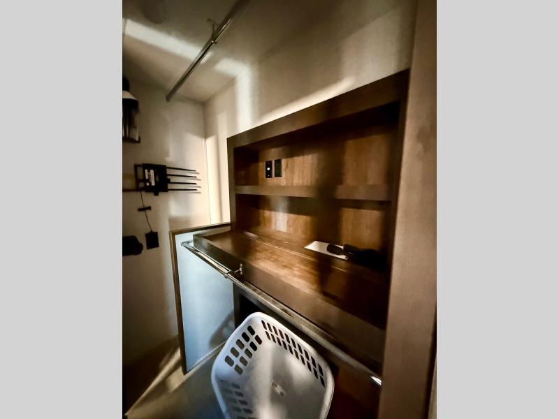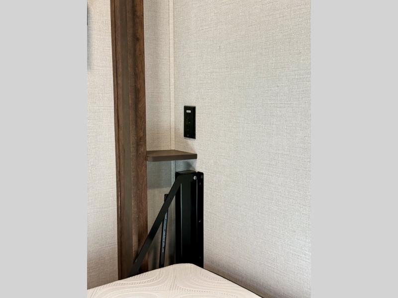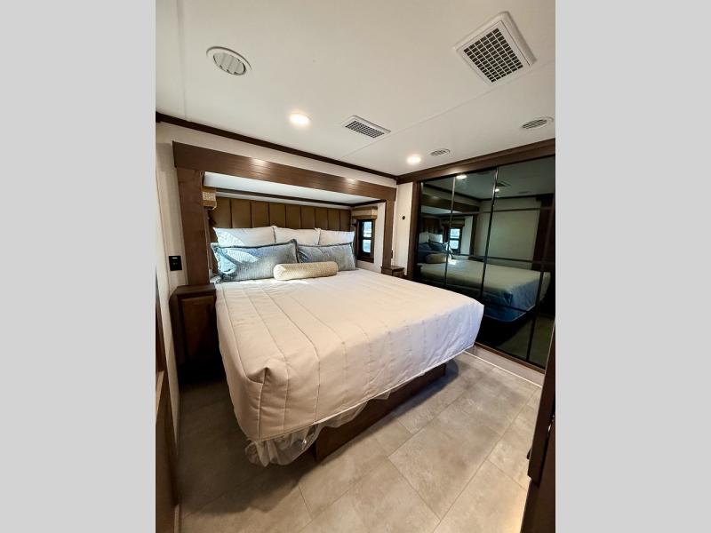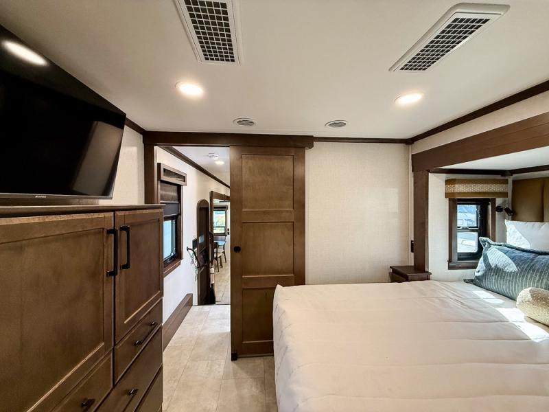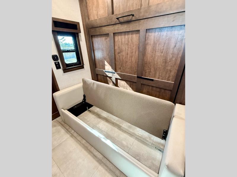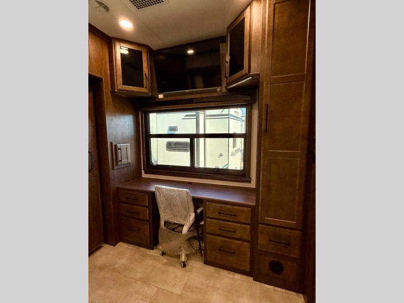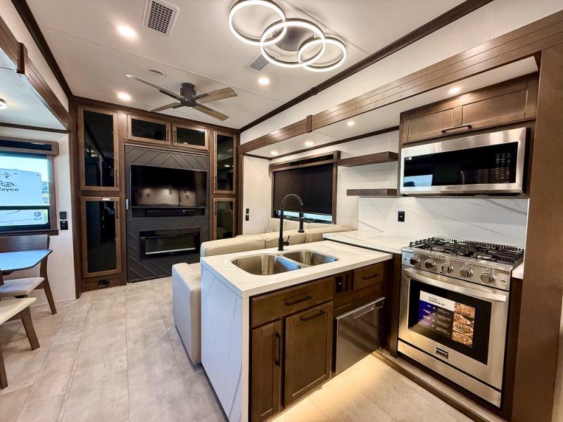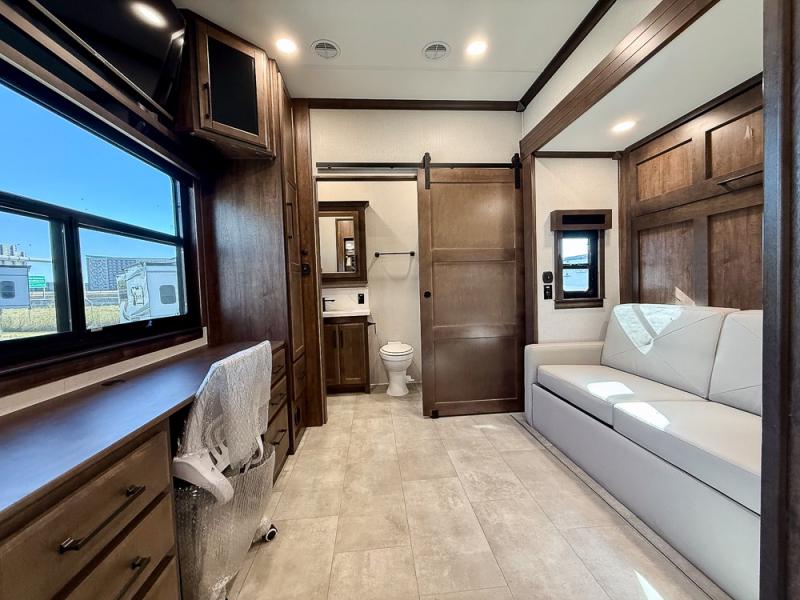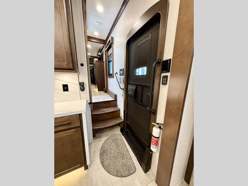 This is the perfect fifth wheel to travel with friends since there are two private bedrooms, one of which is a rear master with a full bath and its own exterior entry door. There is also a Murphy sofa here for your guests to sleep on, along with a wardrobe for their clothes and overhead storage. Head to the front private bedroom where you'll find a king bed slide, a dresser and a bench, a front wardrobe, plus a washer and dryer to make life at the campground easier than ever. The middle of this unit features the kitchen and living area. There is plenty of counter space plus a hutch and pantry for added storage. A sectional sofa provides tons of comfort, especially since its in perfect view of the fireplace and swinging entertainment center. There is also a dinette with four chairs where you can dine together and play a game of cards in the evening!