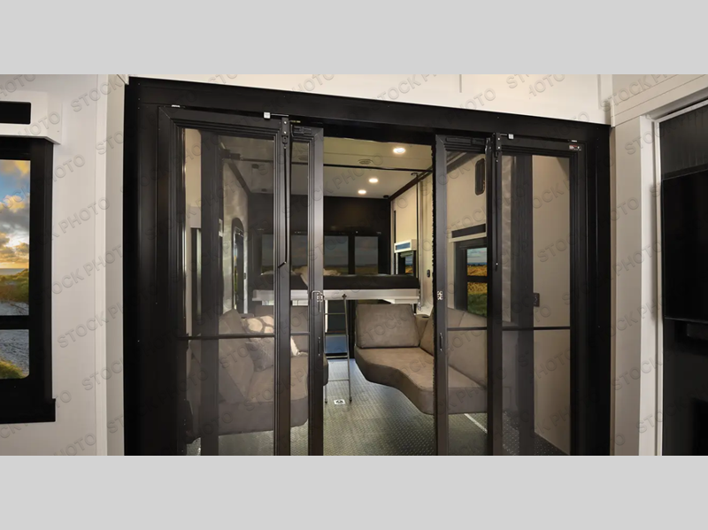 Let this toy hauler wow you with all its features, from the separate garage with sliding doors to the spacious front bedroom that will feel just like home! After your toys are unloaded using the MORryde Zero Gravity ramp door, relax around the two L-shaped couches, or let your guests rest on the drop-down queen bed. There is more seating space in the main living area on the L-shaped reclining sofa, and the chef of your group will love the kitchen that includes an island with a dishwasher, plenty of counter space, plus a hidden pantry behind the entertainment center. Head to the front bedroom each night that includes a 66" x 80" super queen bed slide, a dresser and a wardrobe, plus a bedroom 40" LED TV for movies in bed. And don't overlook the exterior with its two Solera power awning with LED lights!
