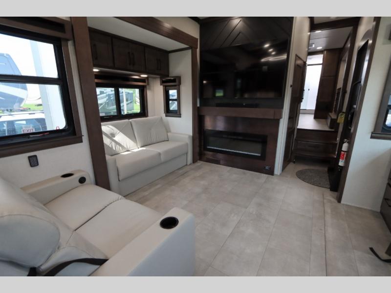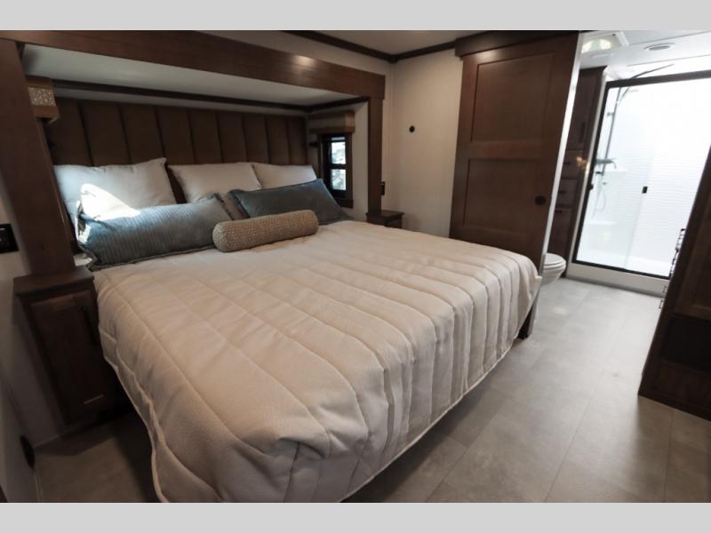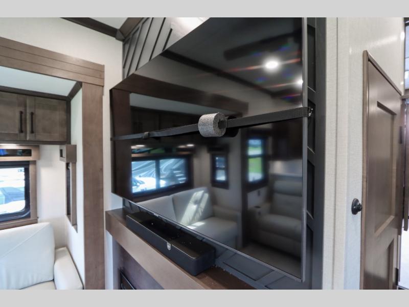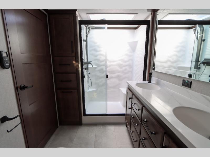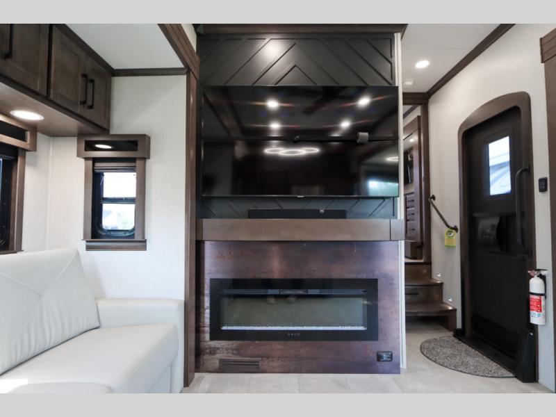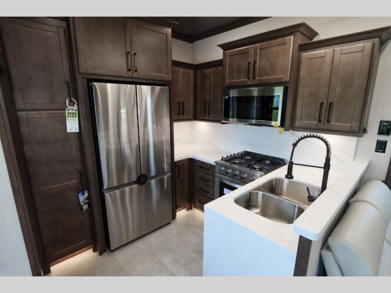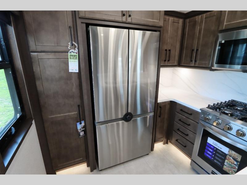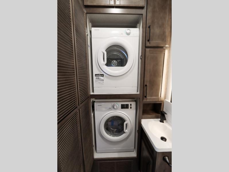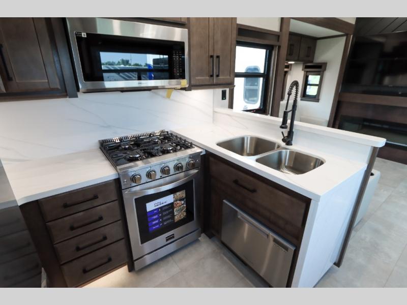 The Forest River RiverStone fifth wheels and toy haulers are luxurious units that have it all! You'll find an automatic six-point hydraulic level-up system to keep your unit in place, and there is preparation for a four-camera observation system. The TravlFi Journey XTR 4G/LTE router and WiFi extender will help you stay connected to the outside world, and you'll never have to overpack again since the Splendid “Astral” stackable washer and dryer will let you clean the small amount of clothes you've brought with you. Another high luxury is the Fischer Paykal dishwasher which will allow you to spend more time enjoying your camp life and less time cleaning up. Each unit is built with an LCI Road Armour suspension system, dual-pane frameless windows, a full docking station, a 200W solar panel, and a BMPro touch control system.