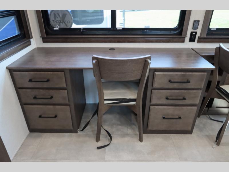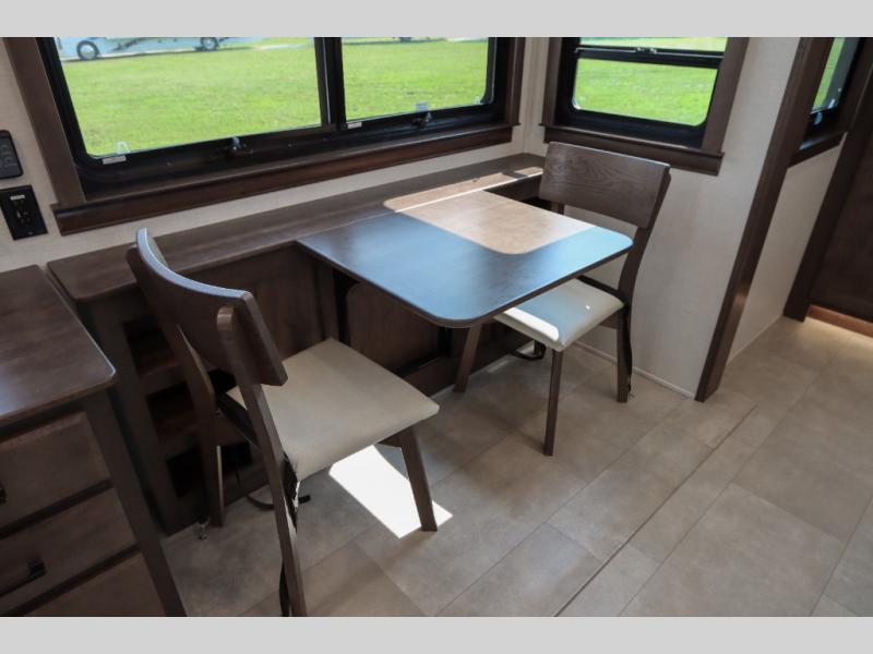 Show your family a good time with this RiverStone fifth wheel! You will get to stay in a super comfortable master suite at the front of this unit which has a dual-sink vanity in the full bathroom. The bedroom offers you a king-size bed that you can rest on while you watch the 40" LED TV across from you, and there is a half bathroom just outside the bedroom for your friends or family to use. If you've decided to bring work with you on the road, you'll be grateful to find a desk in the living area, and the pull-out dinette is a great place to sit down for meals. Work your magic in the kitchen and prepare something delicious on the four-burner range for everyone to eat.