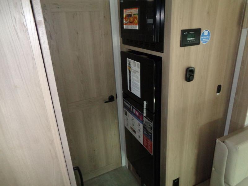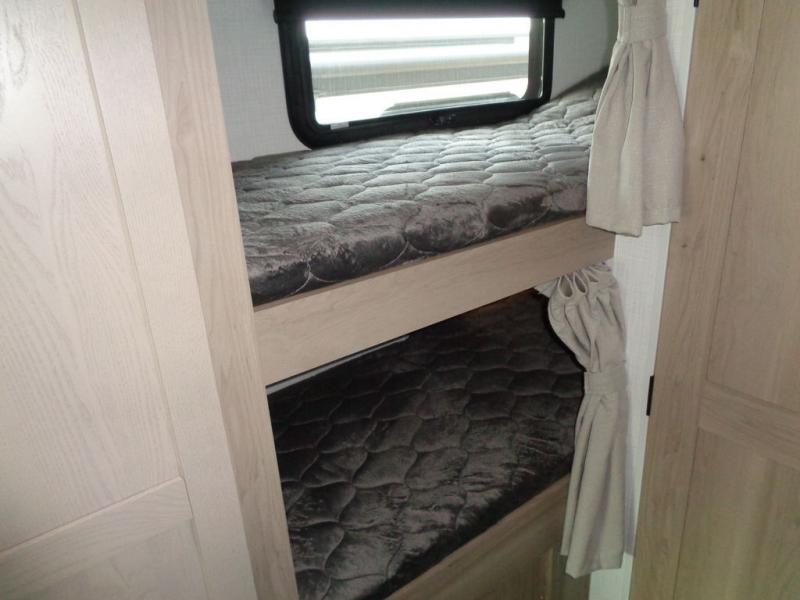 You're going to love camping with your family or friends in this spacious bunk model! The bunk beds will be perfect for little ones, while you take the front full-size bed. There is also a 44" booth dinette within the slide out for additional sleeping and seating space. The kitchen includes everything the chef will need to prepare meals each day, including a recessed cooktop, microwave oven, and a 12V refrigerator for perishables. If the weather is nice, you may just find the chef outdoors cooking on the outside griddle under the 14' power awning. And check out the exterior bike door that will be perfect for bikes, luggage, or extra camp gear. The optional Power Package available on this model includes three 200W solar panels, a 460 Ah Mastervolt MLI lithium-ion battery, two smart remotes, and more off-grid features!