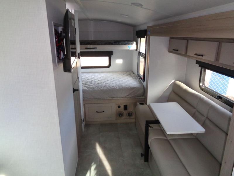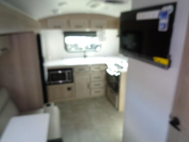 Are you looking for a lightweight trailer with at-home comforts? Take a look at this single slide out unit that can sleep three to four each night. There is a queen-size bed in the back with a 26" x 80" flip-up bunk for cozy sleeping space, a 72" sofa with cupholders to relax on, plus a 32" 12V TV for movie nights! The front kitchen includes a 12V refrigerator to store food, plus a microwave oven and a gas oven to cook meals each day.