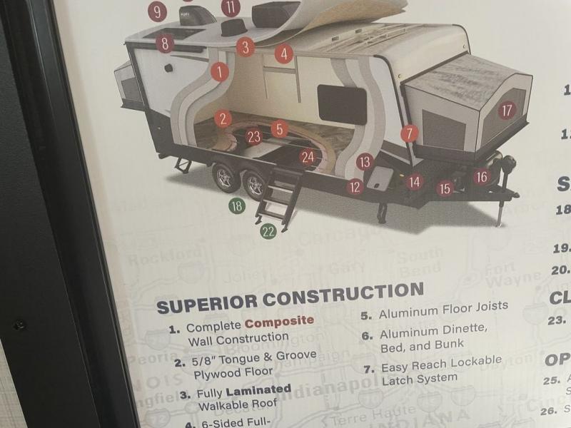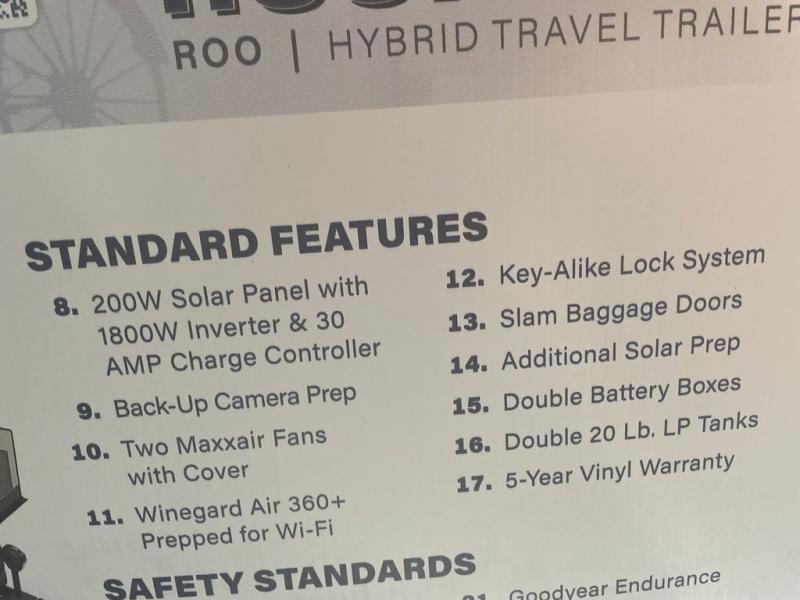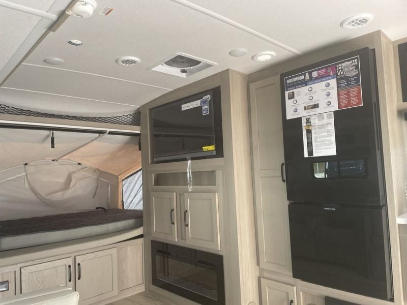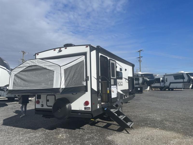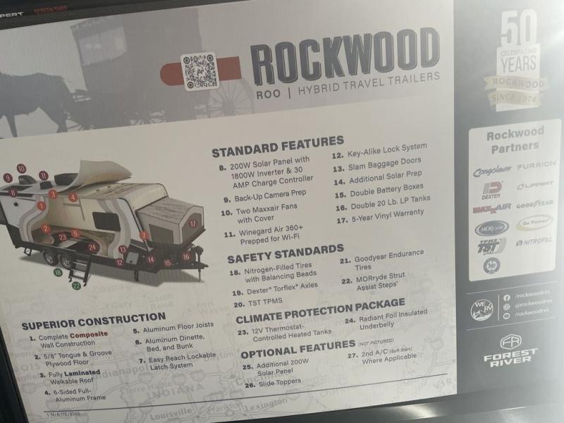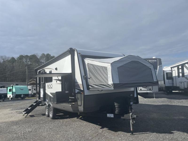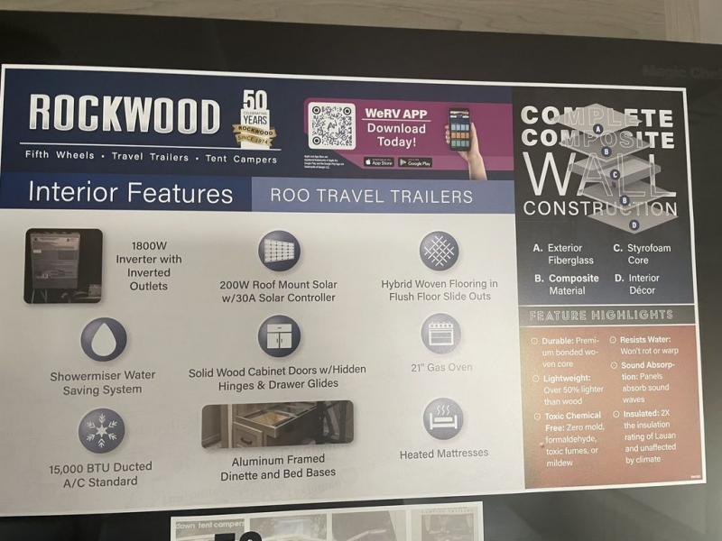 With any Rockwood Roo expandable travel trailer by Forest River you will enjoy smooth towing thanks to the torsion axle, Rubber-Ryde suspension, the easy lube axles and Nev-R-Adjust brakes. The key-Alike locks provide easy access in and out of your trailer, and each model includes prep for a Air 360+Omnidirectional antenna with WiFi for all your connection needs. Each model is constructed with a vacuum laminated one-piece roof and walls, an enclosed underbelly, and tinted framed windows for a more sleek look. You will enjoy many interior comforts, including hardwood cabinet doors and drawer fronts, night roller shades, a bunk/fan light combo with each bed, and much more!