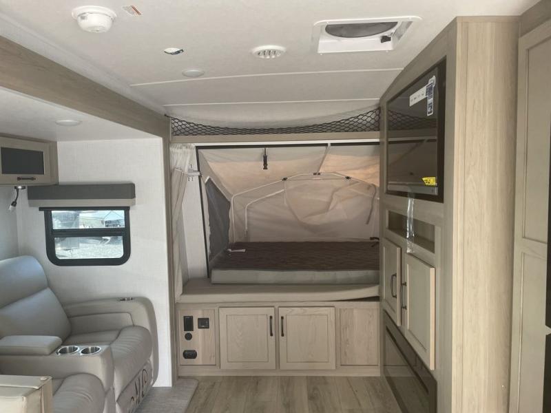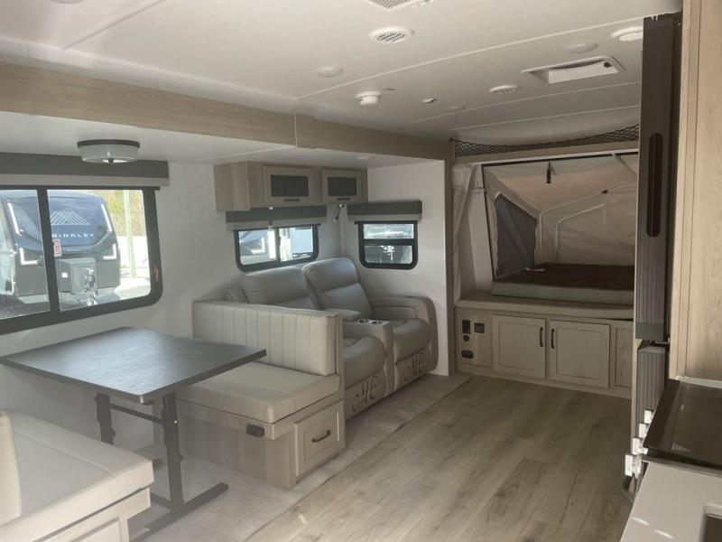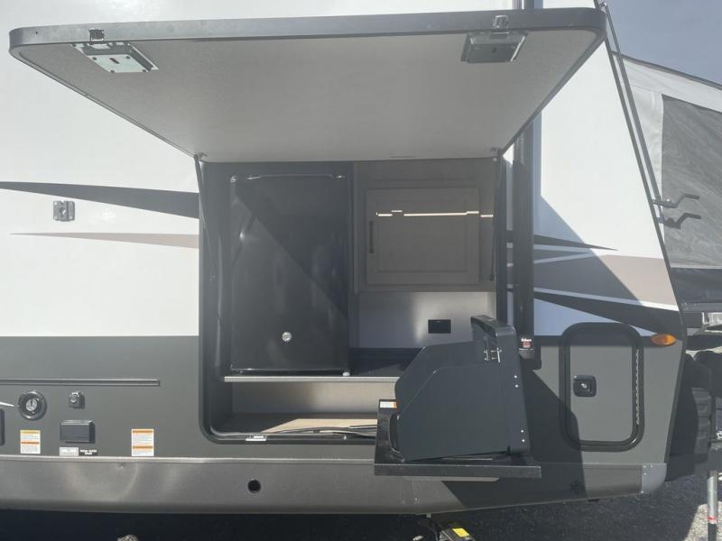 This expandable includes a large slide out that will make you feel right at home, so come take a look! The LED TV and fireplace is right across from the hide-a-bed sofa for easy viewing, and there is a booth dinette to dine together. The chef of the family can cook indoors on the three burner cooktop, or outdoors on the exterior griddle. Tuck your belongings in the overhead shelves, and snacks can go in the pantry. Don't forget about the exterior storage for your larger camp gear!