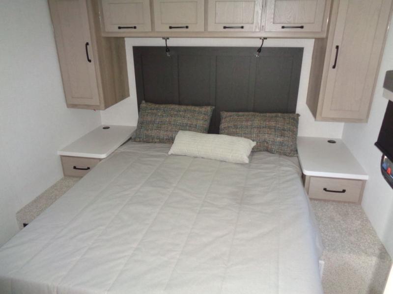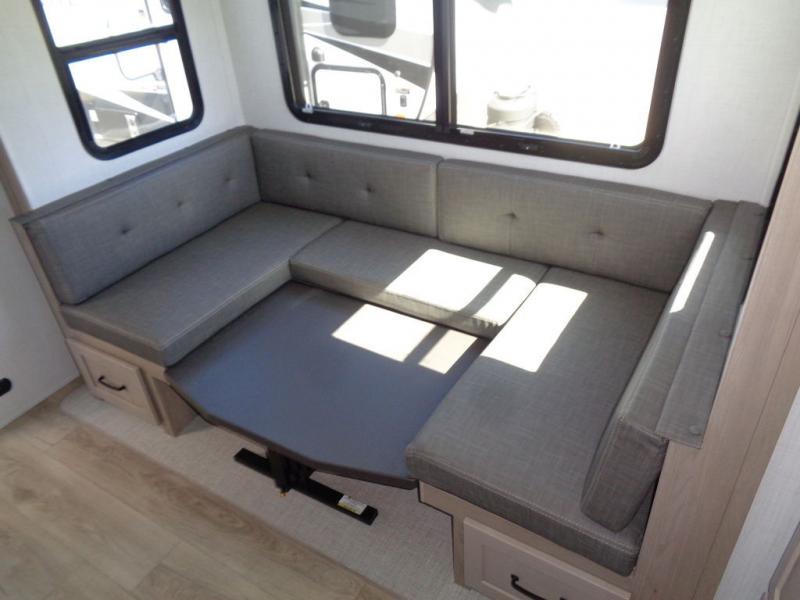If you like the front kitchen layout, you're going to love this one! You'll have plenty of counter space to prepare and cook meals, or you may just want to head outdoors to cook on the outside griddle. There is a 19' power awning with LED lights to keep you protected from the sun and rain, and there are three exterior storage compartments for lawn chairs, fishing poles, and firewood! This model includes a U-shaped dinette slide in perfect view of the 12V smart entertainment TV and fireplace, and this area can double as your guests' sleeping space at night. You'll stay comfortable in the rear bedroom that includes an RV queen bed, dual bedroom wardrobes, and an optional TV if you enjoy movies in bed!