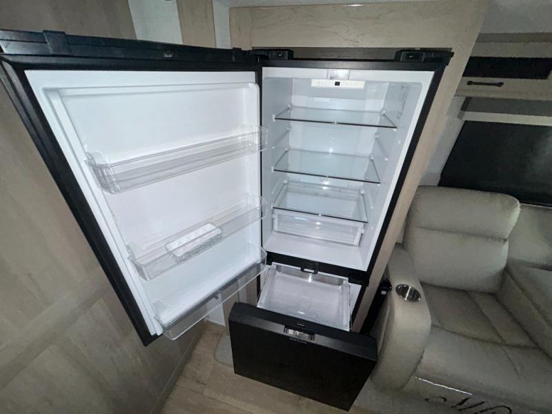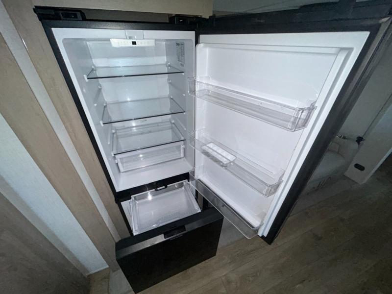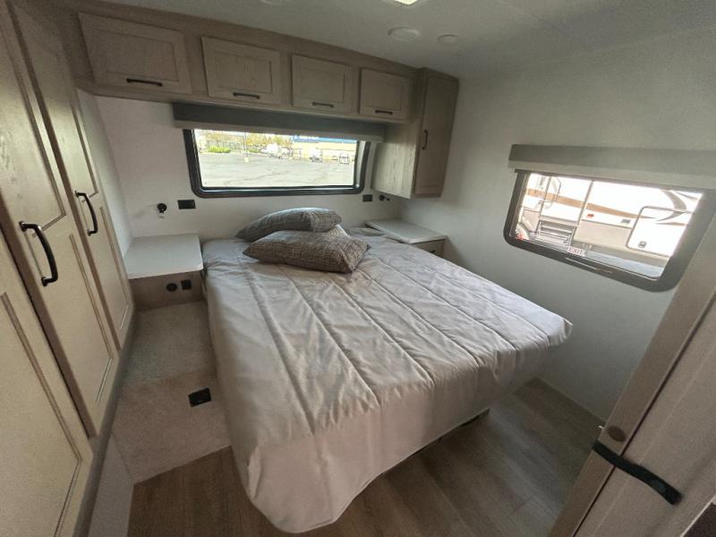 Camping trips to the lake just got sweeter with this dual slide out travel trailer in tow! Once you arrive, unload your gear from the exterior drop-frame pass-through storage, then start lunch on the exterior griddle. If you need a rest after traveling all day, the RV queen bed in the front bedroom is sure to give you comfort, or you can relax on the theater seating. The fireplace and entertainment center with a 32" TV will make this space feel just like home, and check out the spacious full rear bath for added privacy. This model also includes an entryway closet/pantry for jackets, shoes, and food!